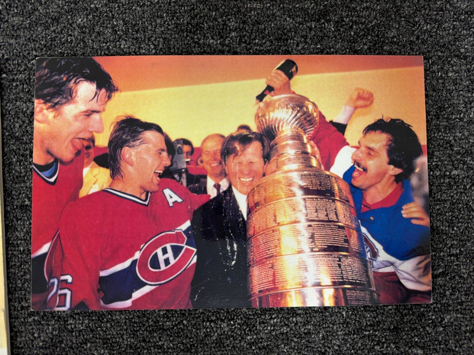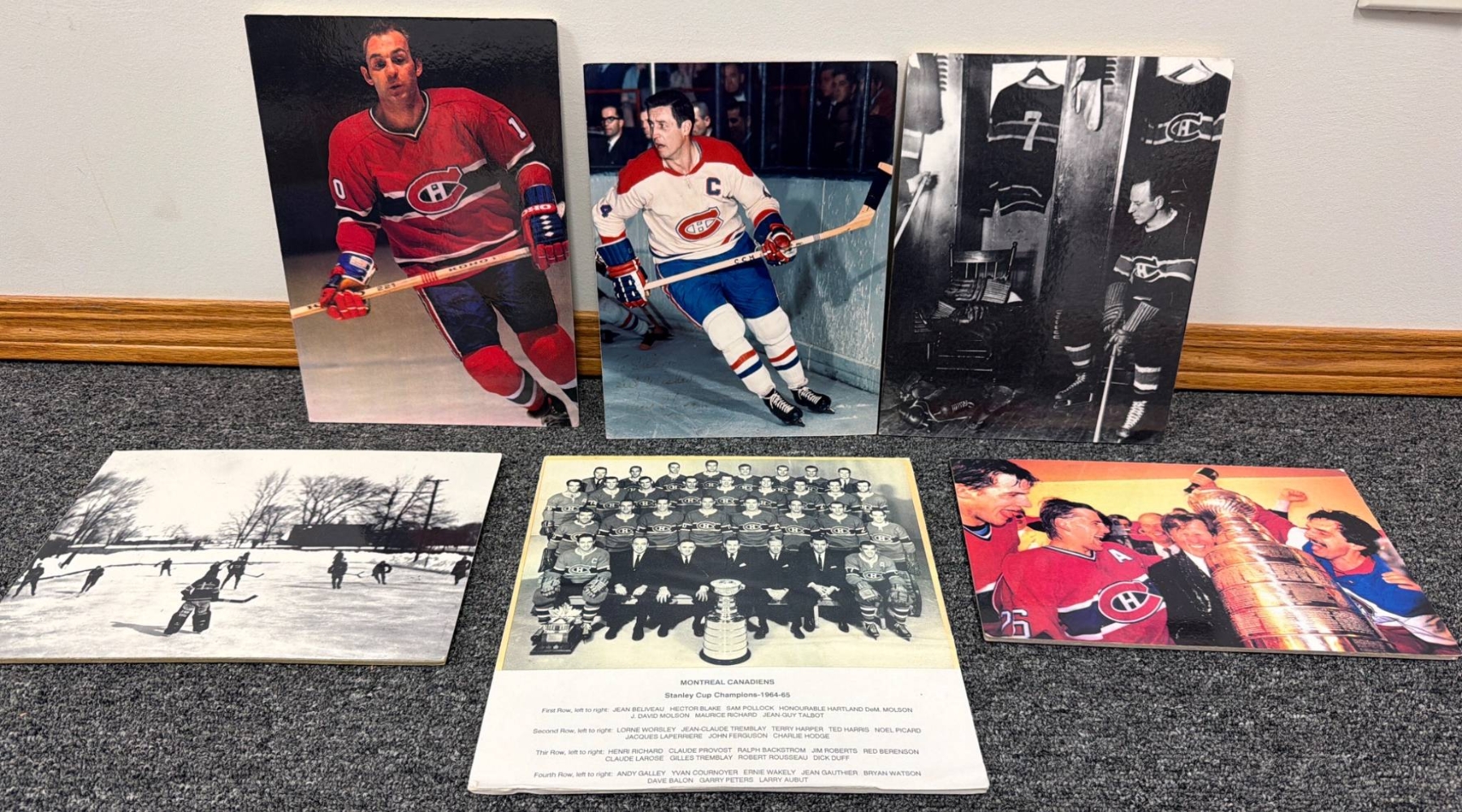 Montreal Canadiens-themed photographs and memorabilia, including team images, individual player portraits, and moments capturing iconic celebrations. The lot includes six pieces, each representing historical and cultural elements of one of hockey's most legendary franchises. Some items feature handwritten annotations, adding a personal and historic touch. Great for sports enthusiasts and hockey historians.