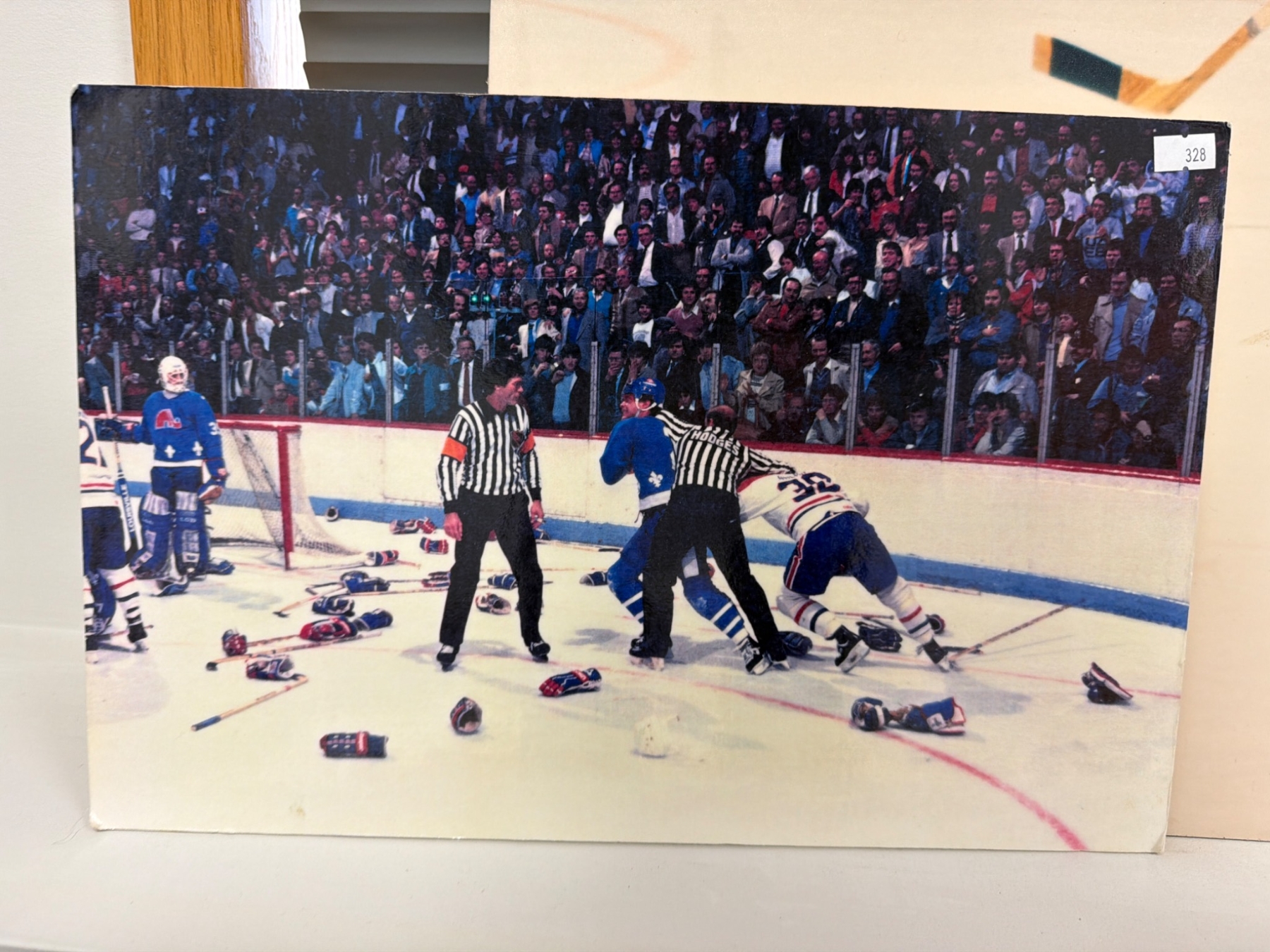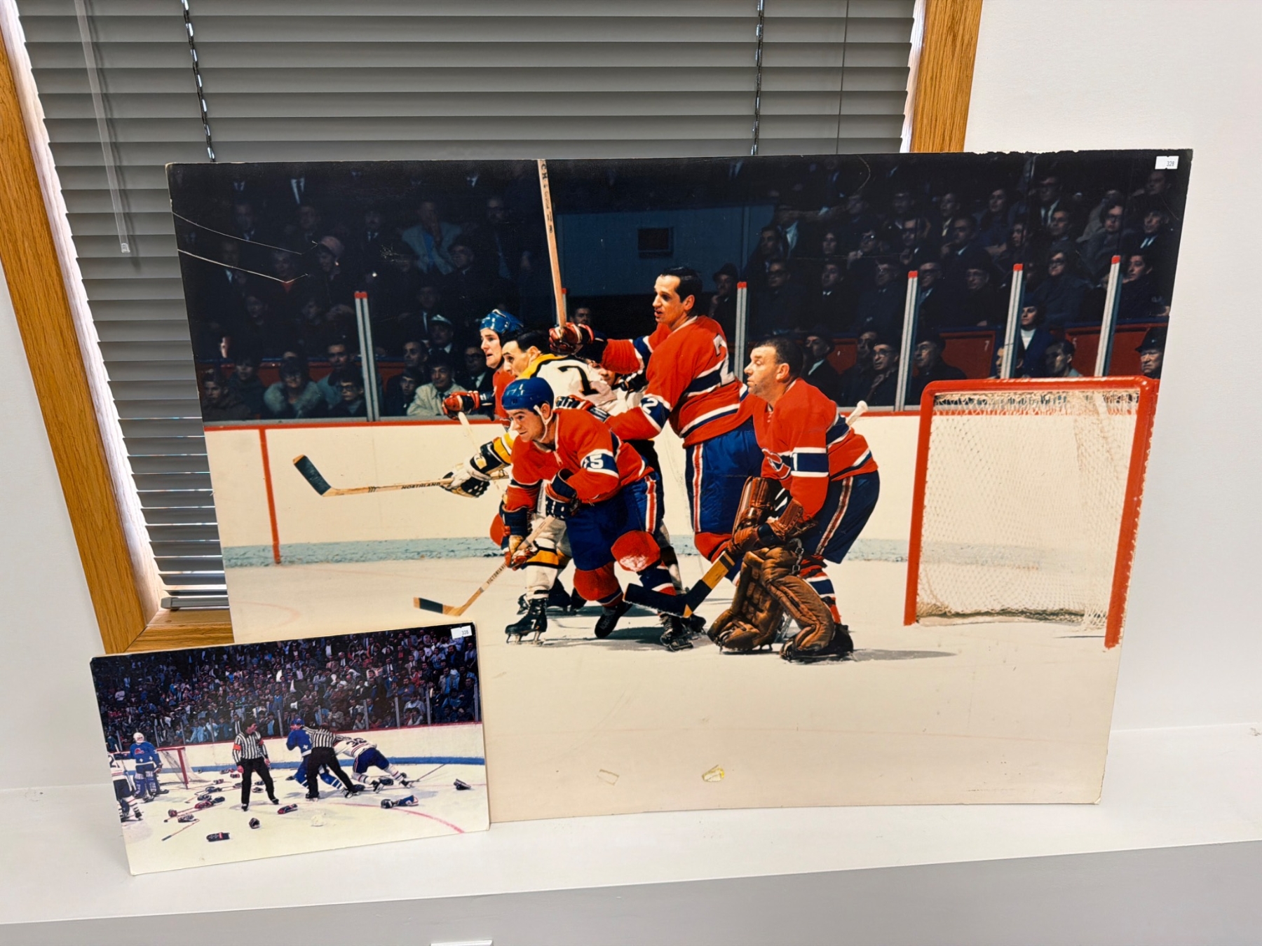 Large 40" x 30" print featuring a classic Montreal Canadiens hockey game moment, showcasing players in action on the ice, paired with a smaller complementary print capturing an intense in-game scuffle. Perfect for fans of the Canadiens or vintage hockey memorabilia. The larger print is an eye-catching centerpiece, and the smaller print adds additional charm to any hockey lover's space.