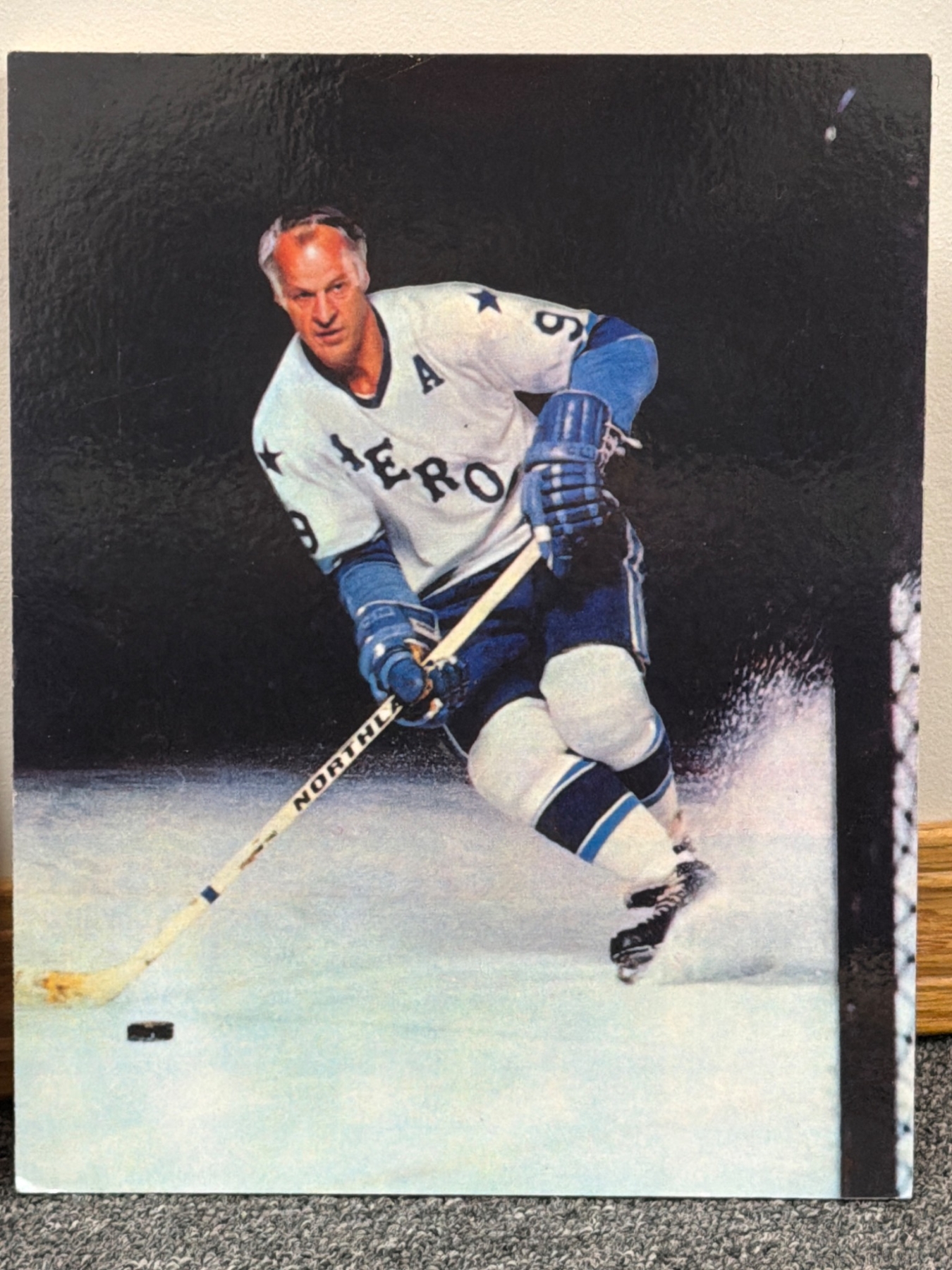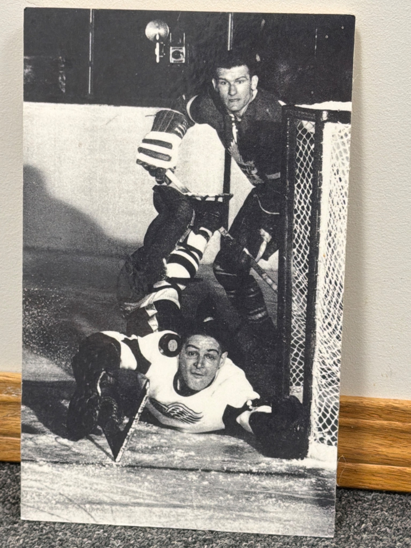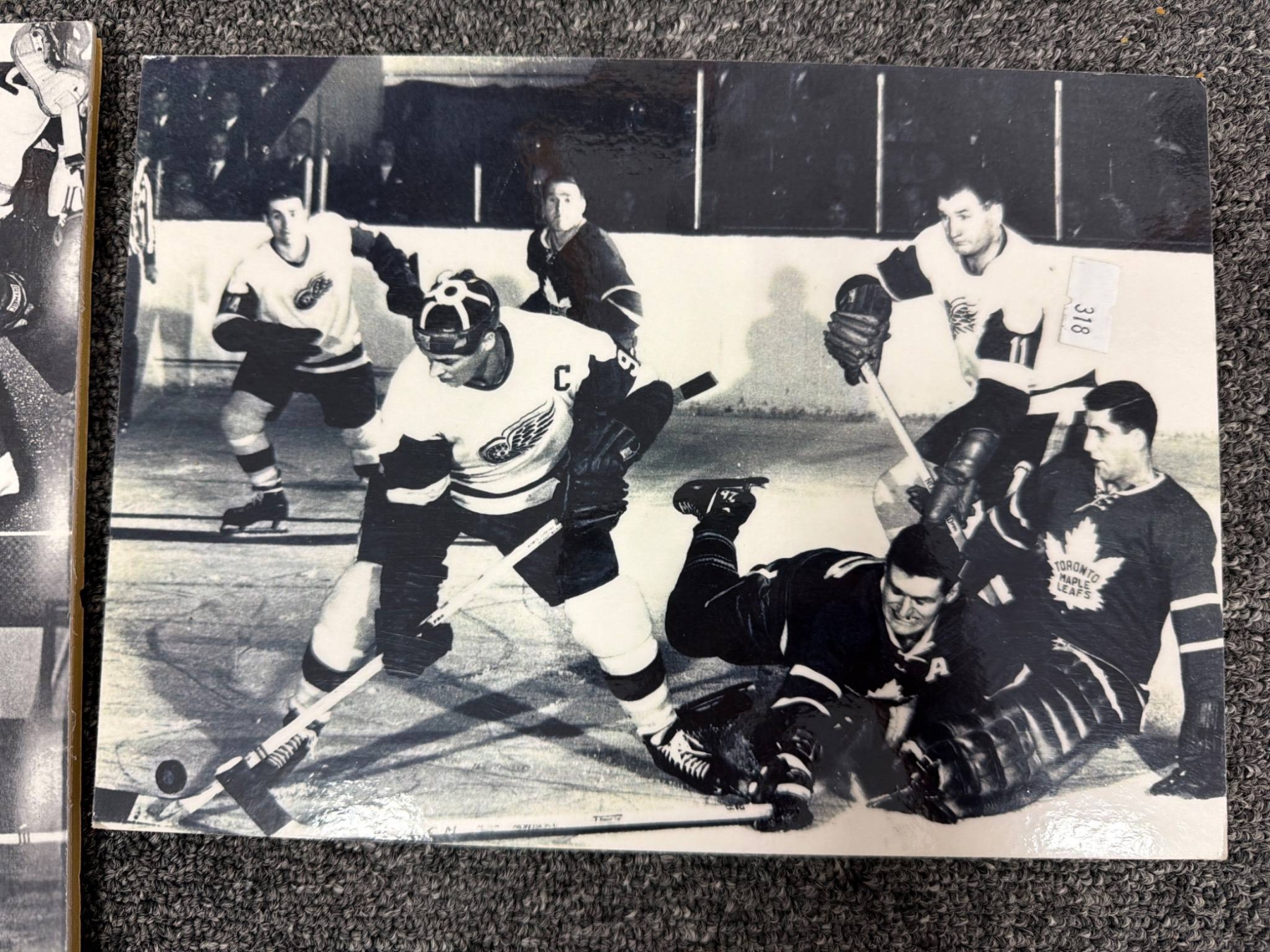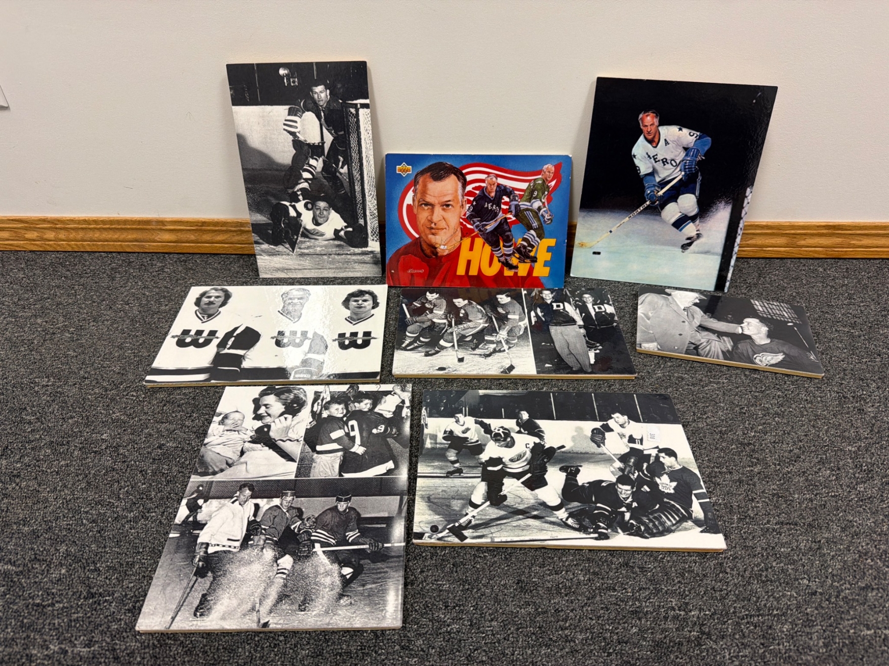 High-quality prints, including black-and-white and color photographs, highlighting iconic hockey moments and players. Lot features images of Gordie Howe in action, team photos, and scenes from classic games. One color print includes a prominent Gordie Howe autograph. Items are mounted on board and in overall good condition, ready to display.