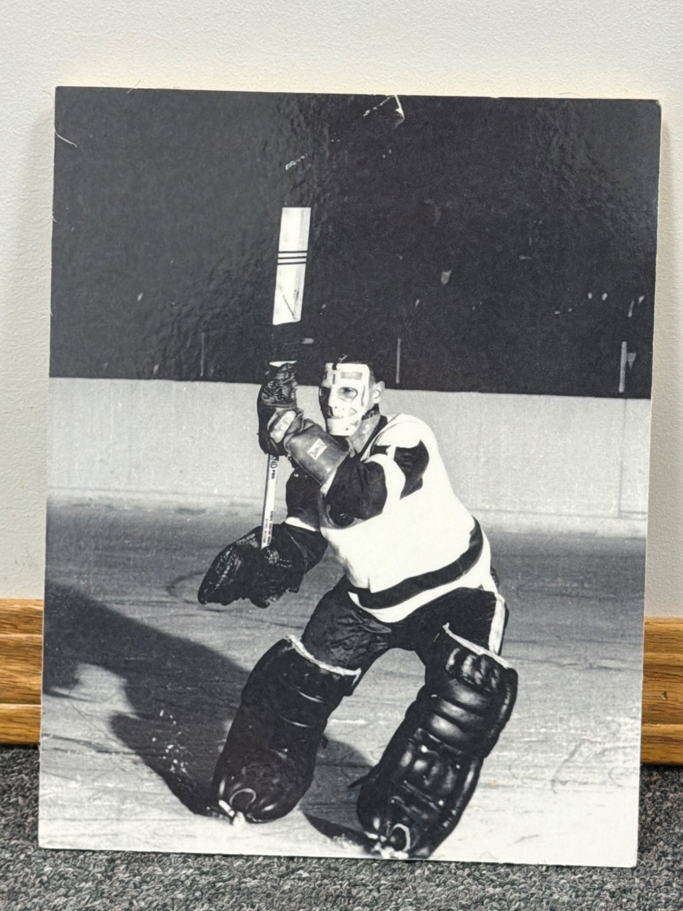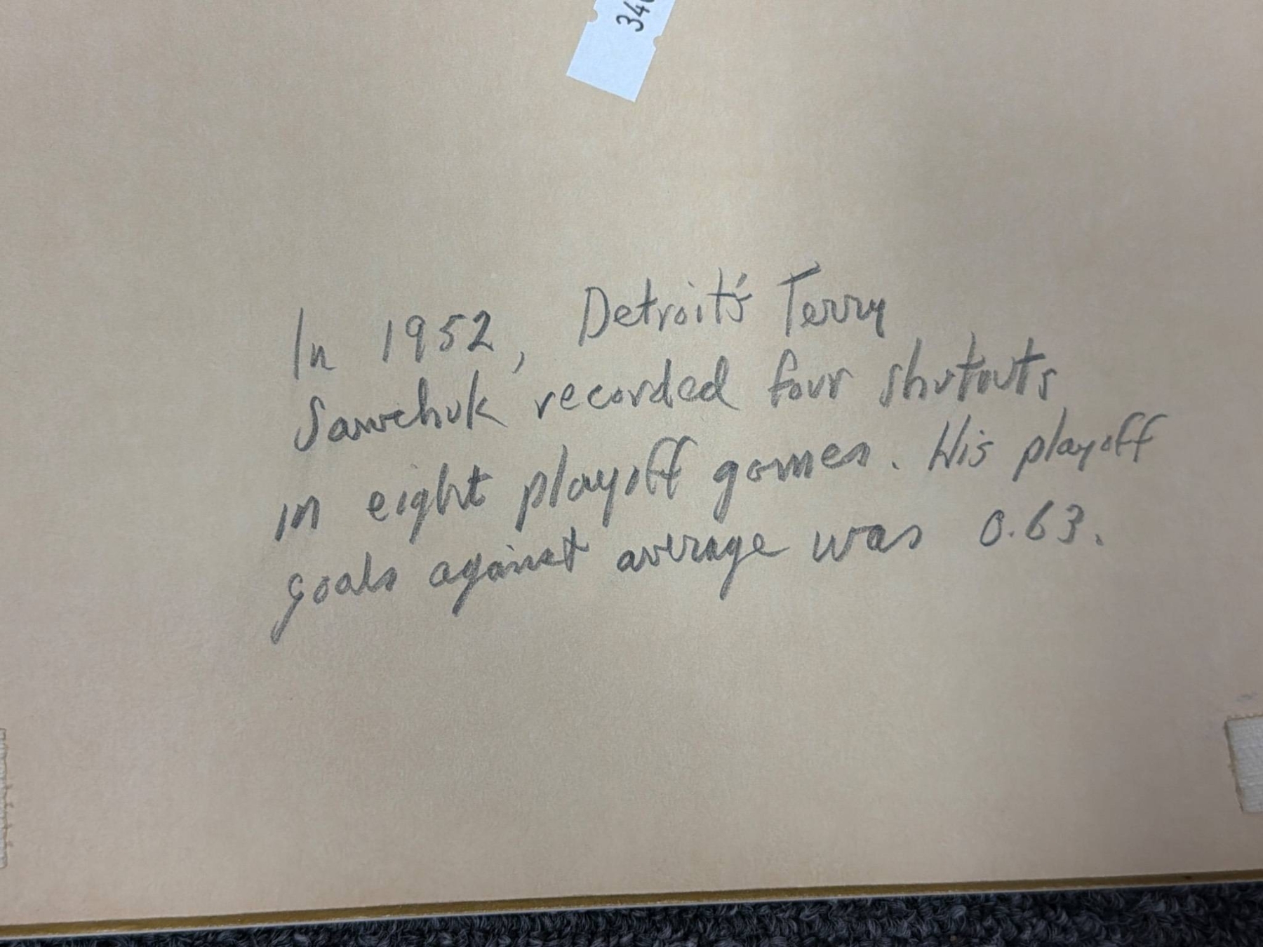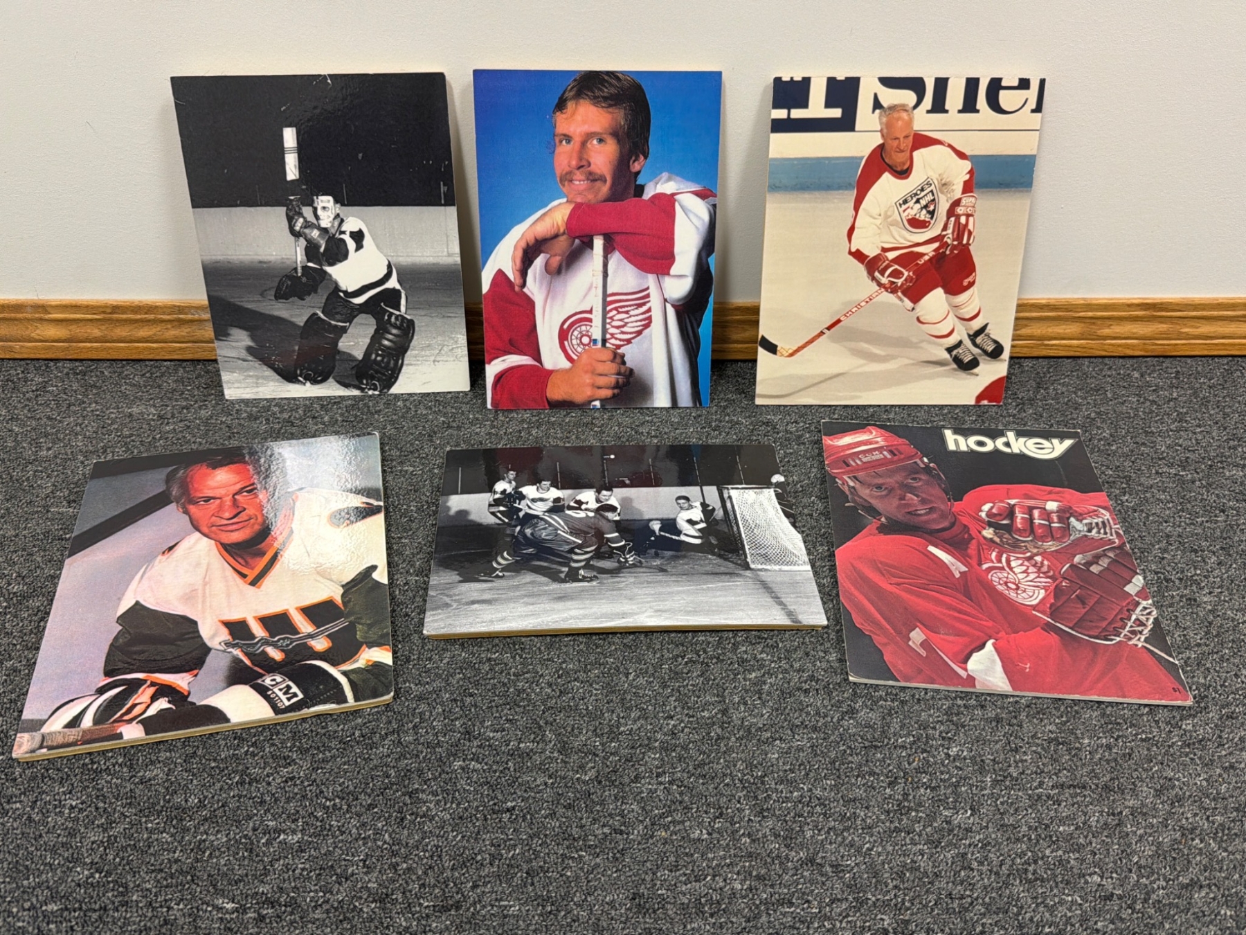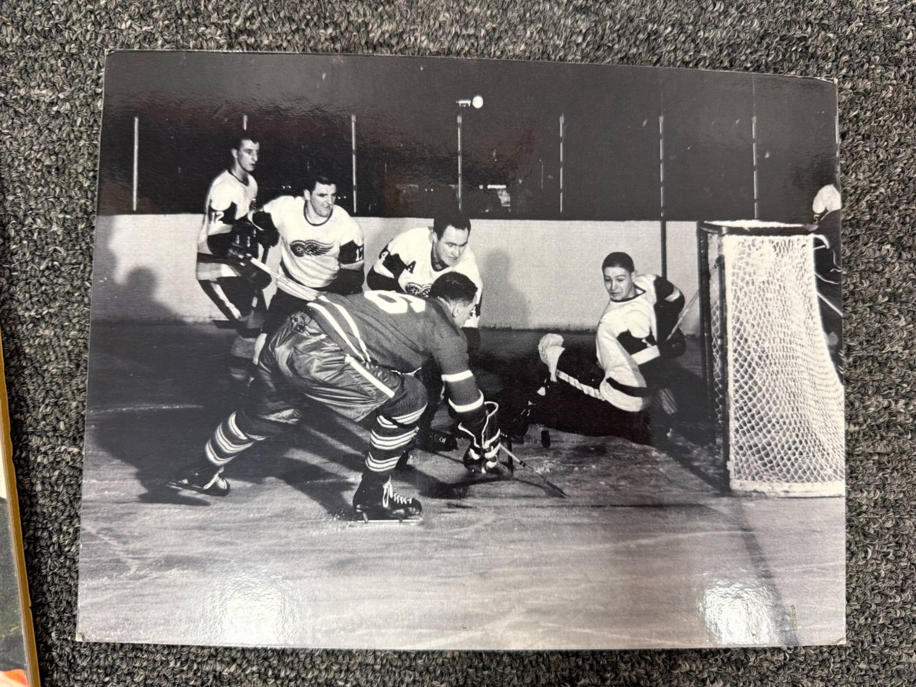 A unique collection of six hockey-related photos featuring players in action, team memorabilia, and historical details written on the back. These photographs include NHL iconography and highlight notable players, their achievements, and historical anecdotes. Perfect for hockey fans and collectors seeking nostalgic or historical sports content.