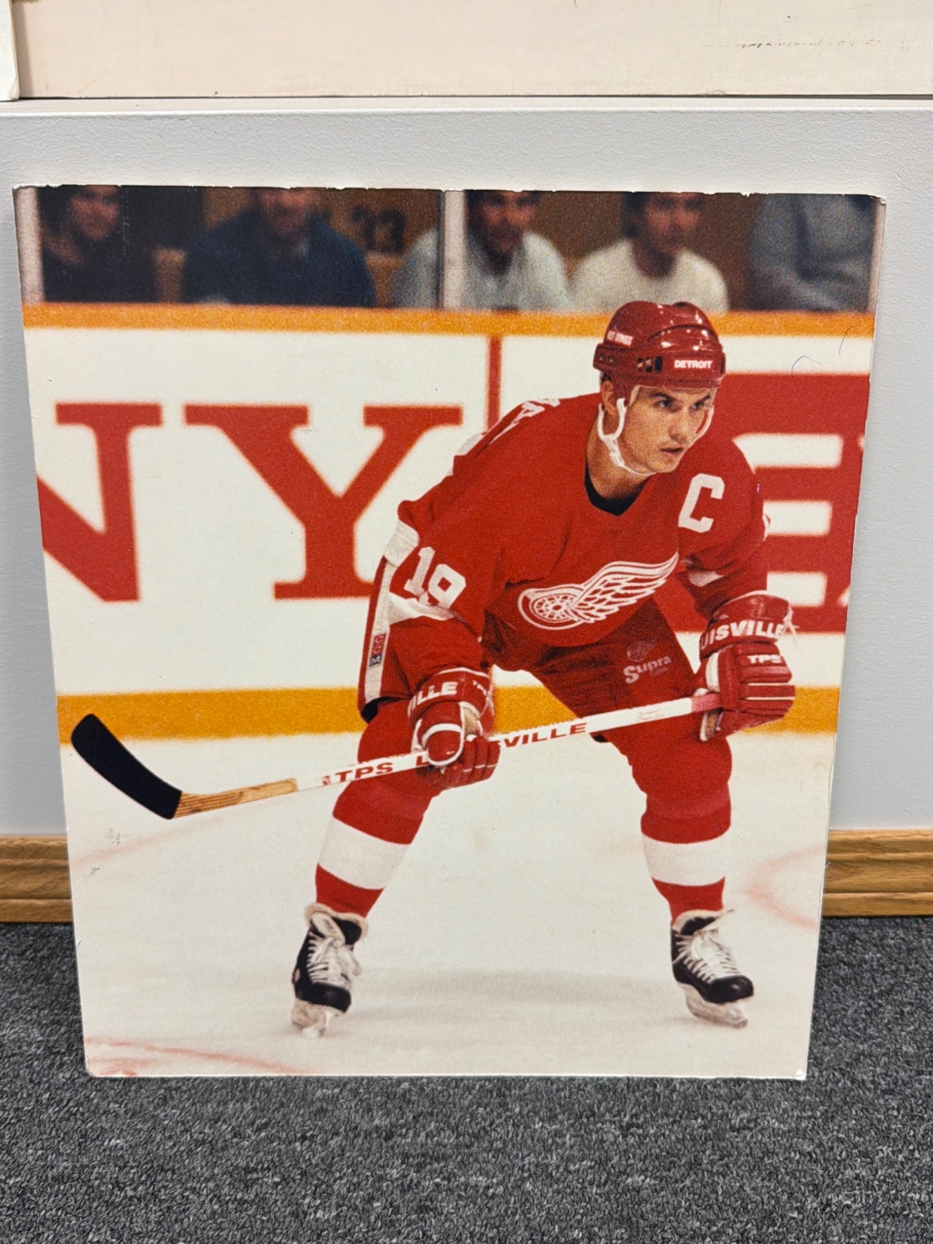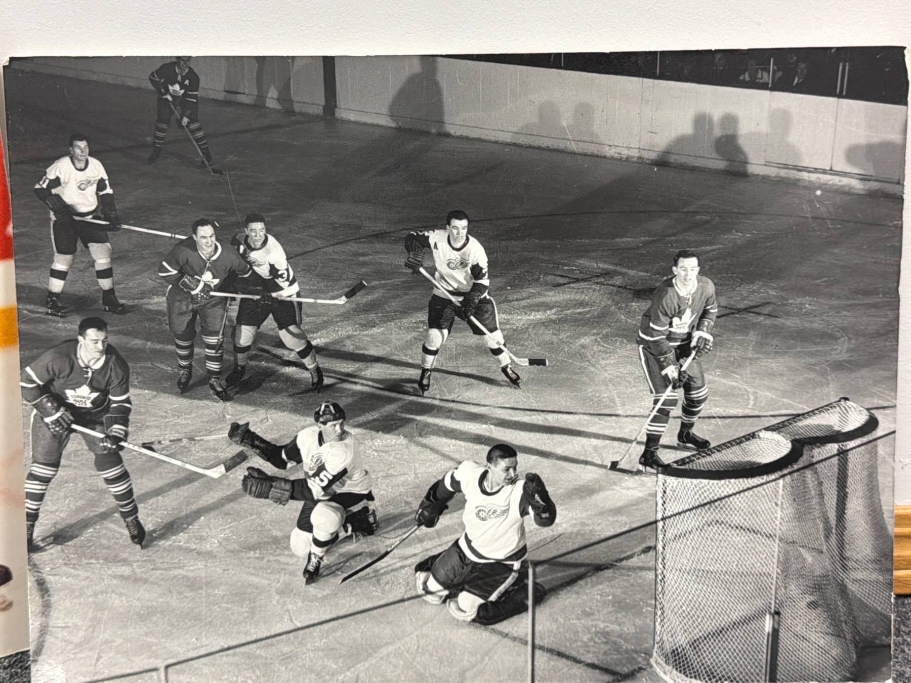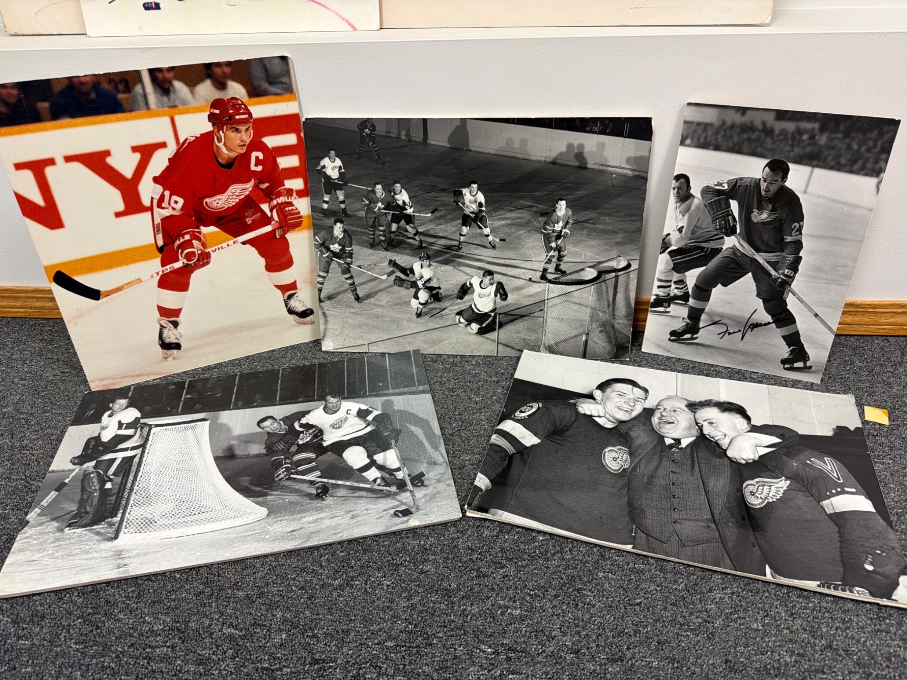 Dive into the spirit of Detroit hockey history with this lot of vintage Detroit Red Wings photographs. Includes an autographed image of a player in action, multiple black-and-white shots featuring game moments and team celebrations, and a vibrant color photo of a team captain. Authenticated with handwritten notes on the reverse of some prints. Ideal for fans and collectors alike.