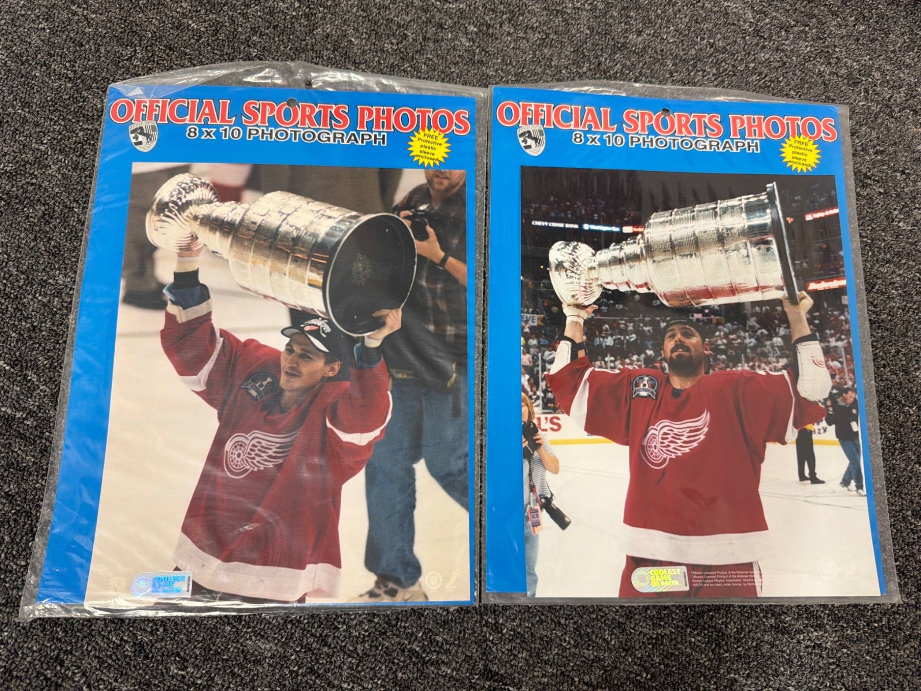Two officially licensed 8x10 photographs featuring Detroit Red Wings players celebrating their Stanley Cup victory. Each photograph showcases iconic moments with the Stanley Cup trophy, printed with high-quality imagery. The items are sealed in original packaging, ensuring their pristine condition. A great addition for Red Wings fans and sports memorabilia collectors.