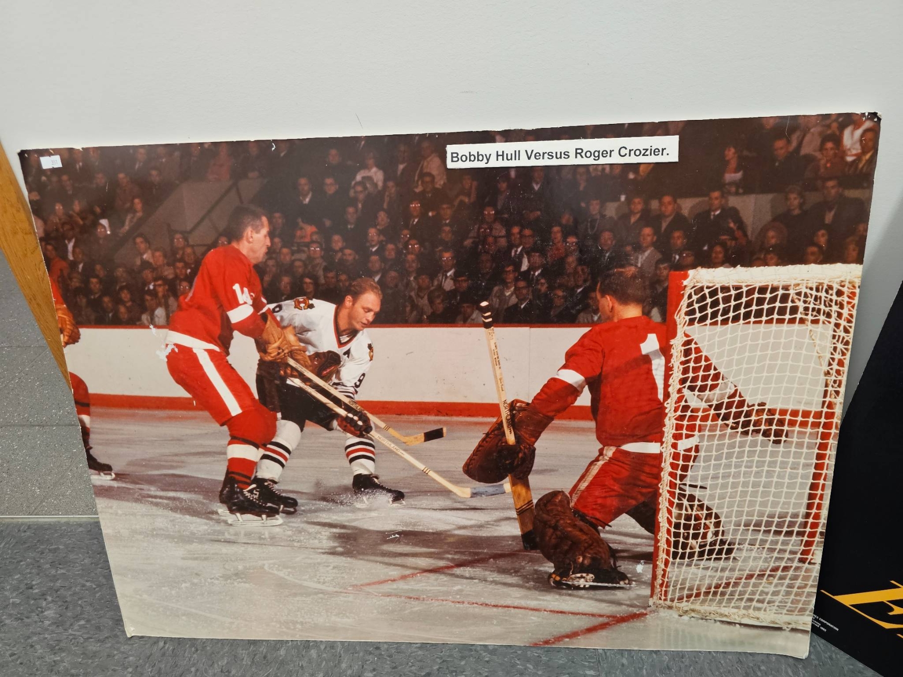 Framed photograph featuring Bobby Hull in action against Roger Crozier, capturing an iconic moment in hockey history. The white frame highlights the image, with an inner red border enhancing its vivid display. An additional large photographic poster of the same moment is included, making this perfect for hockey enthusiasts or collectors.