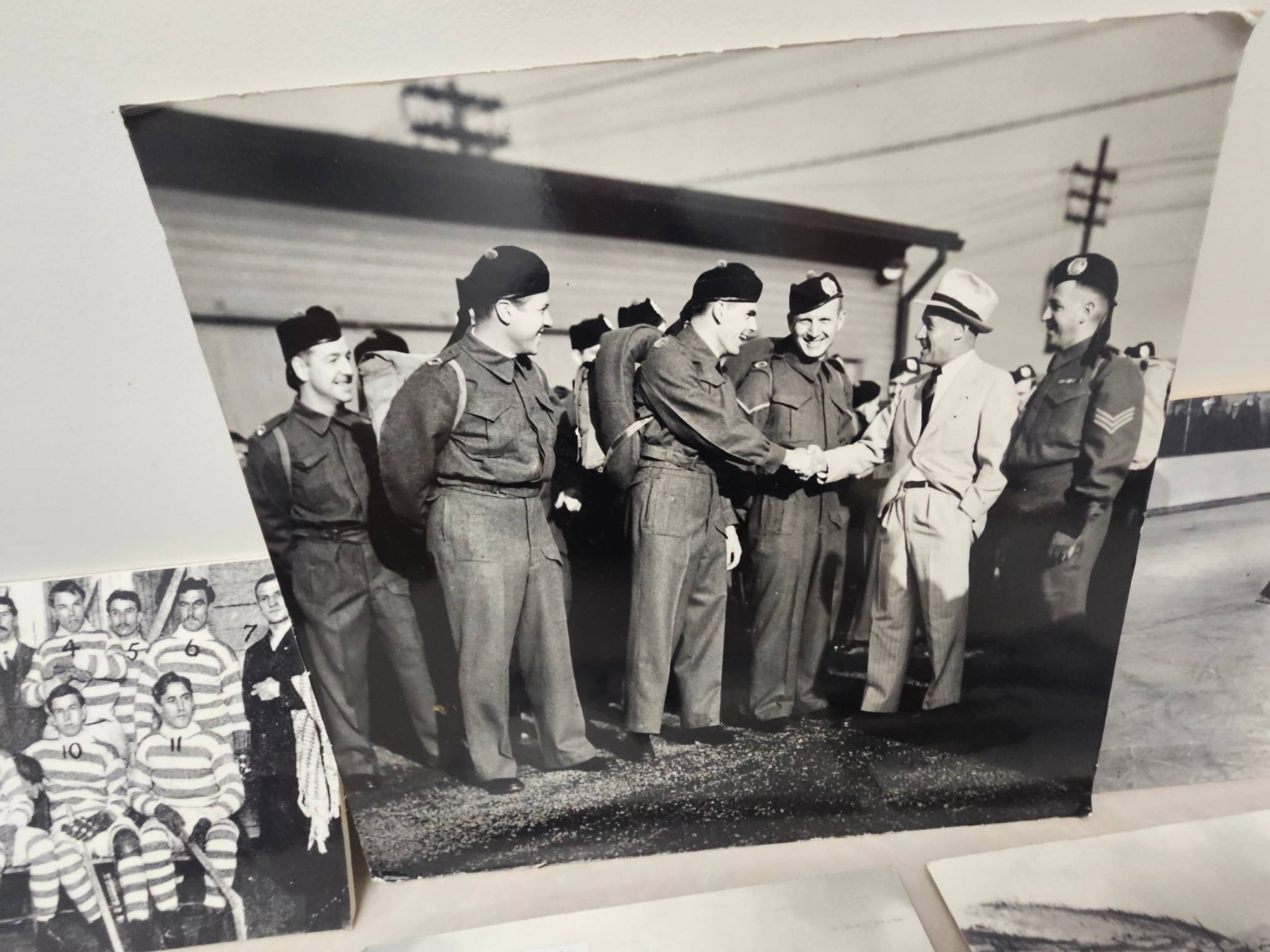Five black-and-white historical photographs depicting a range of scenes, including ice hockey games, team portraits, and a military gathering. These images highlight both early hockey and wartime camaraderie, capturing moments of shared history and sporting spirit. Suitable for collectors of sports memorabilia or historical photography.