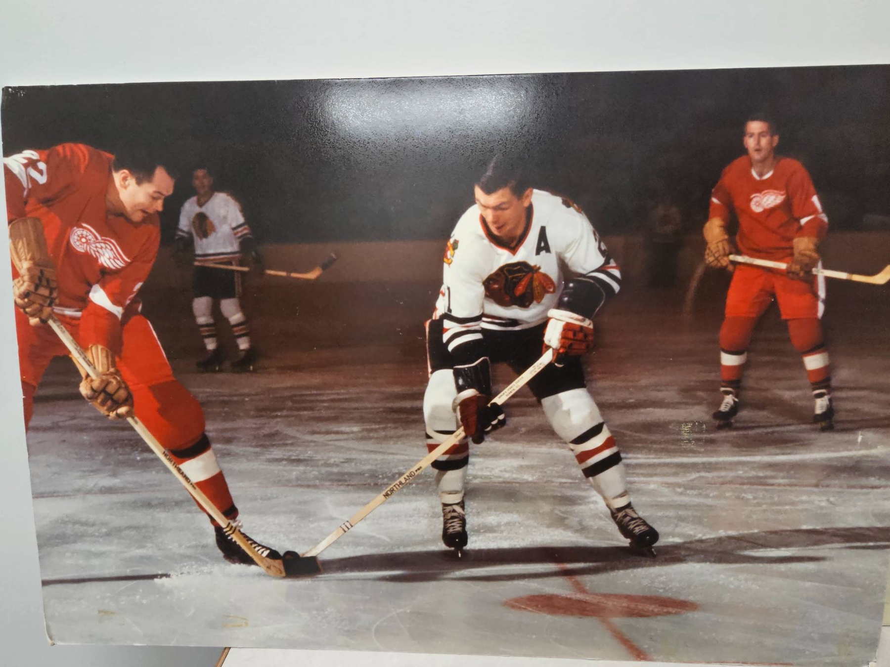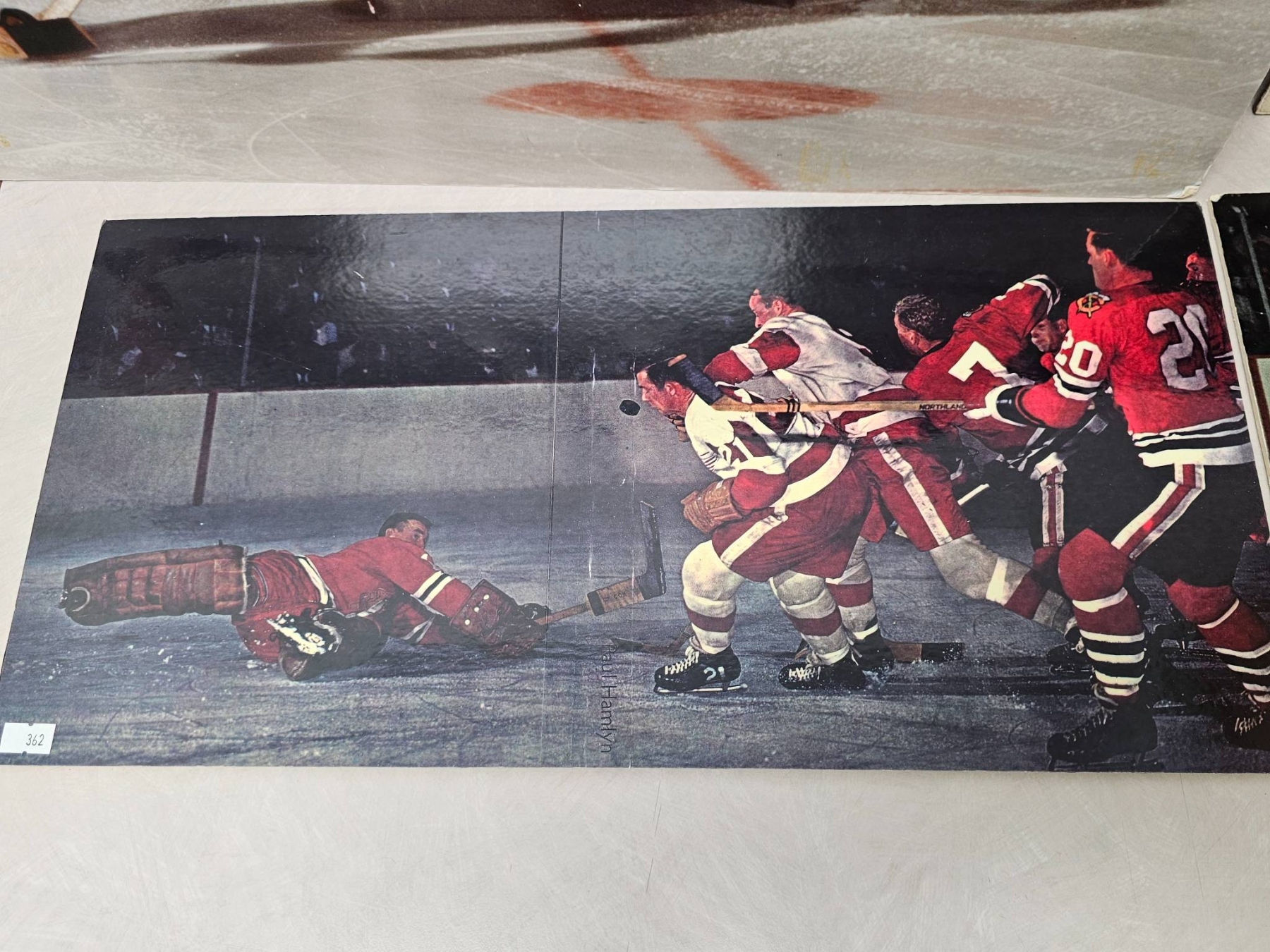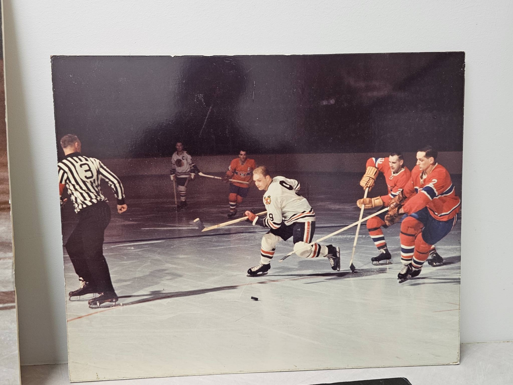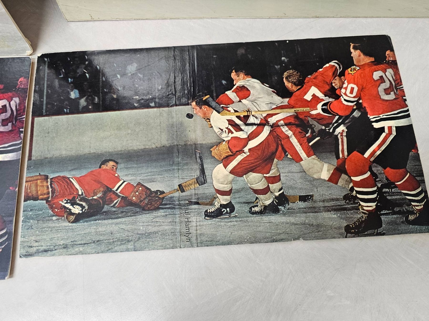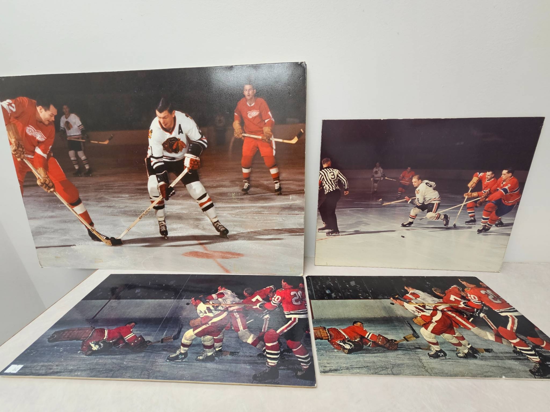 Four vintage ice hockey action photographs capturing intense moments from games featuring players in iconic jerseys, including Chicago and Detroit teams. These prints are mounted on sturdy boards, with sharp details highlighting the dynamism of the sport. Perfect for sports enthusiasts or collectors of vintage hockey memorabilia.