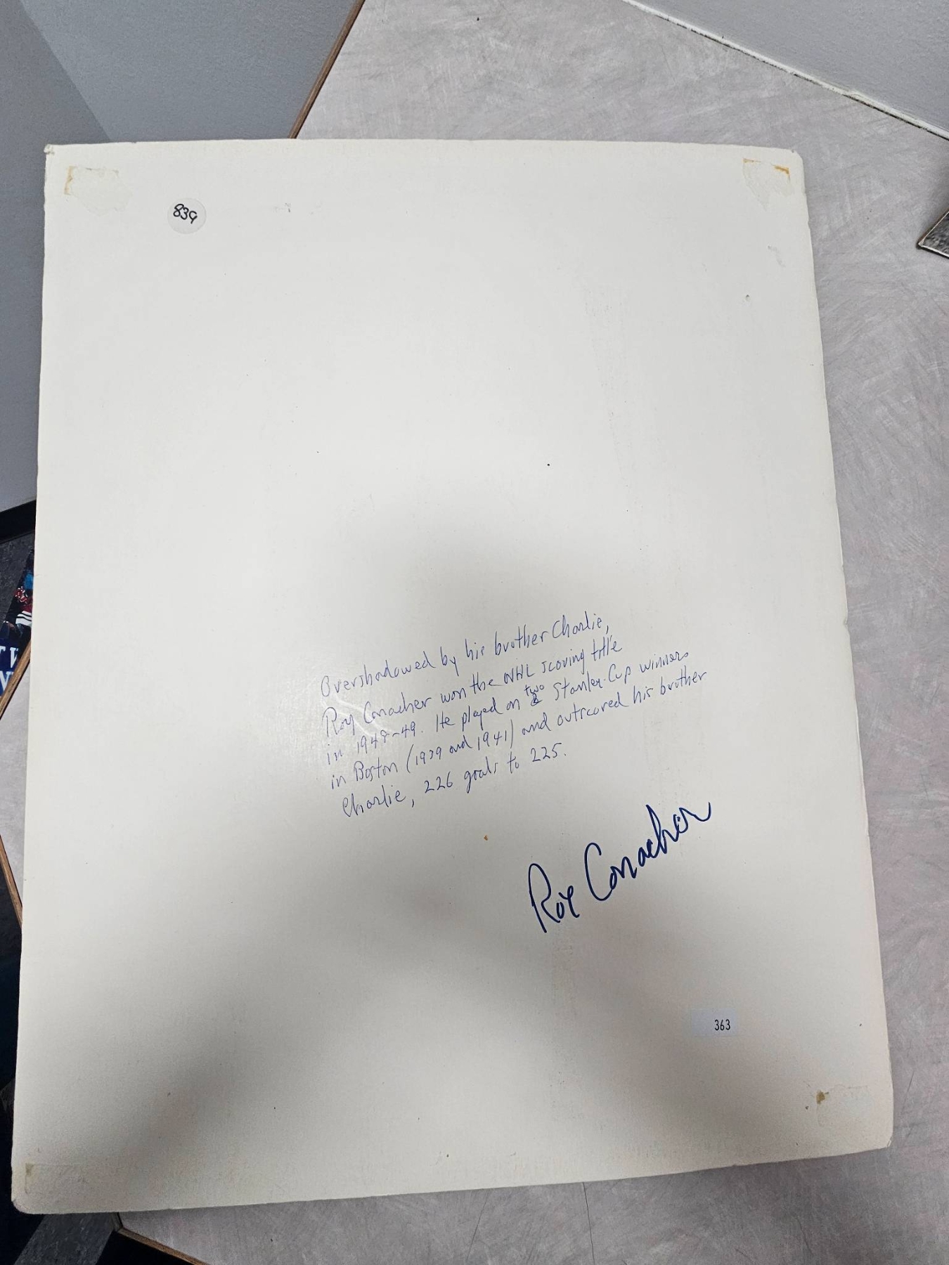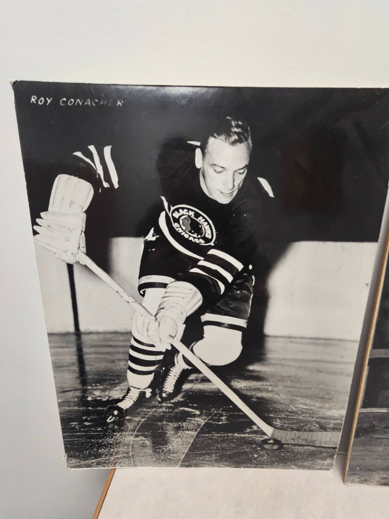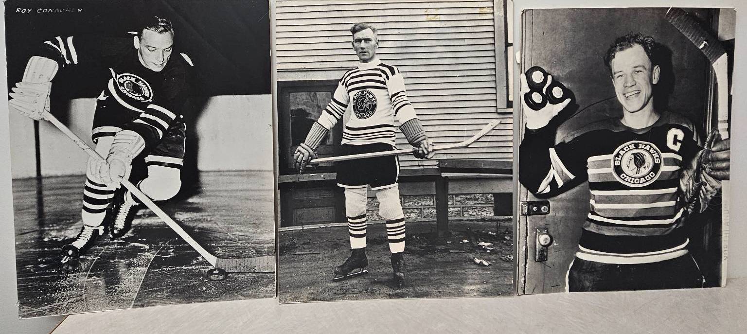 Three black-and-white photographs featuring Chicago Blackhawks players, including Roy Conacher and others. Prints show players in action and posed settings, showcasing vintage uniforms and hockey gear. One photo includes autograph markings and informative text about the depicted player, adding historical insight. Condition consistent with older prints, including minor wear.