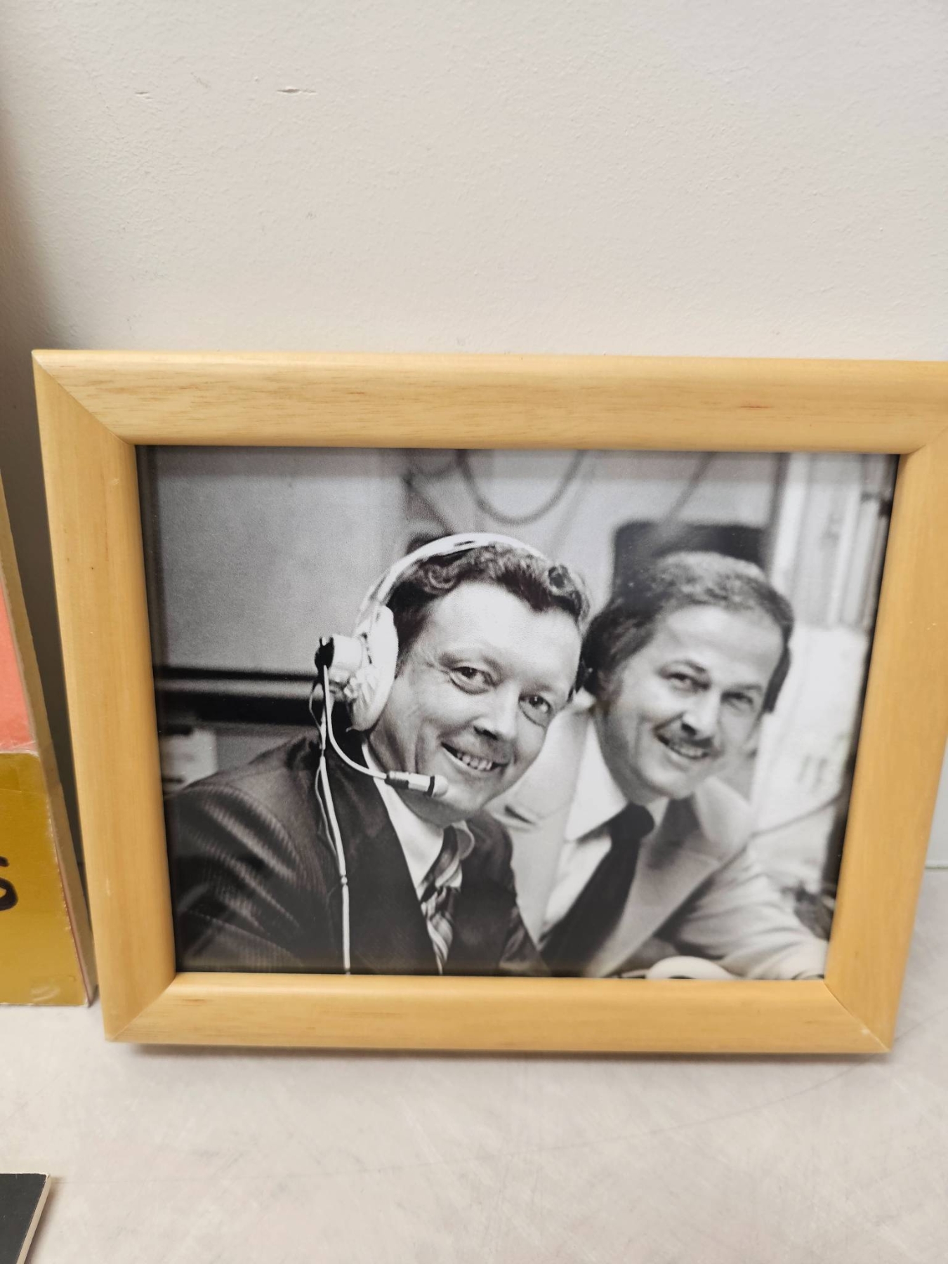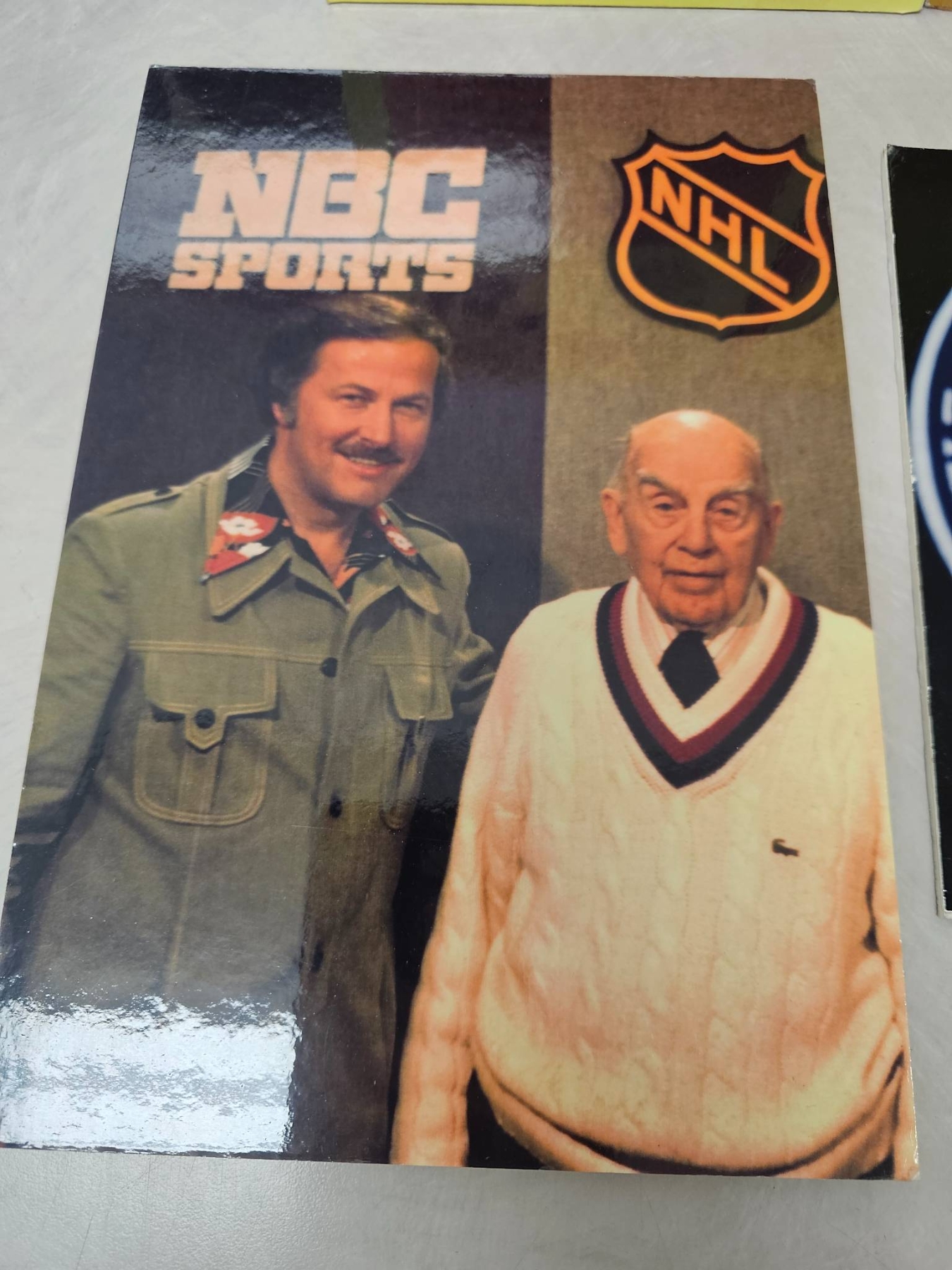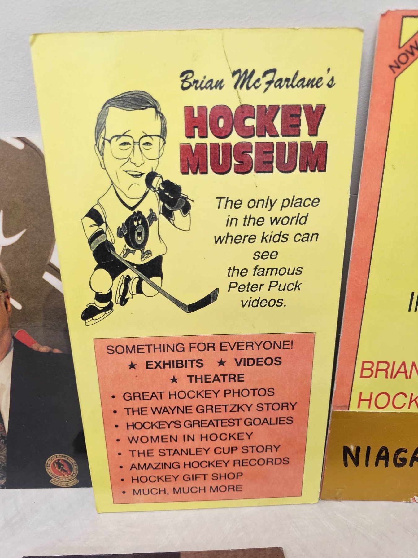 Brian McFarlane hockey memorabilia, including various photographs and promotional items. Highlights include a framed black-and-white photo, colorful posters promoting his Hockey Museum, and images from his association with NBC Sports and the Hockey Hall of Fame. Perfect for hockey history enthusiasts and collectors.