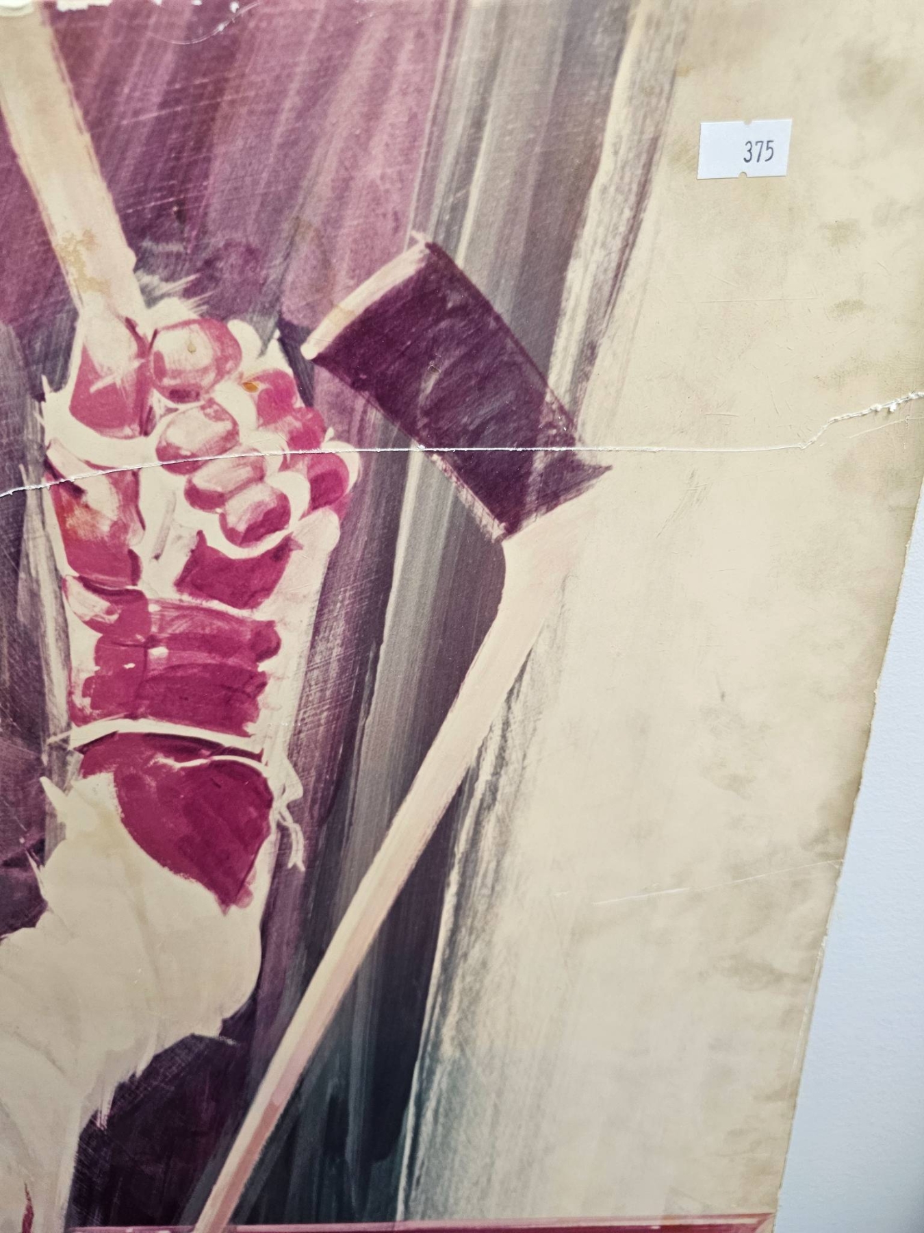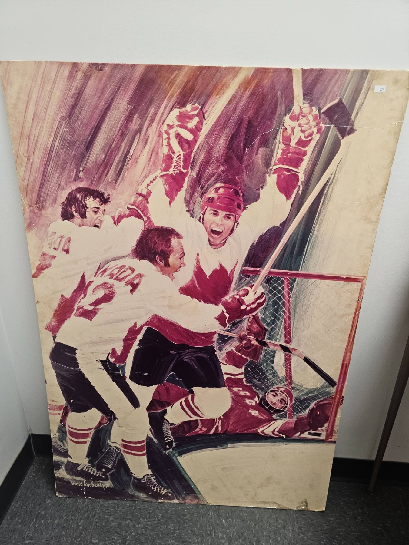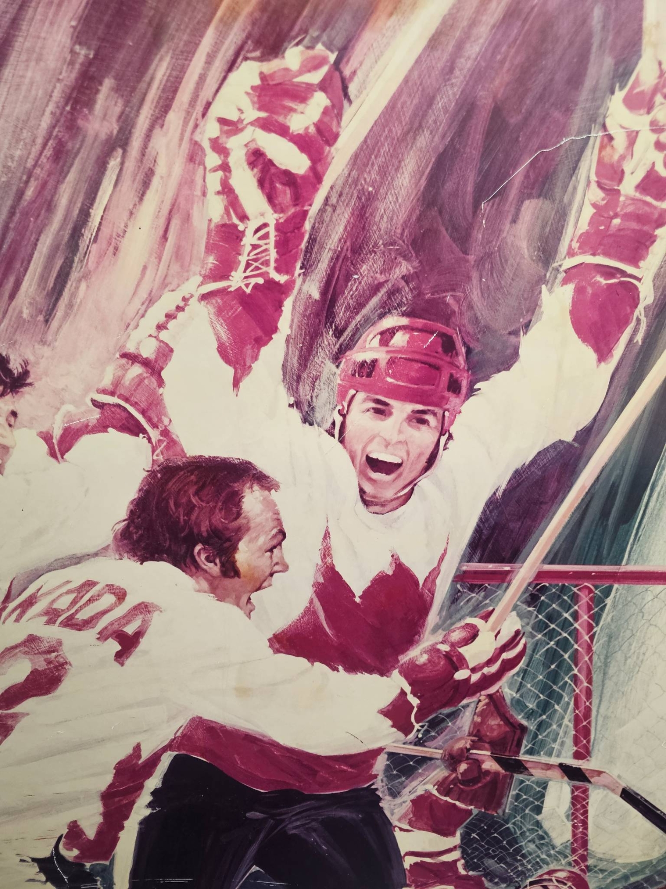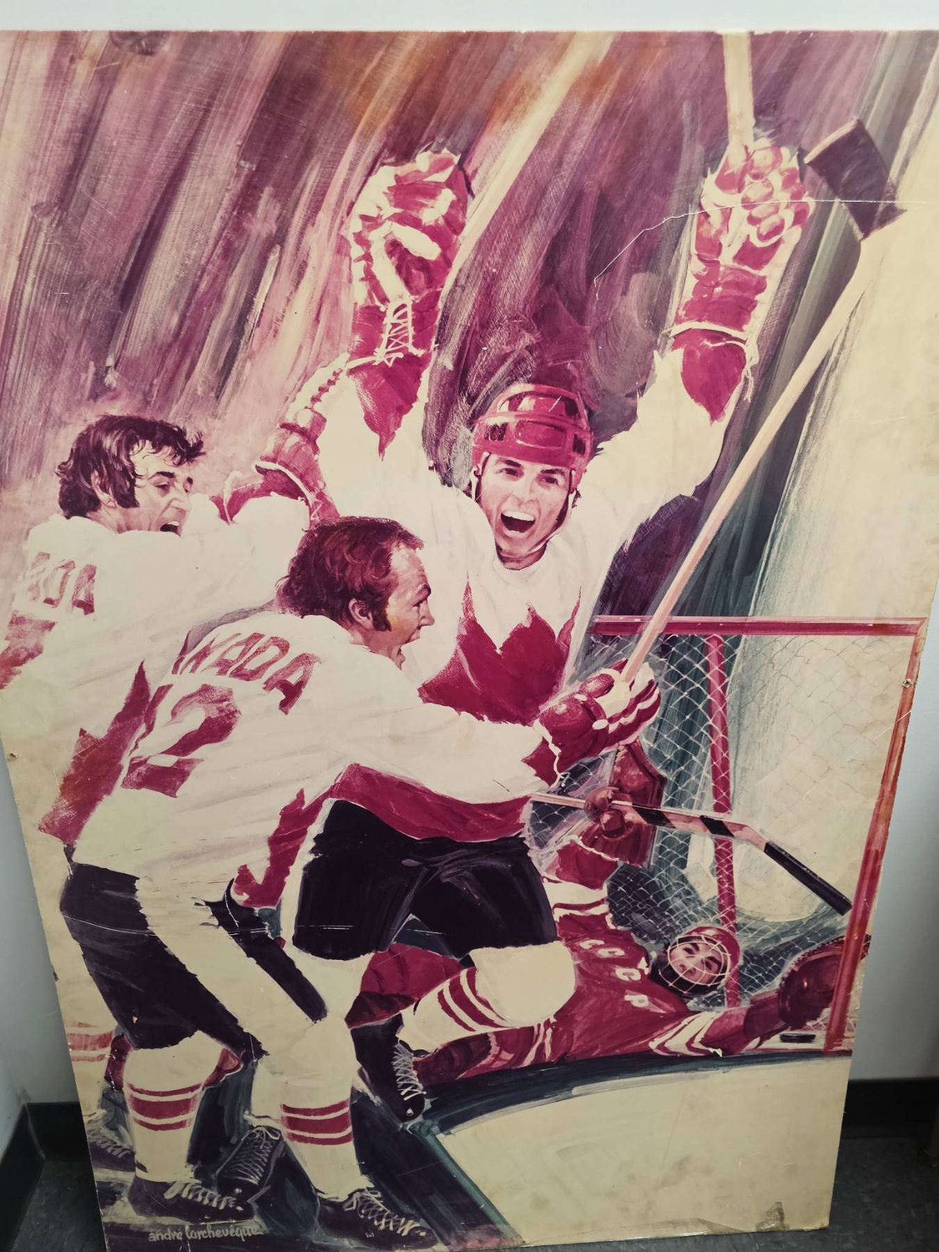 Large artistic depiction of a classic hockey moment, featuring players in white and red uniforms celebrating near the net. The artwork vividly captures the energy of the sport. Signs of wear and aging, including visible creases, are present on the surface, adding character to the piece. A captivating addition for hockey enthusiasts or collectors.