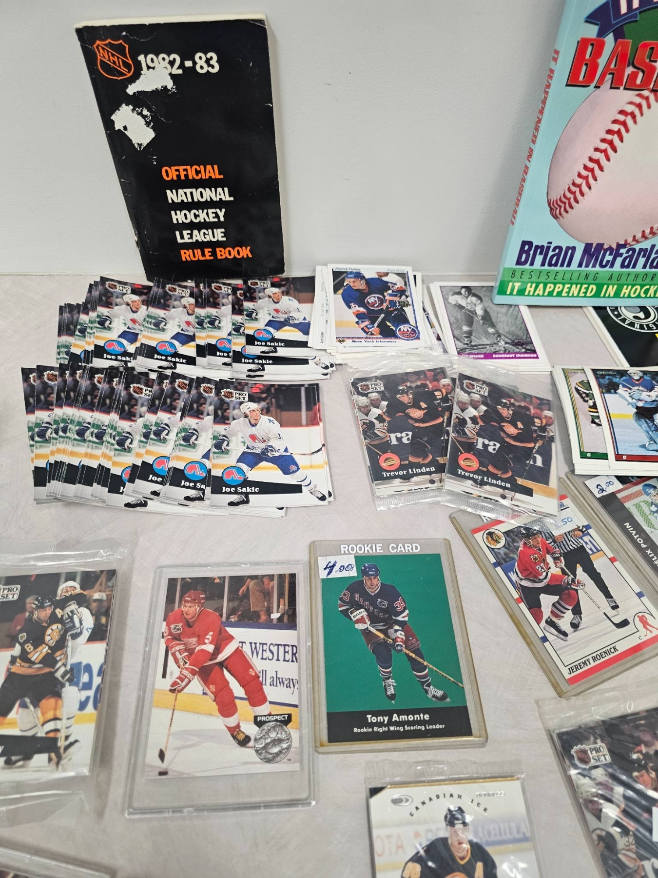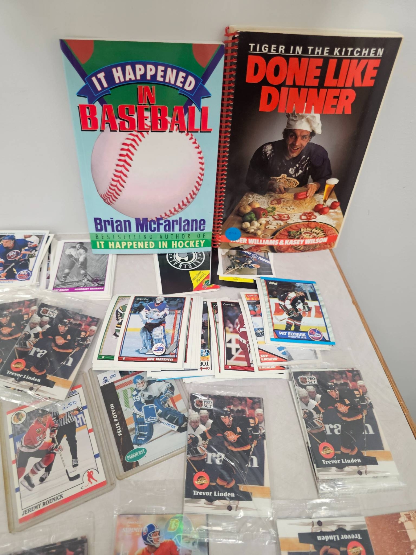 Extensive collection featuring sports trading cards, primarily hockey-themed, alongside books related to hockey rules, baseball, and sports dining. The cards include various players, styles, and conditions, with some cards in protective cases. A unique set for sports enthusiasts, collectors, or fans of hockey history and culture.