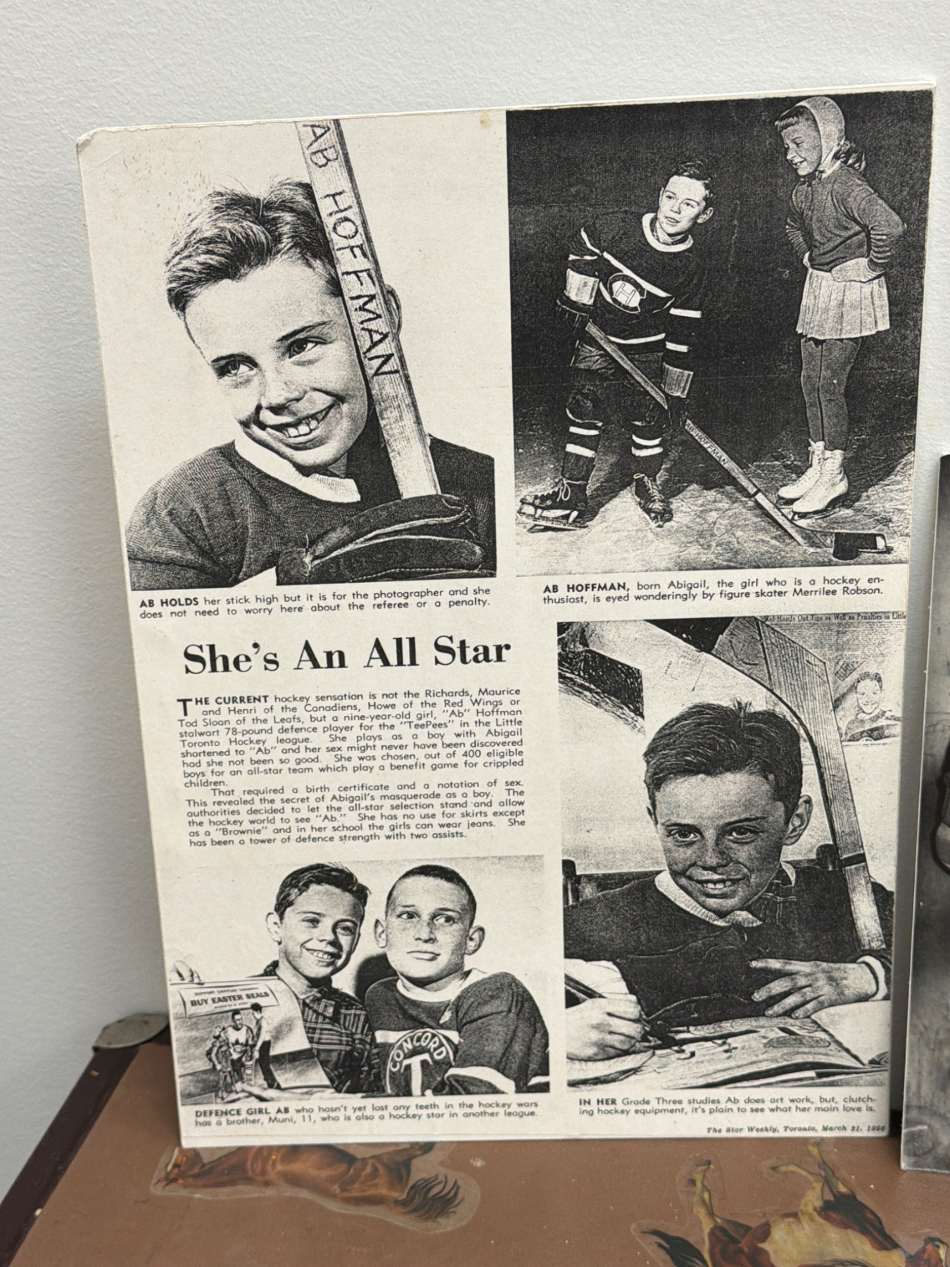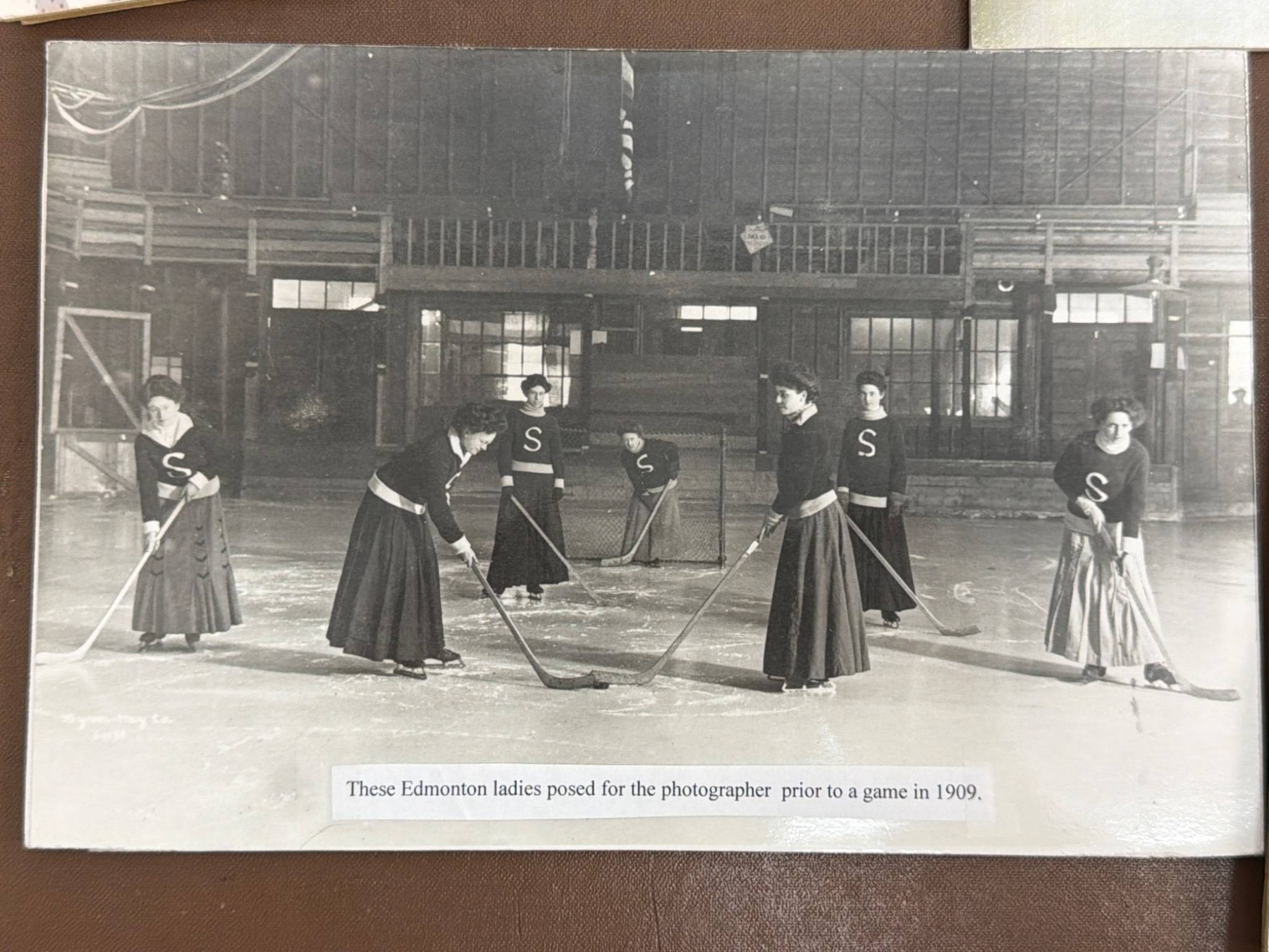 A unique assortment of ice hockey-related photographs and memorabilia, featuring historic images of women's hockey teams and players, including action shots, team portraits, and candid moments. Highlights include depictions of early 1900s women's hockey, classic skater uniforms, and a nod to the Preston Rivulettes. Ideal for sports history enthusiasts and collectors of vintage sports imagery.