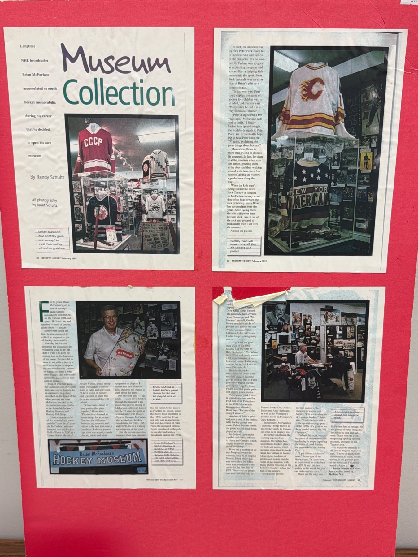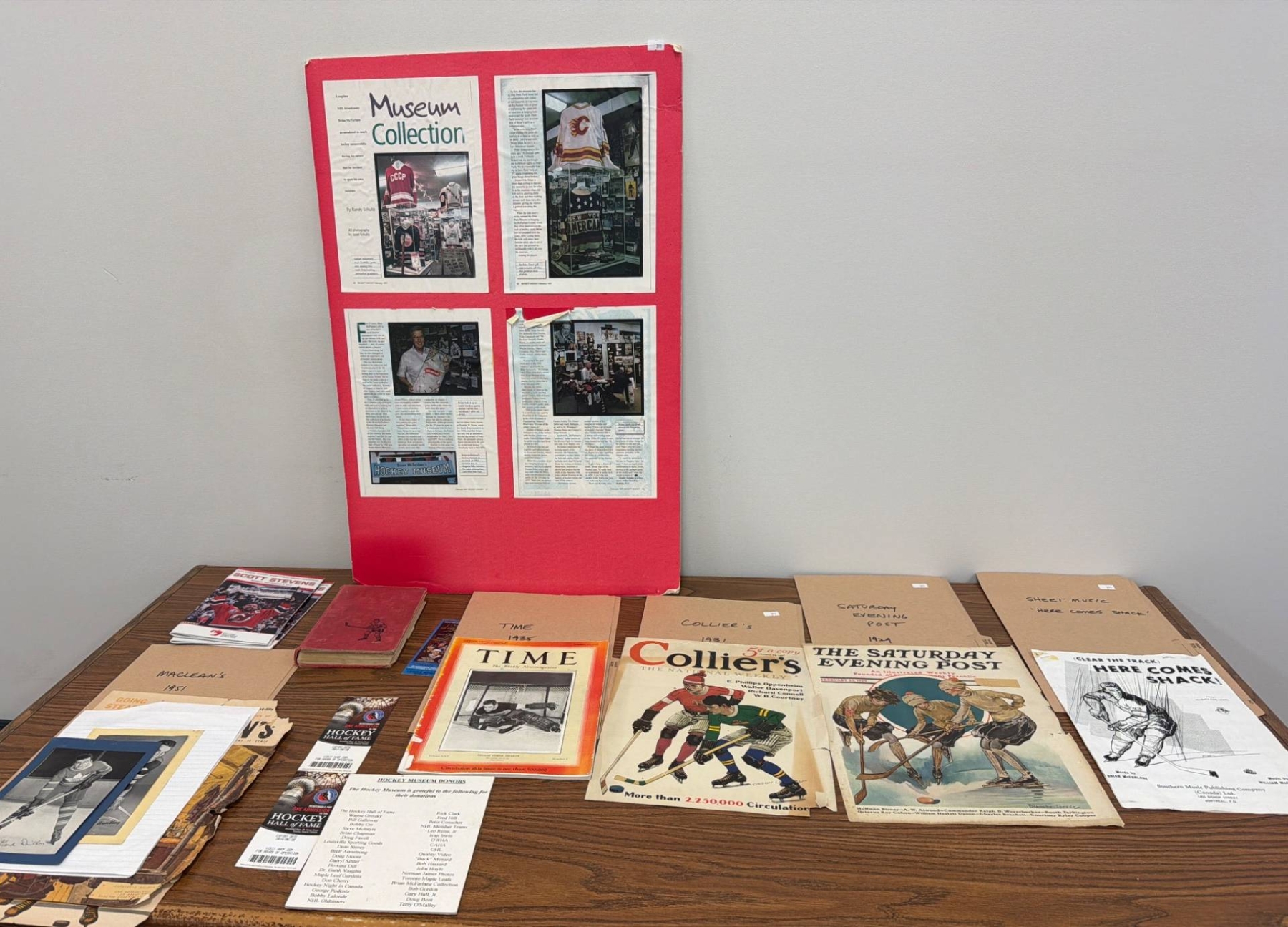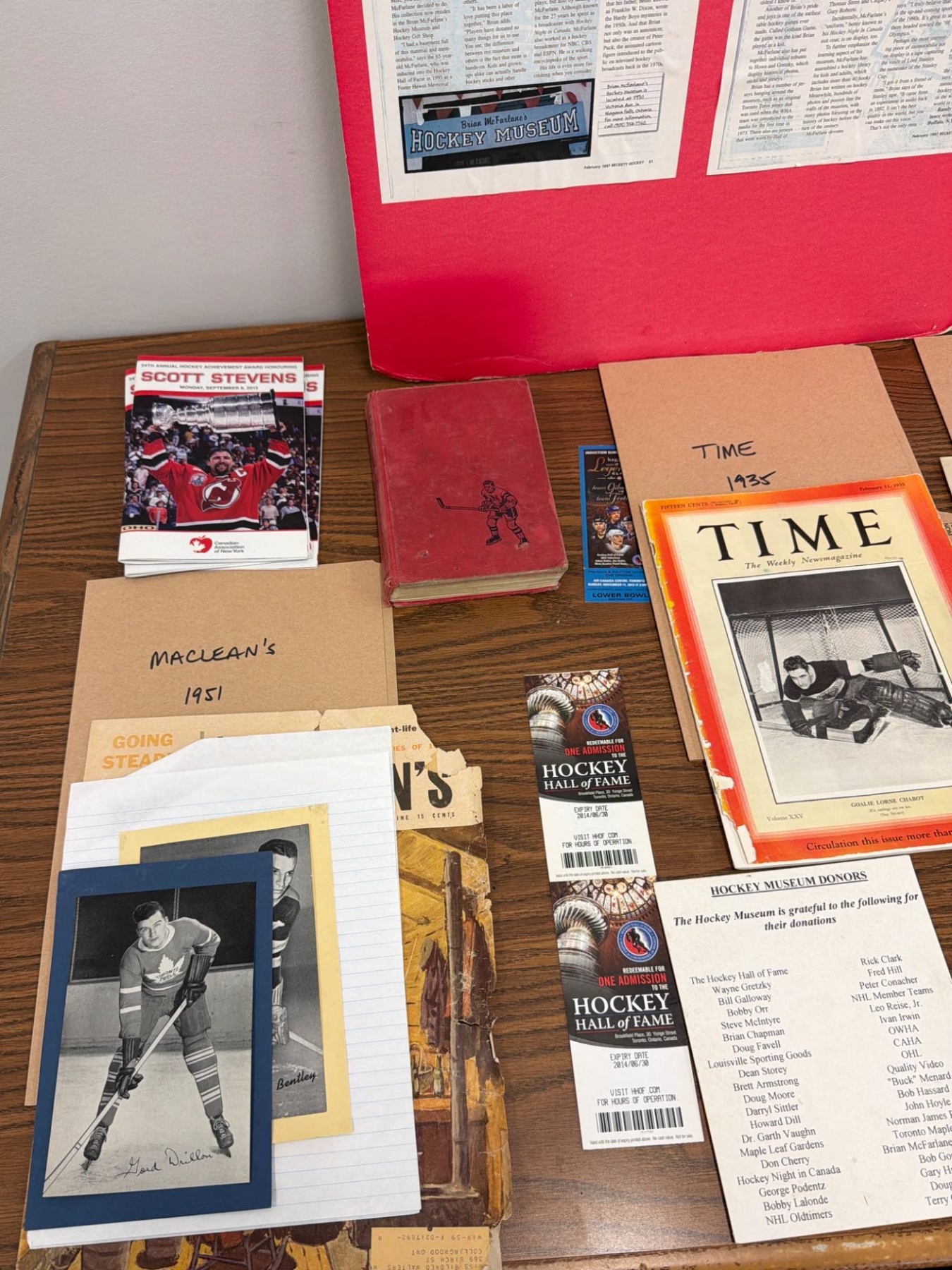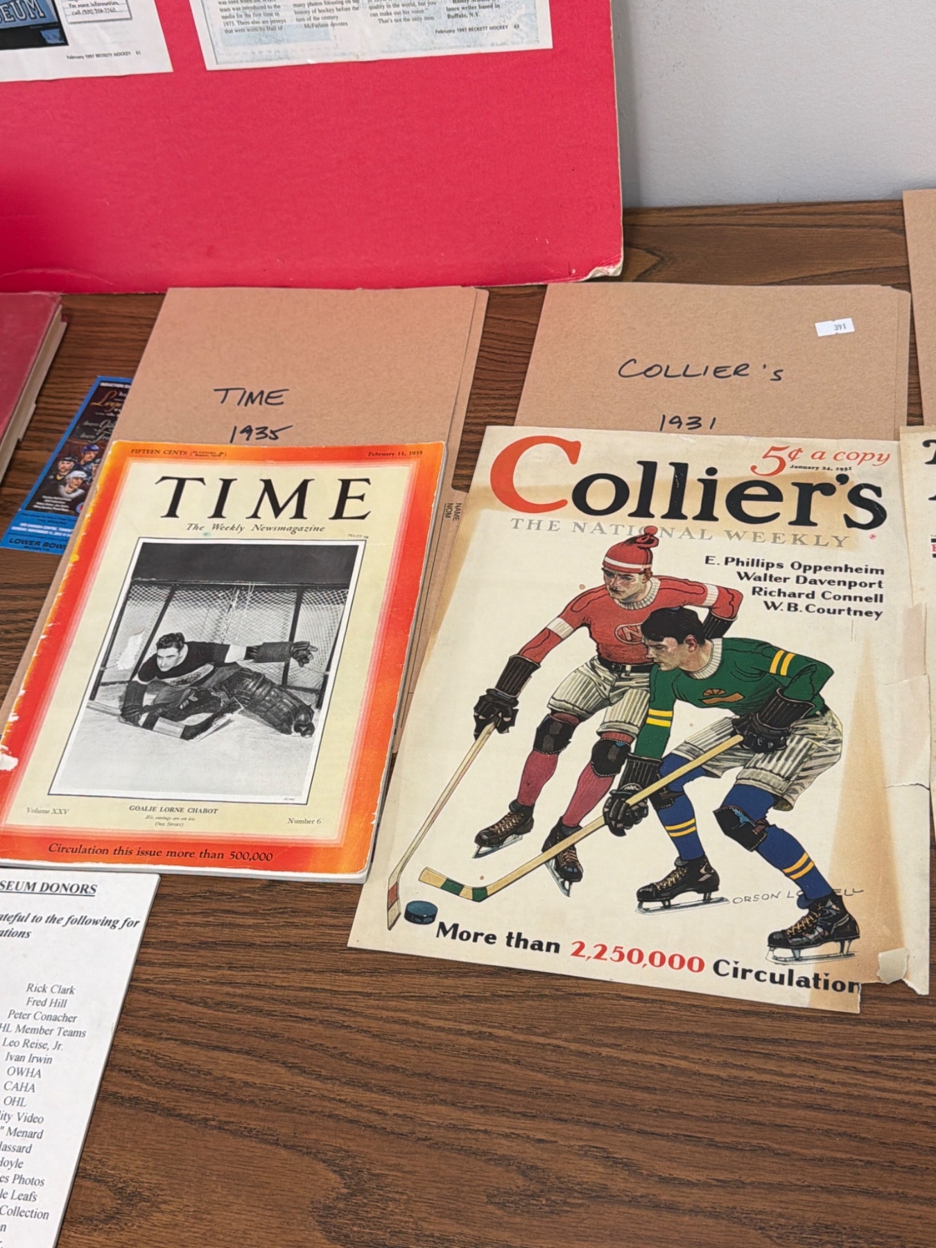 Comprehensive collection featuring hockey-themed vintage magazines, including issues of Collier's, Time, and The Saturday Evening Post, alongside other related historic publications. The lot includes a 'Museum Collection' display board and various hockey memorabilia such as trading cards and exhibition tickets. Each item is uniquely tied to hockey history, appealing to enthusiasts and collectors alike.