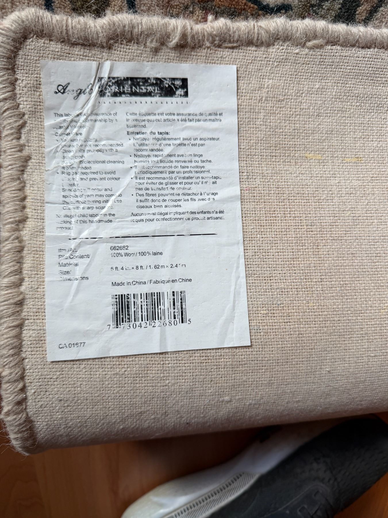 Area carpet hundred percent wool 5 foot 4" x 8'