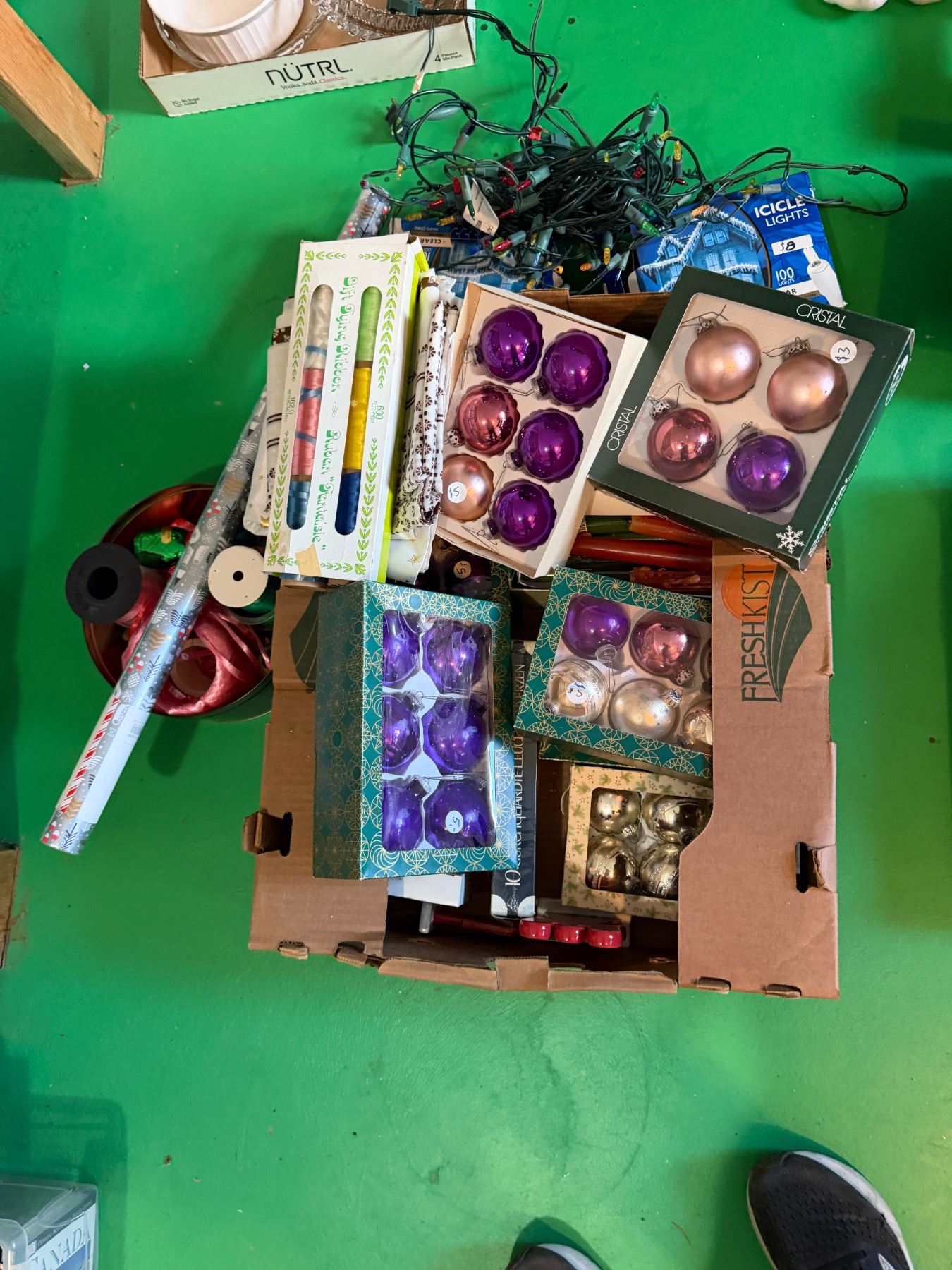 Lot 128 Christmas, decorations, ribbon, candles, lights, etc.