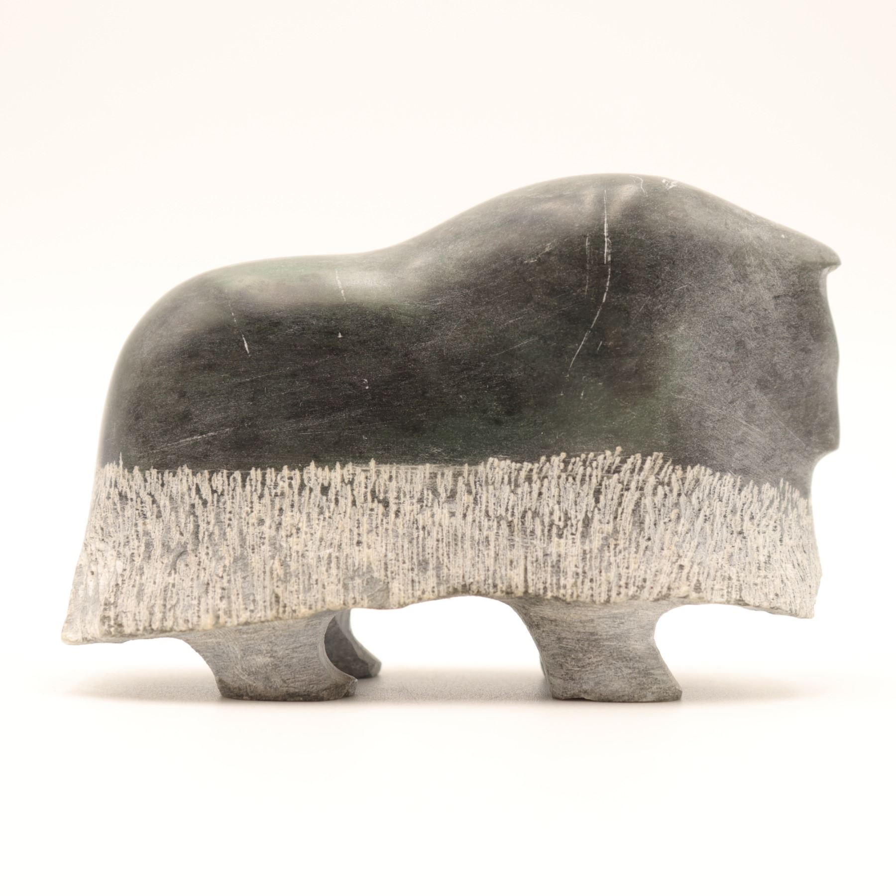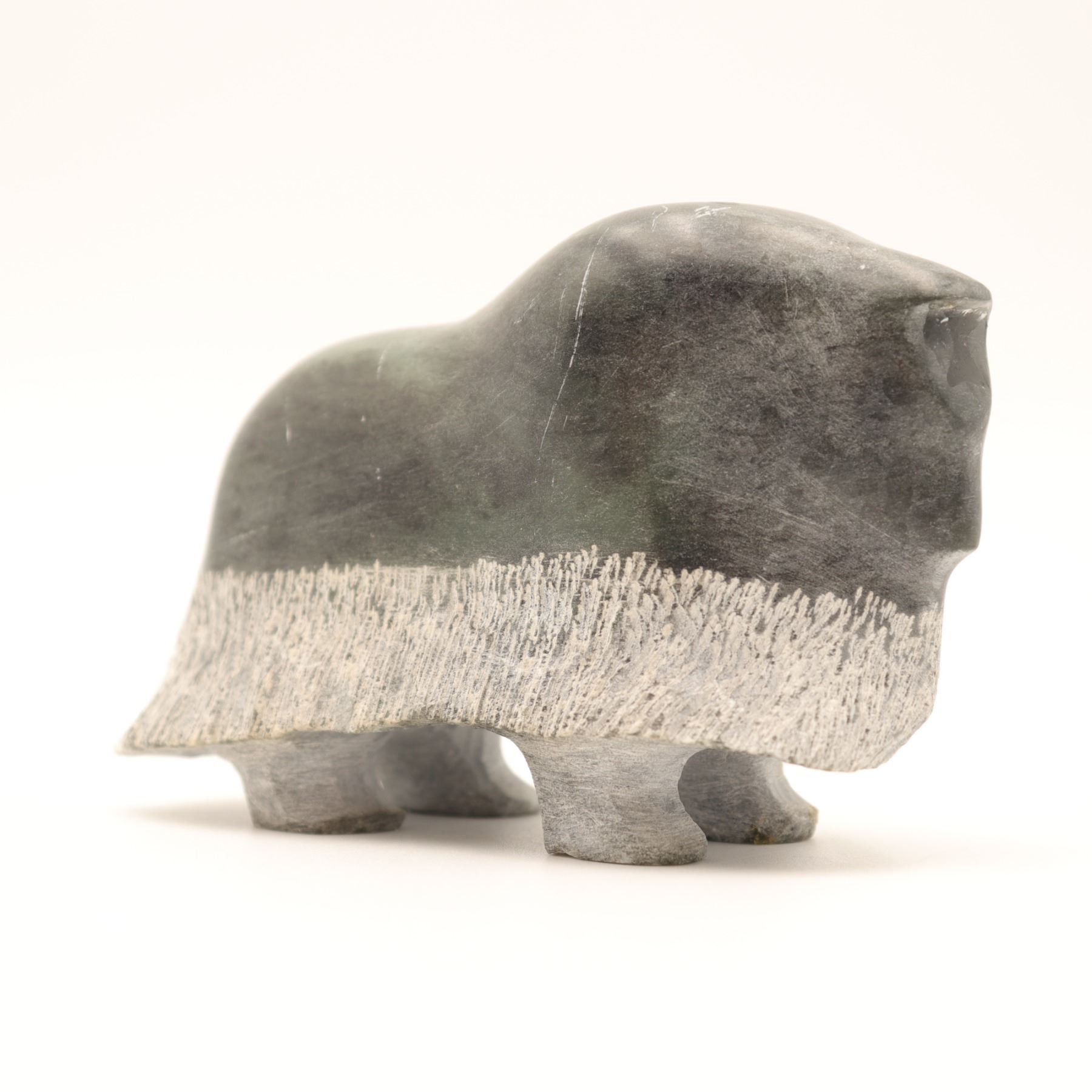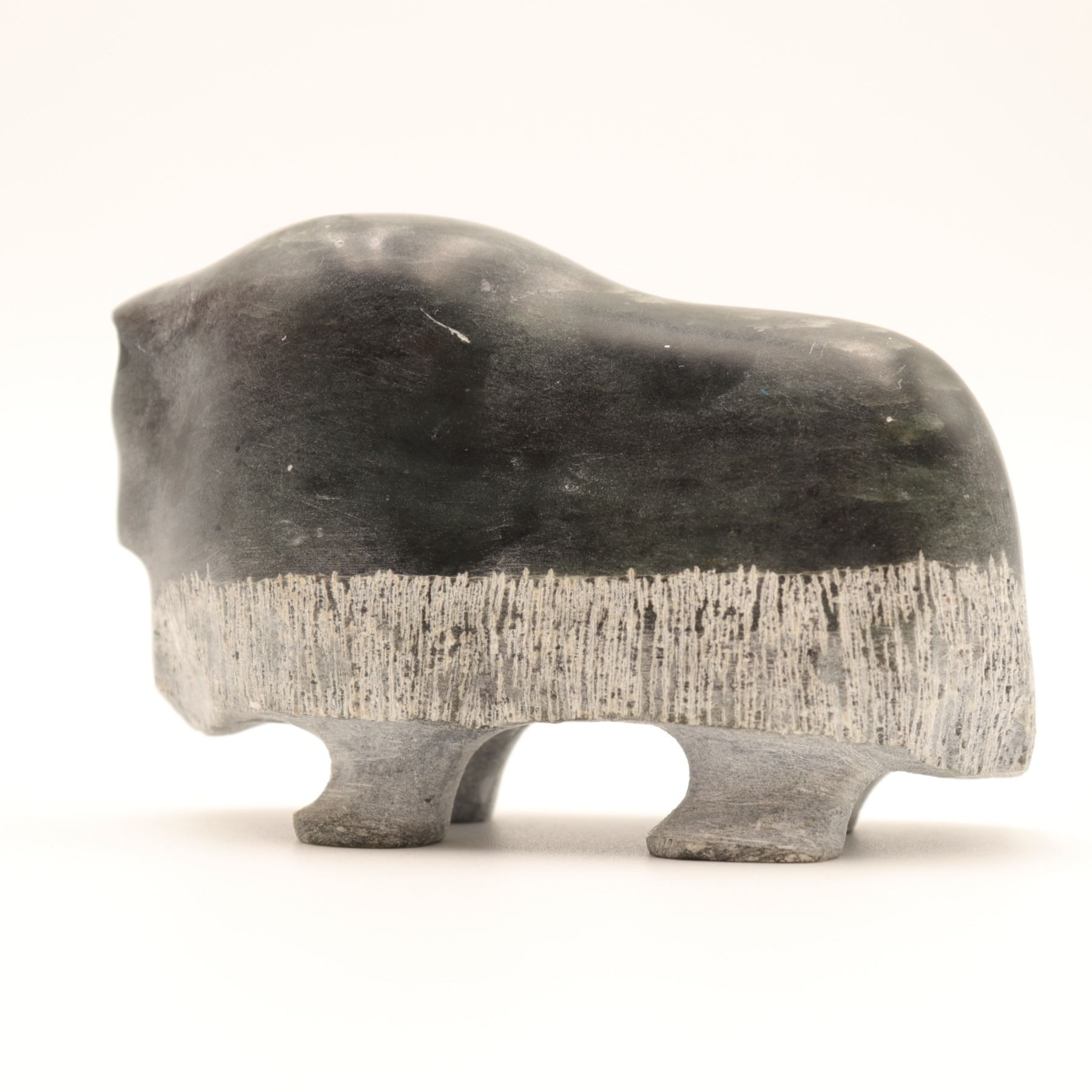 A Canadian Inuit carved stone muskox figure, worked in a dark green-gray stone with a compact, stylized body, rounded hump, and a contrasting band of incised rough-textured coat encircling the lower half. The carving is notable for its reductive silhouette and effective contrast between the smoothly polished upper body and the shaggy treatment of the fleece, a familiar visual language in Inuit muskox sculpture. The underside bears a faint incised signature that is not sufficiently legible to support a secure artist attribution. A small but appealing northern animal carving with strong decorative presence. Light surface wear and scuffing; underside with old felt pads.