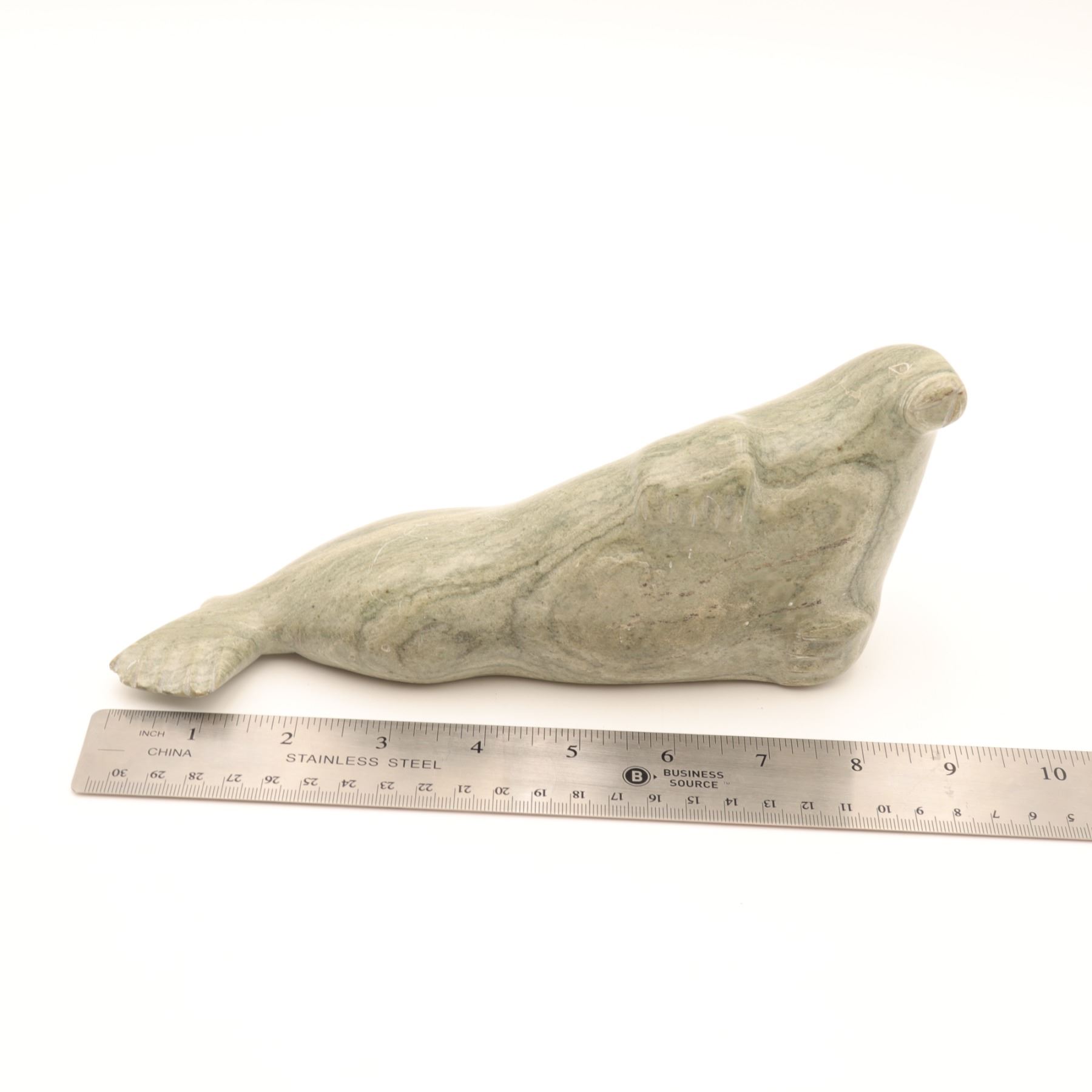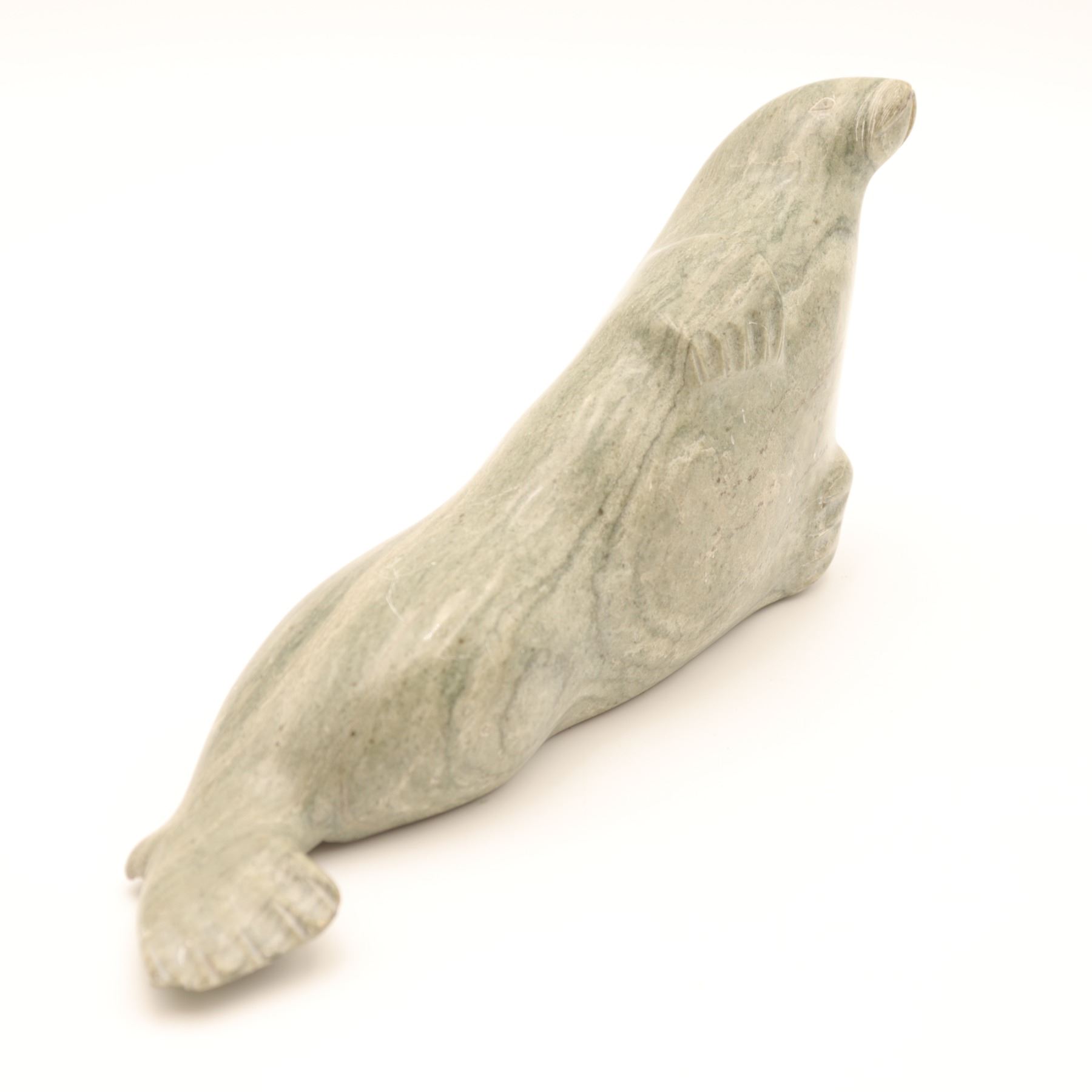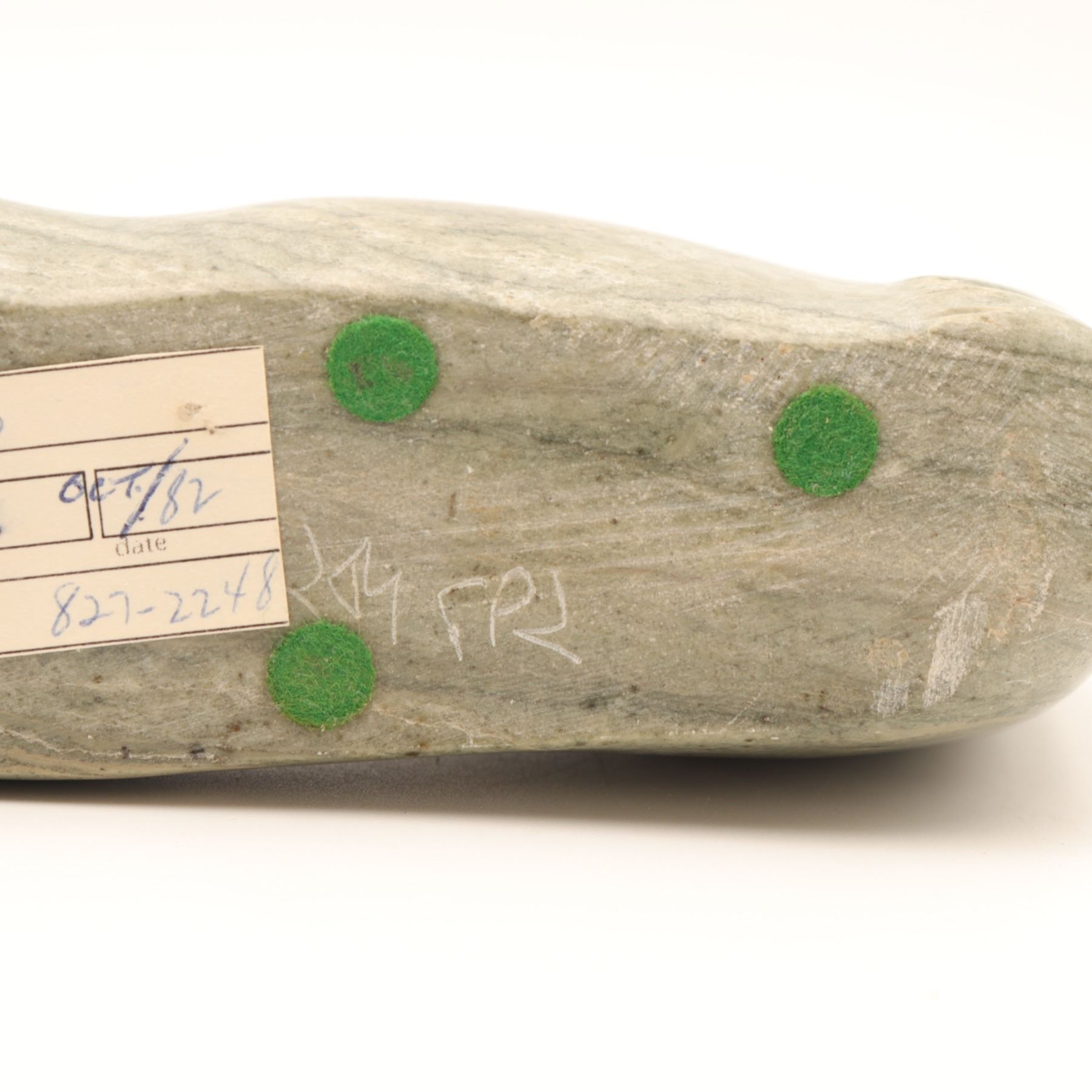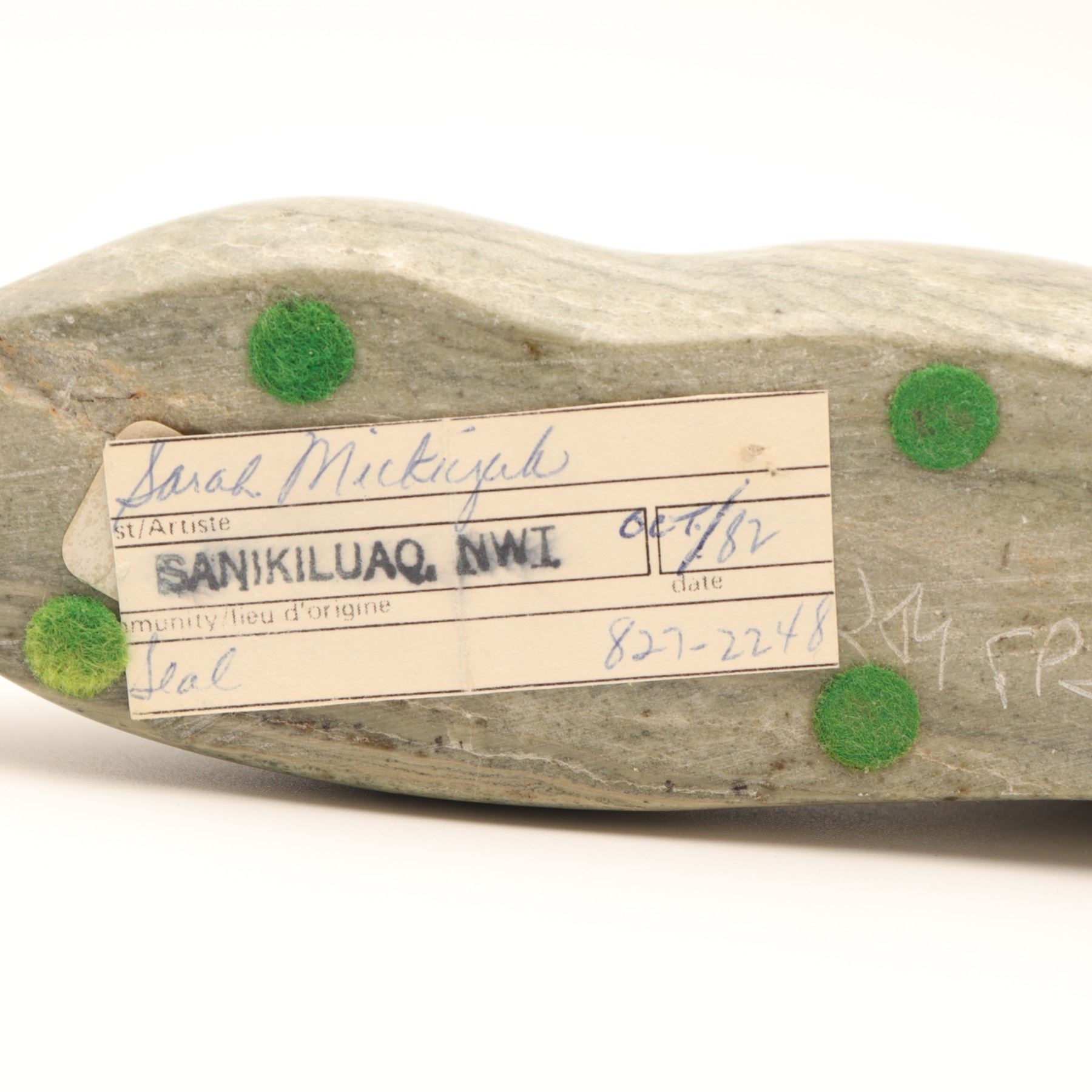 A Canadian Inuit carved stone seal by Sarah Mickiyuk, labeled to the underside “SANIKILUAQ, NWT” and dated Oct/82. Carved in a pale green-gray stone with attractive natural veining, the figure is modeled in a long reclining pose with uplifted head, lightly articulated flippers, and a smoothly contoured body that emphasizes the seal’s mass and glide. The underside retains its original paper identification label reading “Sarah Mickiyuk / SANIKILUAQ, NWT / Oct/82 / seal / 827-2248,” together with a faint scratched inscription and later green felt pads. A well-scaled and appealing Sanikiluaq animal carving with strong shelf presence. No visible major cracks or repairs.