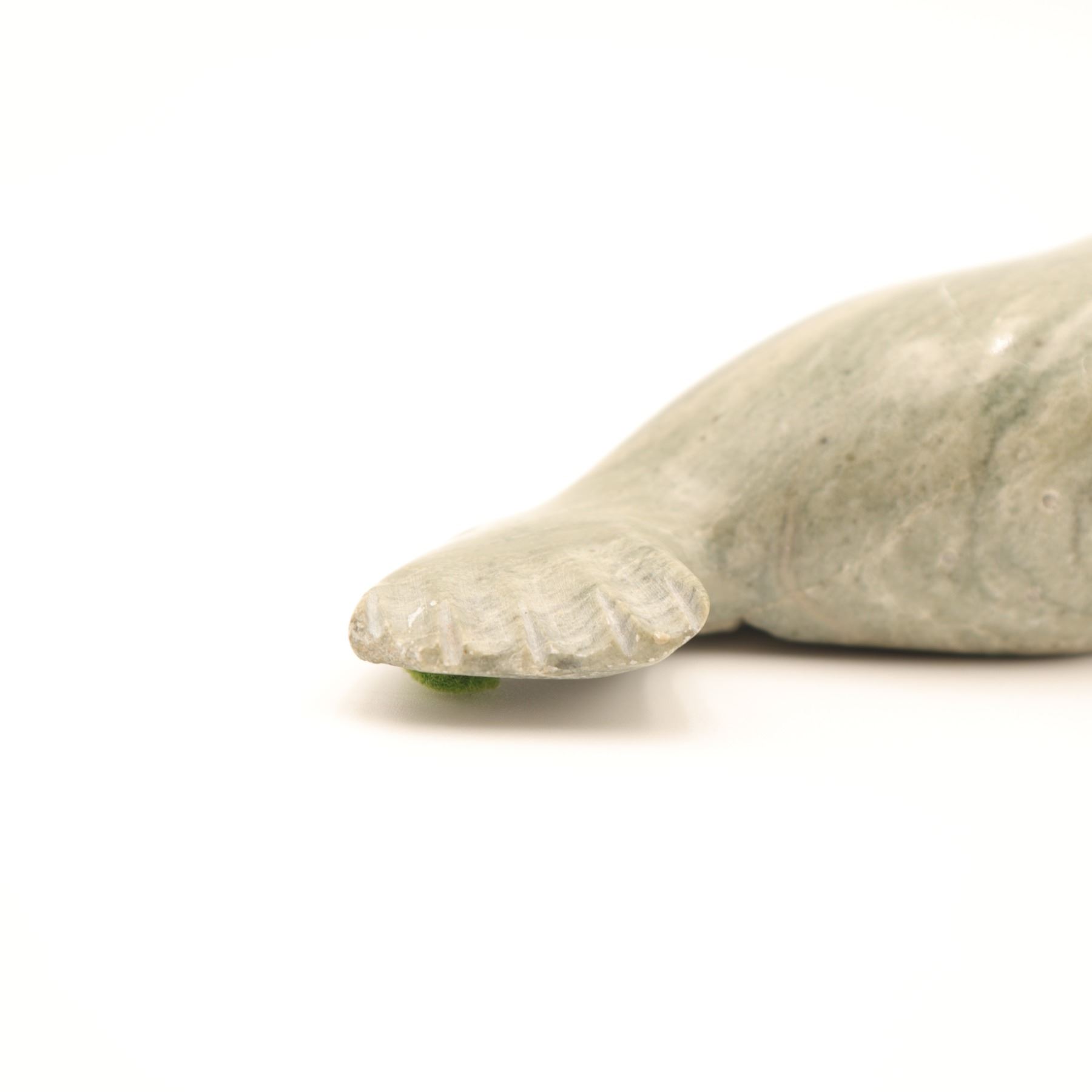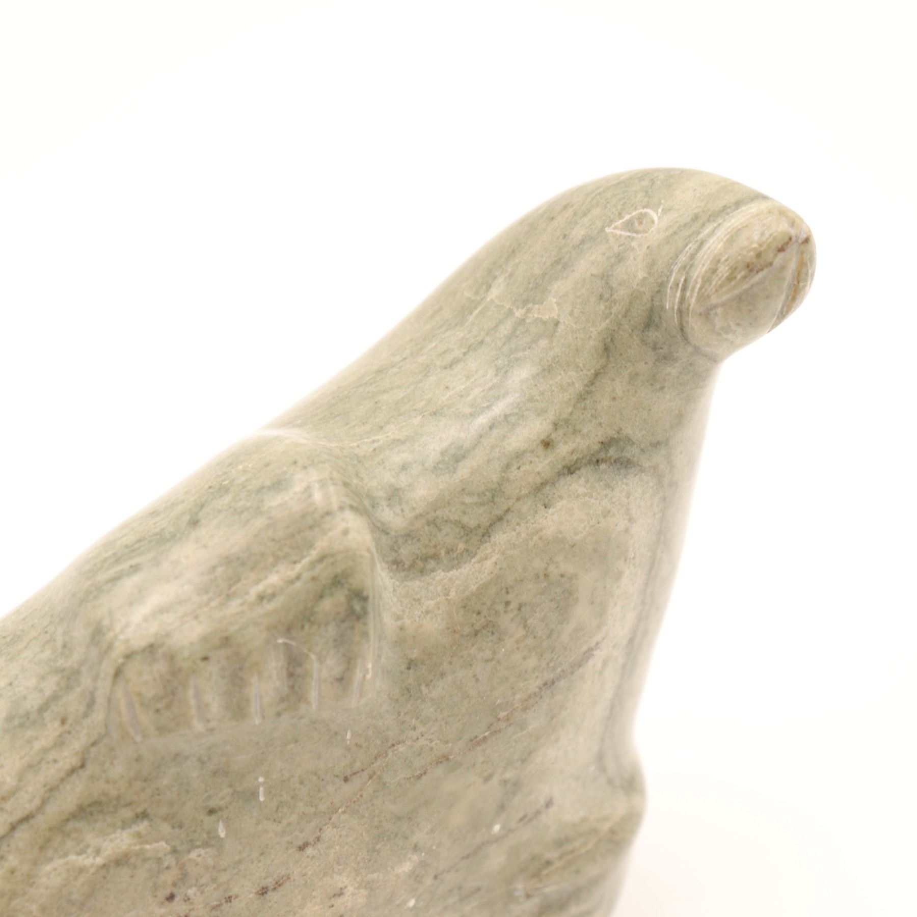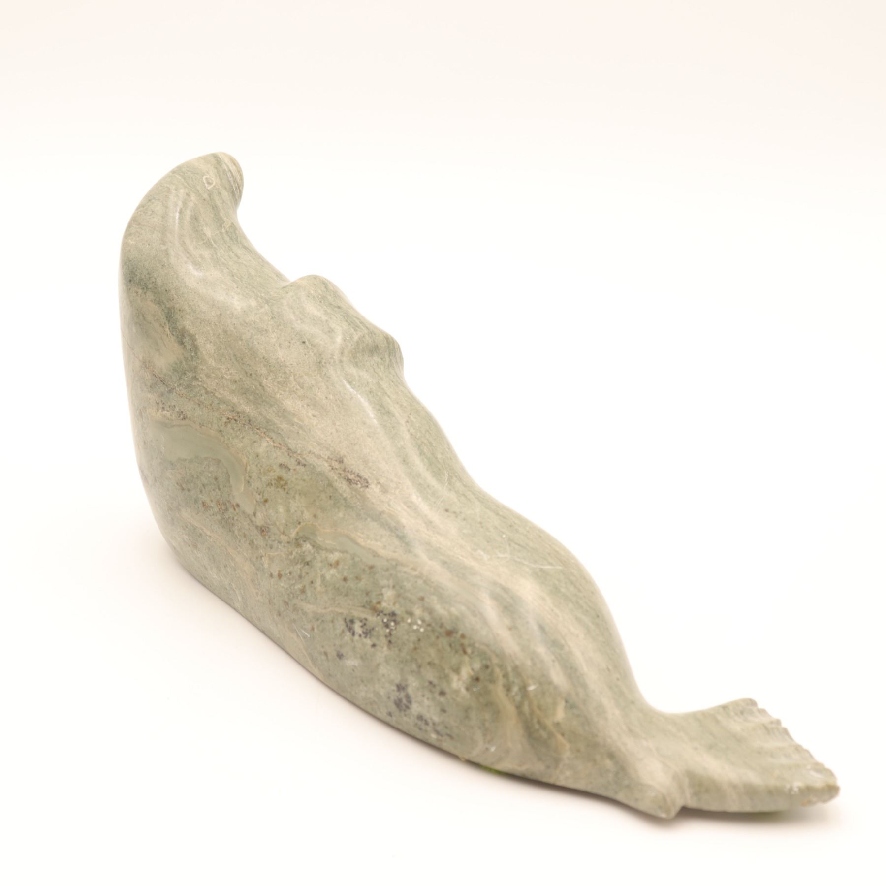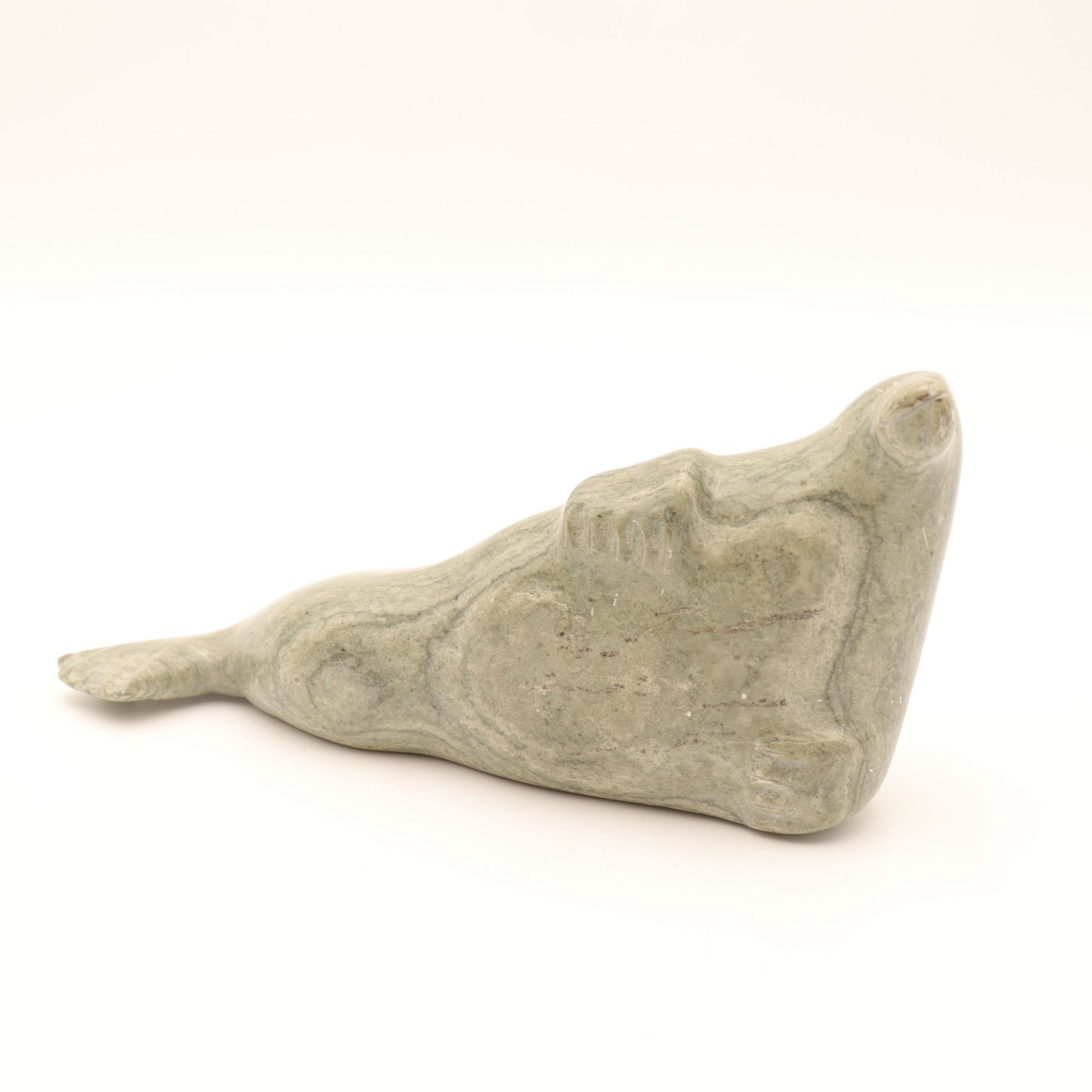 A Canadian Inuit carved stone seal by Sarah Mickiyuk, labeled to the underside “SANIKILUAQ, NWT” and dated Oct/82. Carved in a pale green-gray stone with attractive natural veining, the figure is modeled in a long reclining pose with uplifted head, lightly articulated flippers, and a smoothly contoured body that emphasizes the seal’s mass and glide. The underside retains its original paper identification label reading “Sarah Mickiyuk / SANIKILUAQ, NWT / Oct/82 / seal / 827-2248,” together with a faint scratched inscription and later green felt pads. A well-scaled and appealing Sanikiluaq animal carving with strong shelf presence. No visible major cracks or repairs.