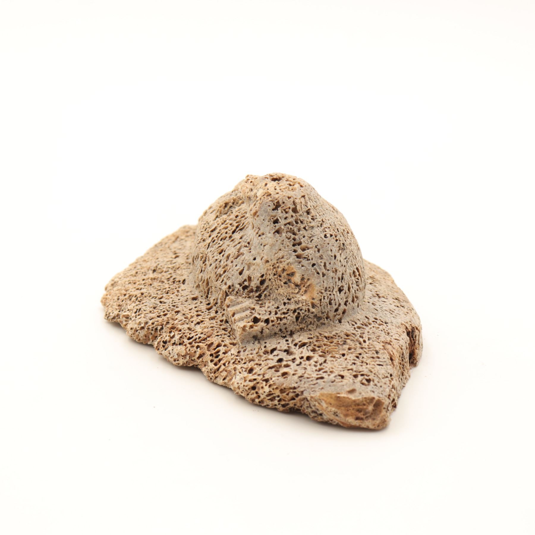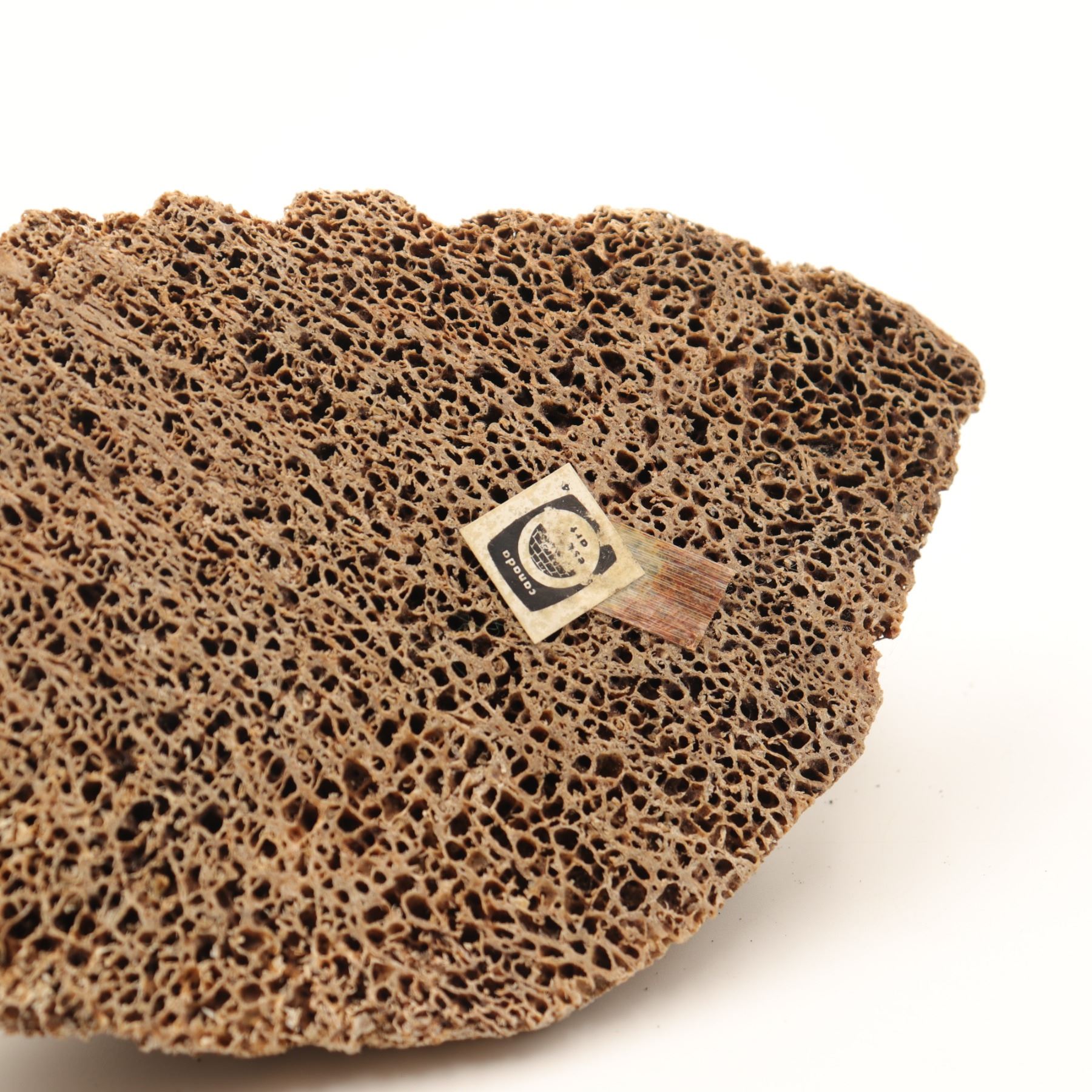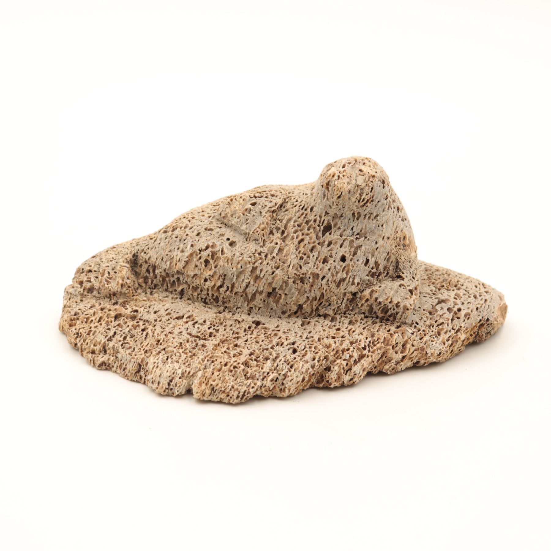A Canadian Inuit bone carving of a basking seal reclining on an irregular ice-floe base, worked in a pale porous bone, likely whalebone, with a compact rounded body, lightly indicated foreflippers, and a raised head turned upward. The underside retains an old igloo authenticity tag. The carving has a strong textural presence, with the open cellular surface of the bone used effectively to suggest the roughness of ice and the natural character of the material. A small but appealing Arctic animal carving with good cabinet scale. General light wear.