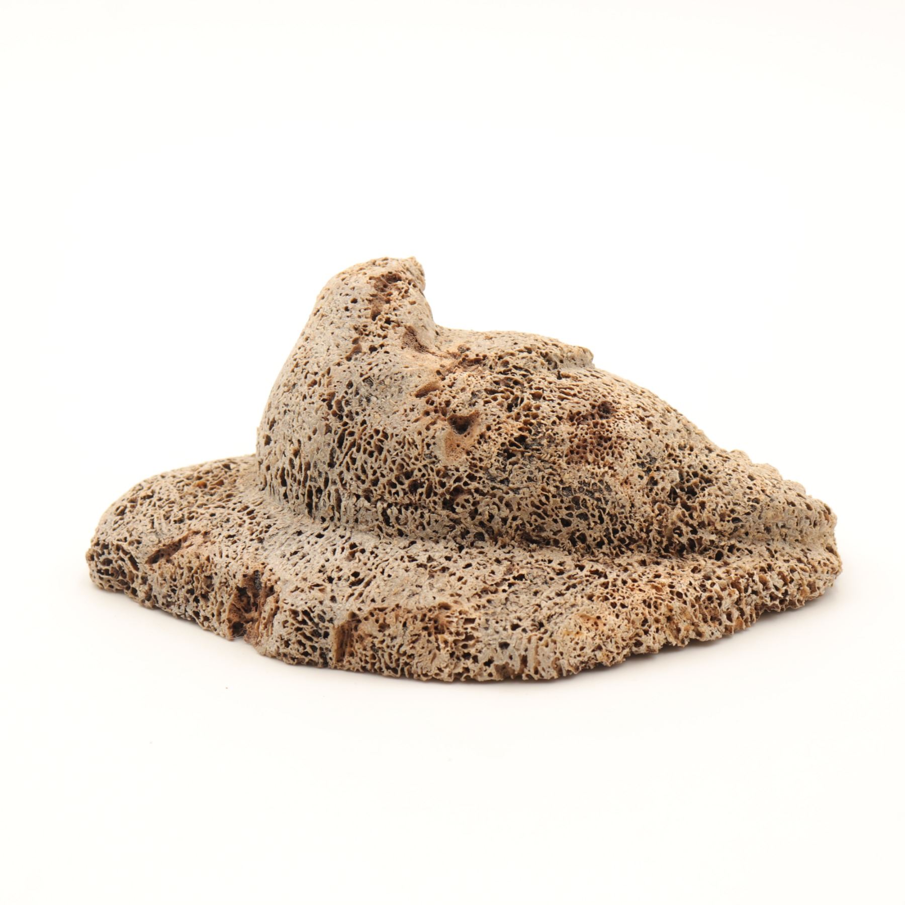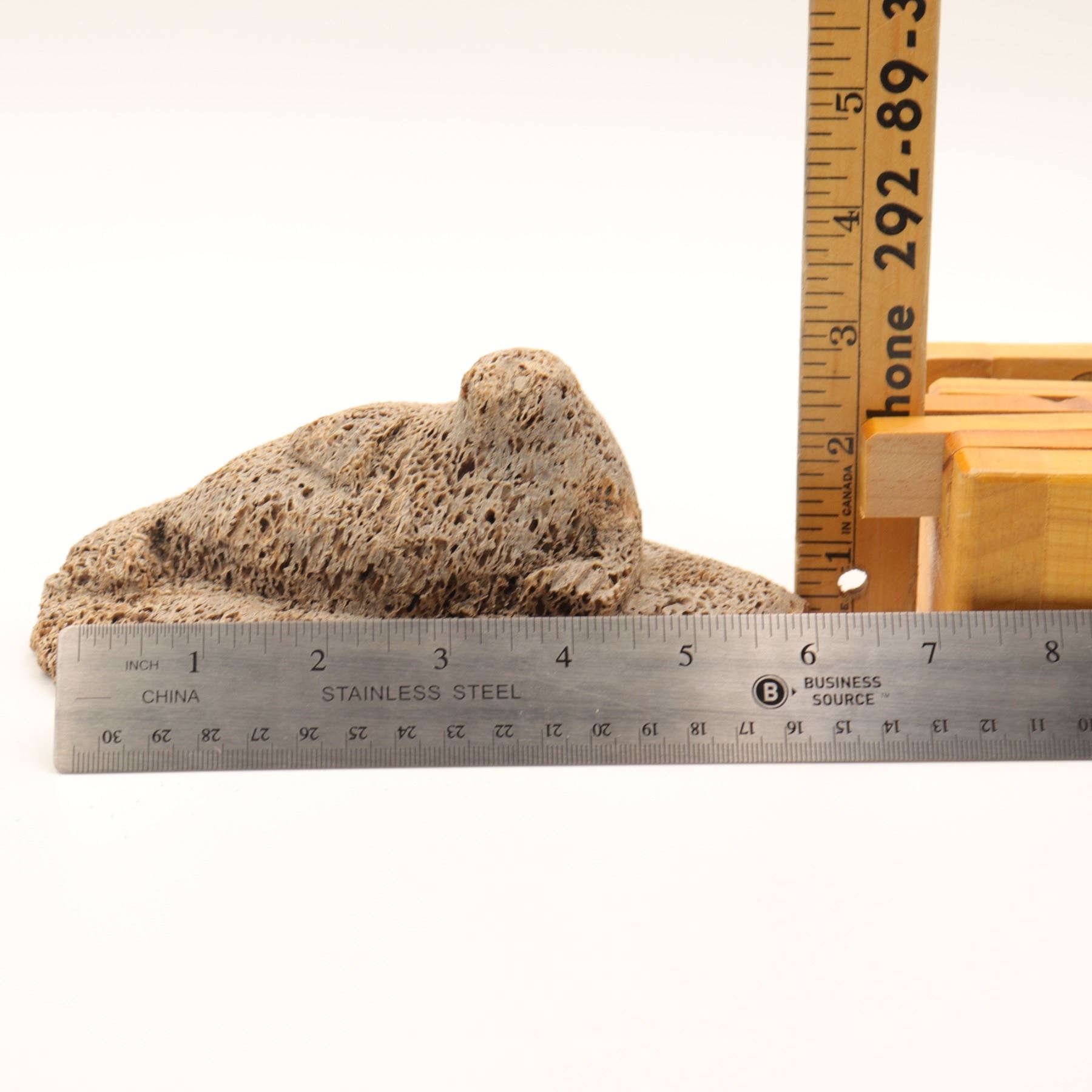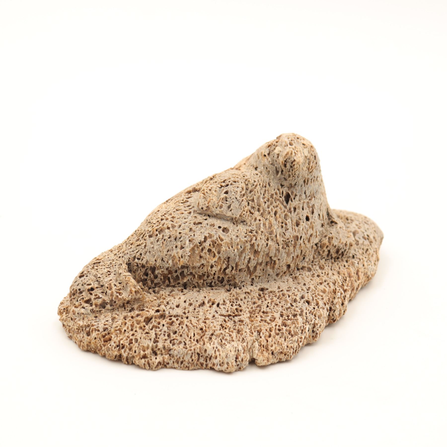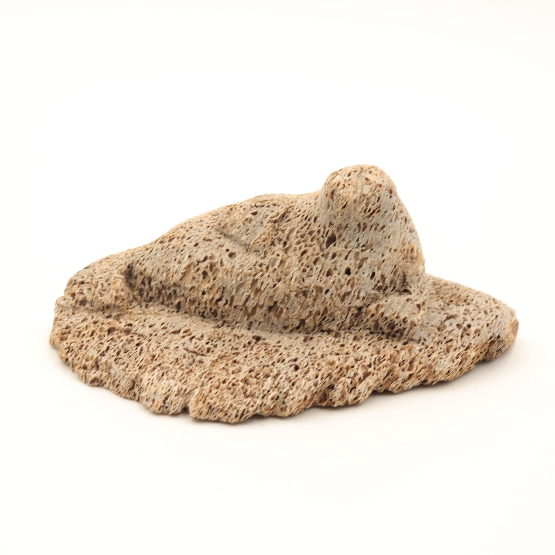 A Canadian Inuit bone carving of a basking seal reclining on an irregular ice-floe base, worked in a pale porous bone, likely whalebone, with a compact rounded body, lightly indicated foreflippers, and a raised head turned upward. The underside retains an old igloo authenticity tag. The carving has a strong textural presence, with the open cellular surface of the bone used effectively to suggest the roughness of ice and the natural character of the material. A small but appealing Arctic animal carving with good cabinet scale. General light wear.