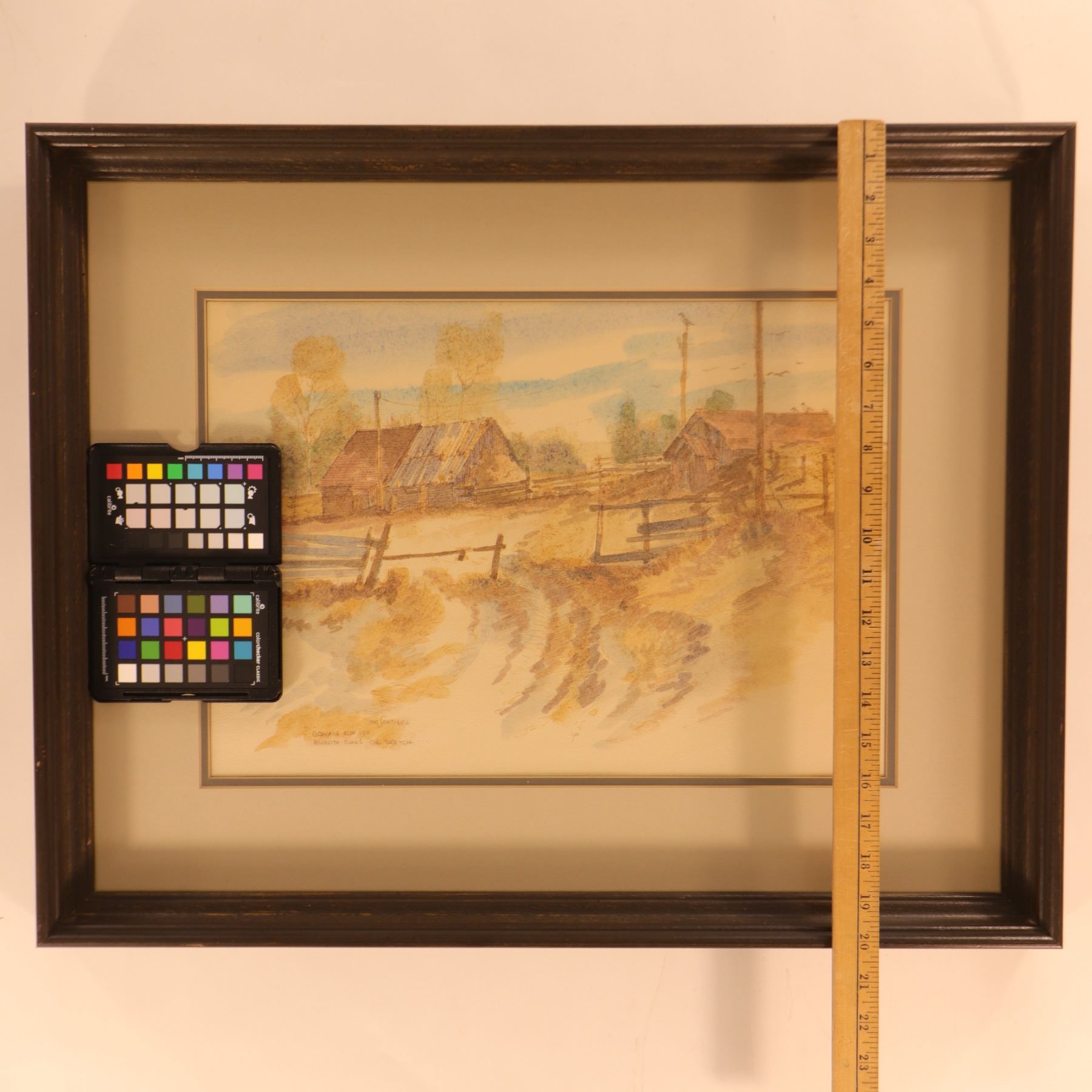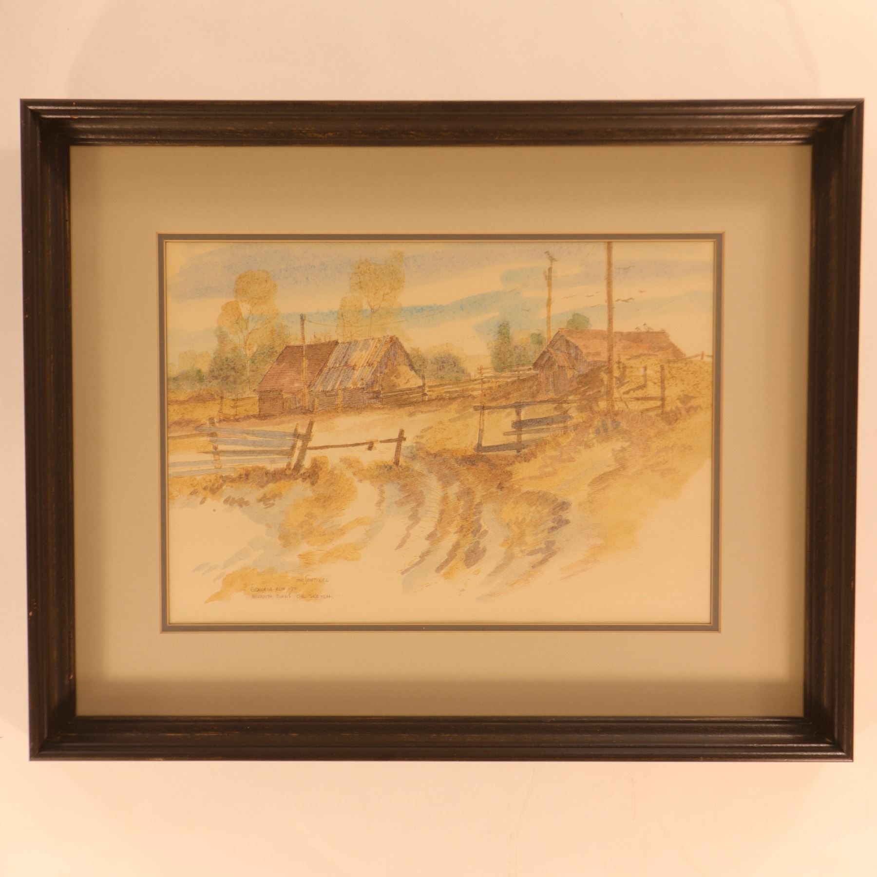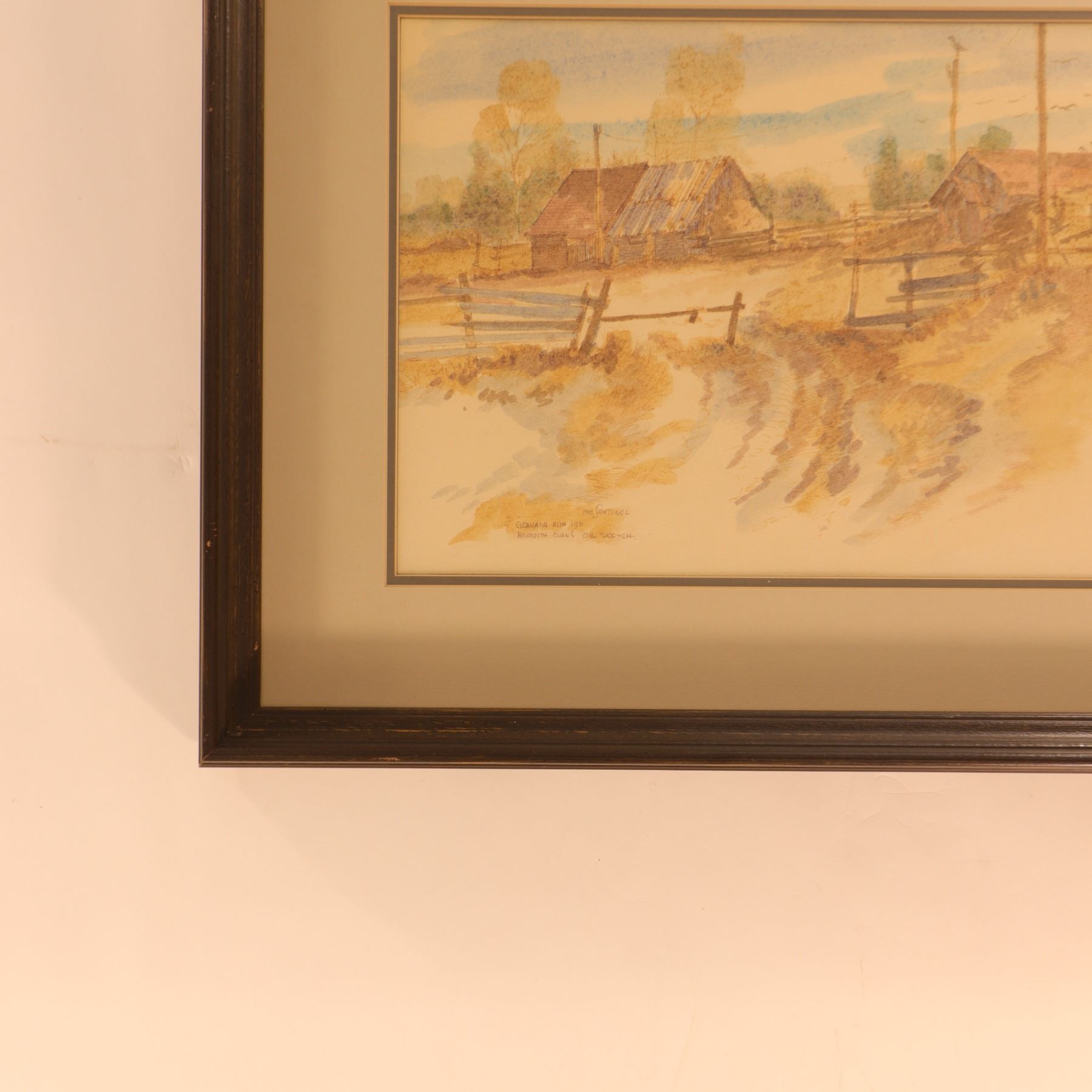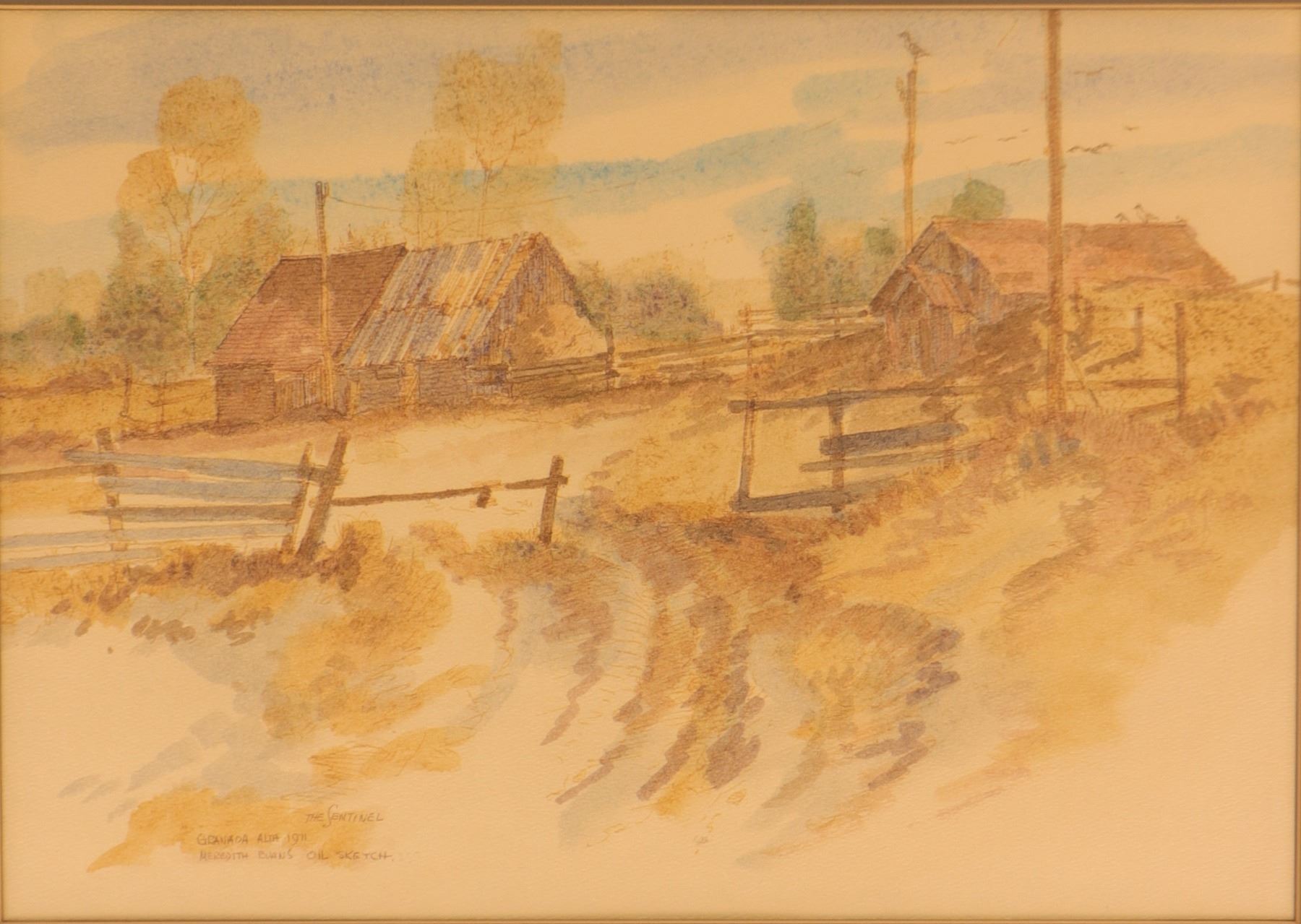 Original oil sketch by Canadian artist Meredith Evans (1919–1996), depicting a quiet rural landscape with weathered farm buildings, split-rail fencing, and softly rendered foothills beyond. The composition is handled in Evans’s characteristic light, atmospheric manner, with a restrained prairie palette and a strong sense of place. The lower left inscription appears to read: “The Sentinel / Granada Alta 1971 / Meredith Evans Oil Sketch.” Presented under specialty non-reflective glass in a simple frame.