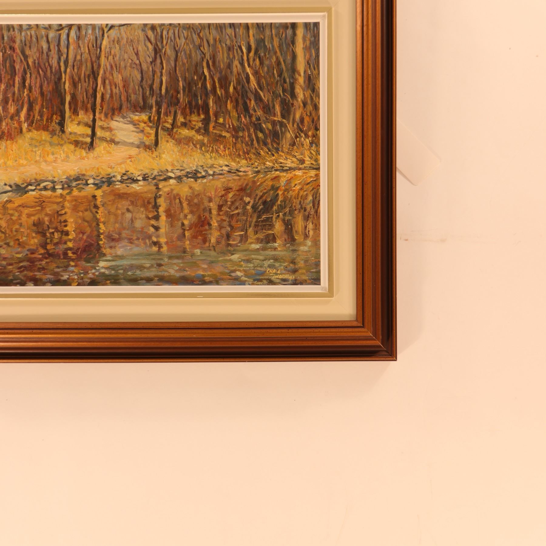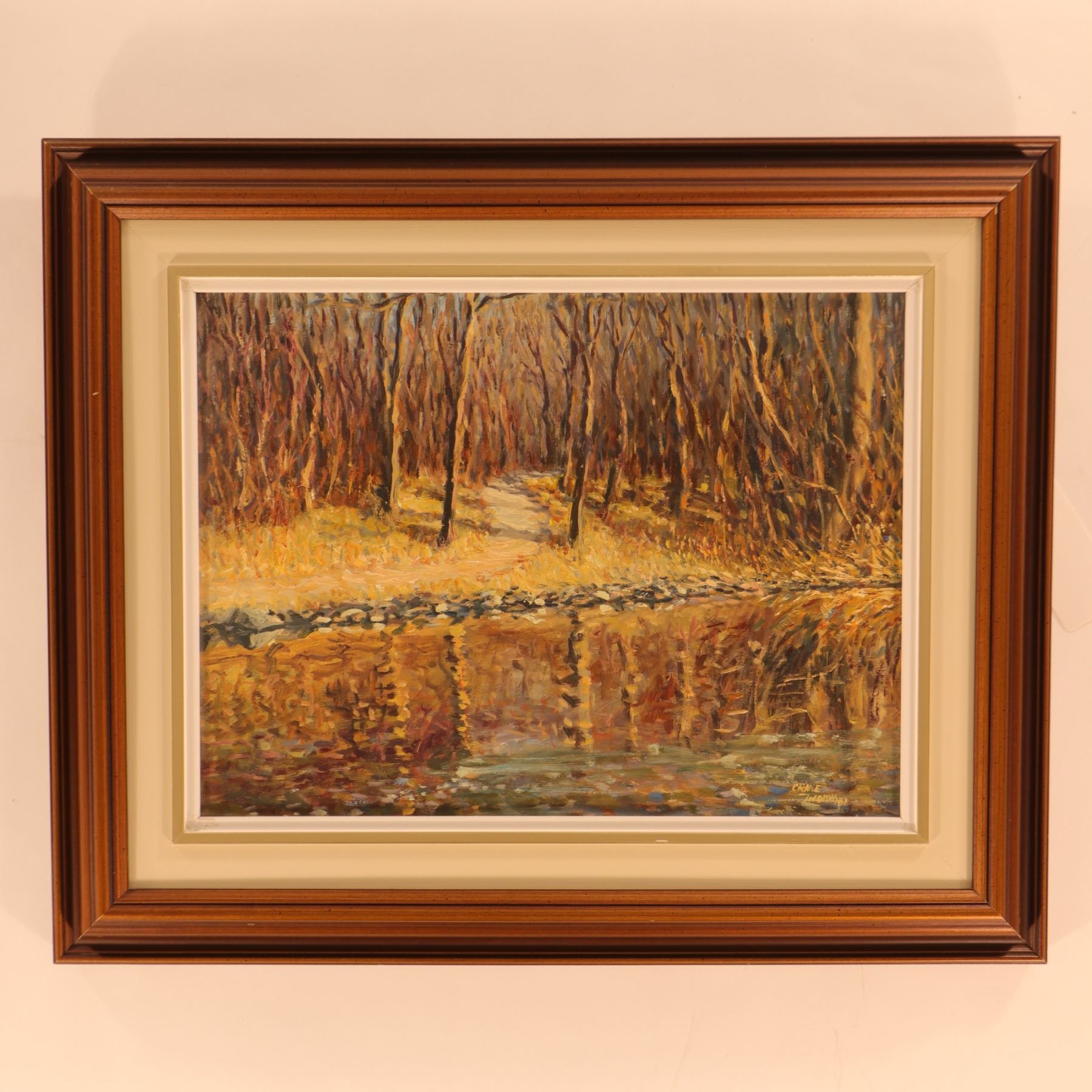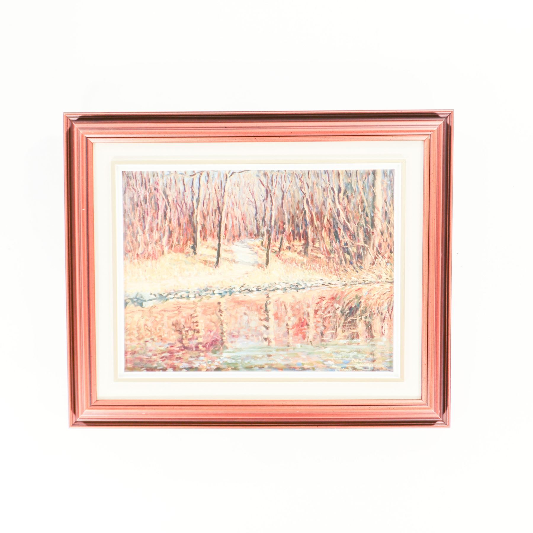 Signed oil on board landscape by Crane Thomas, depicting a quiet woodland edge with leafless trees, a pale path or clearing, and a reflective body of water in the foreground. The composition is handled in a loose, painterly manner, with broken, textured brushwork and a soft palette of rose, cream, ochre, blue, and grey that gives the scene a luminous, reflective quality. The image has a strong atmospheric effect, with the mirrored treeline and water surface becoming as important as the wooded bank itself. Signature appears upper left. Presented in a moulded frame with matting. The framed size is 22 x 18 in., with the visible image 16 x 12 in.