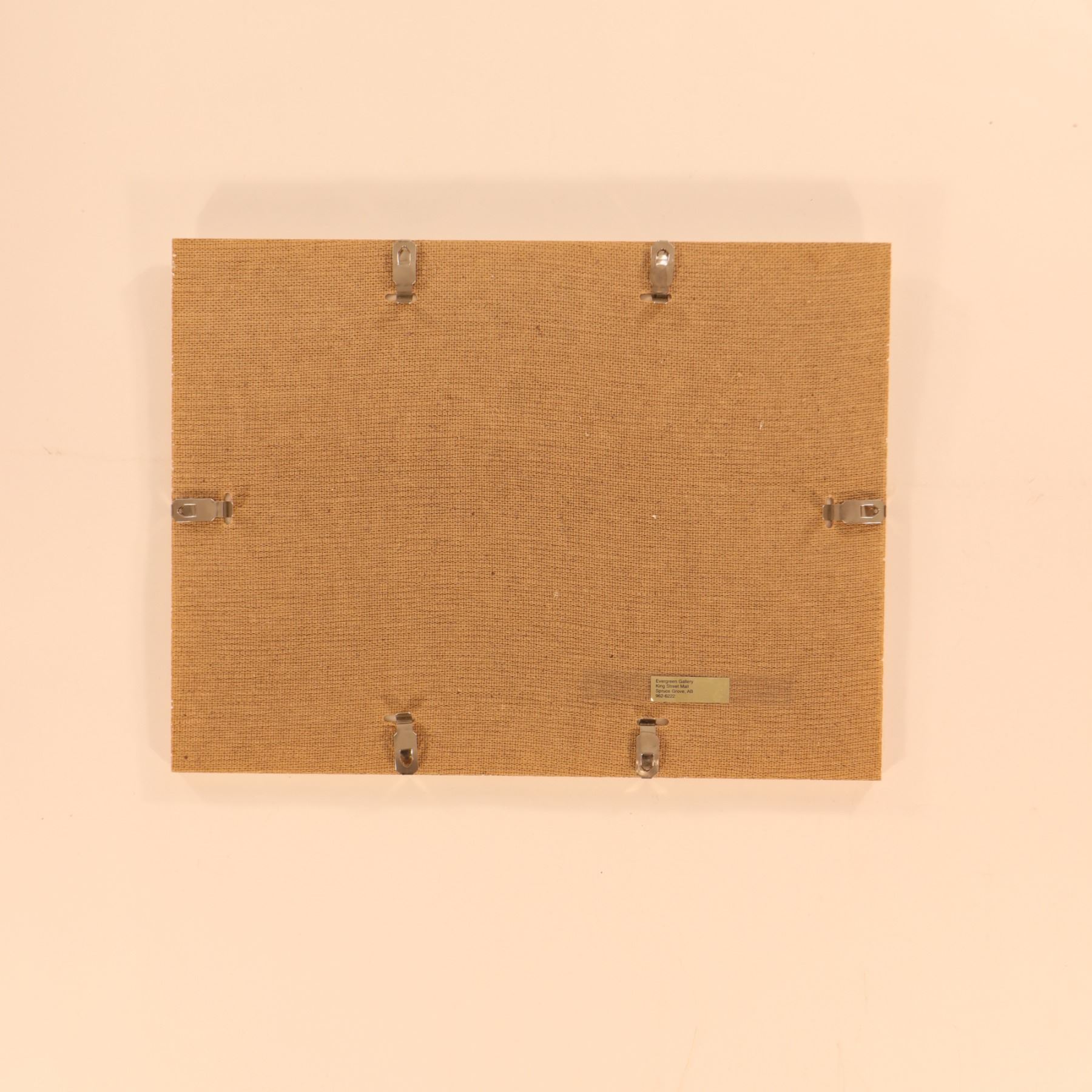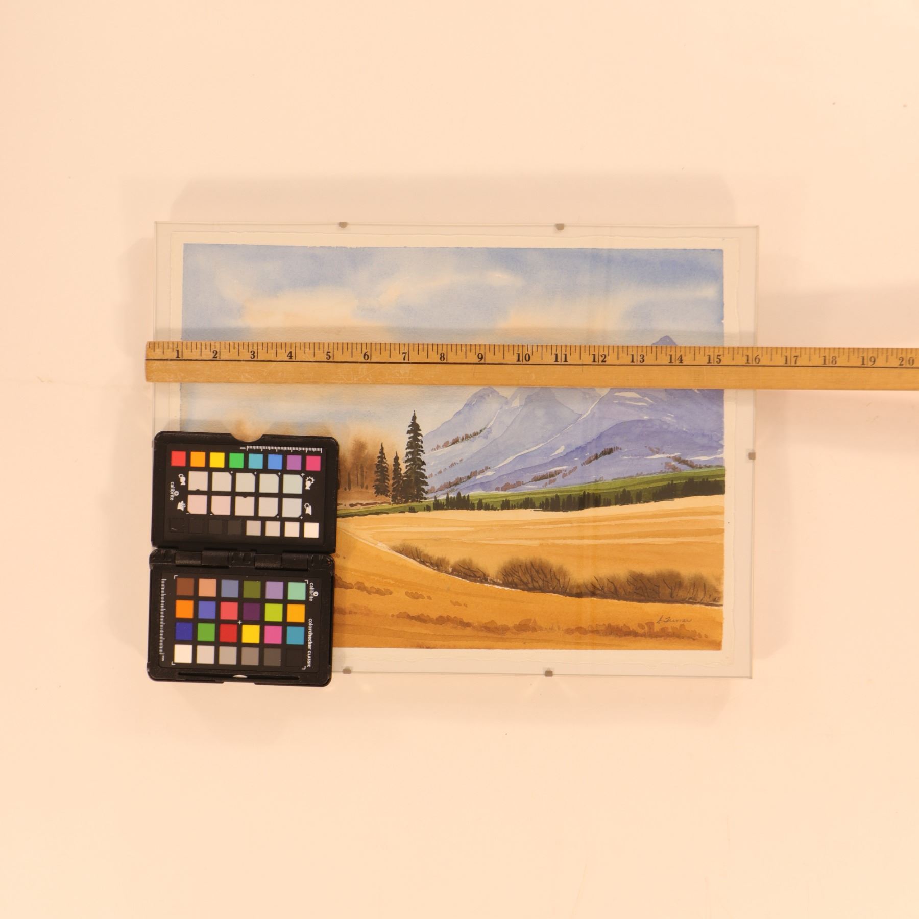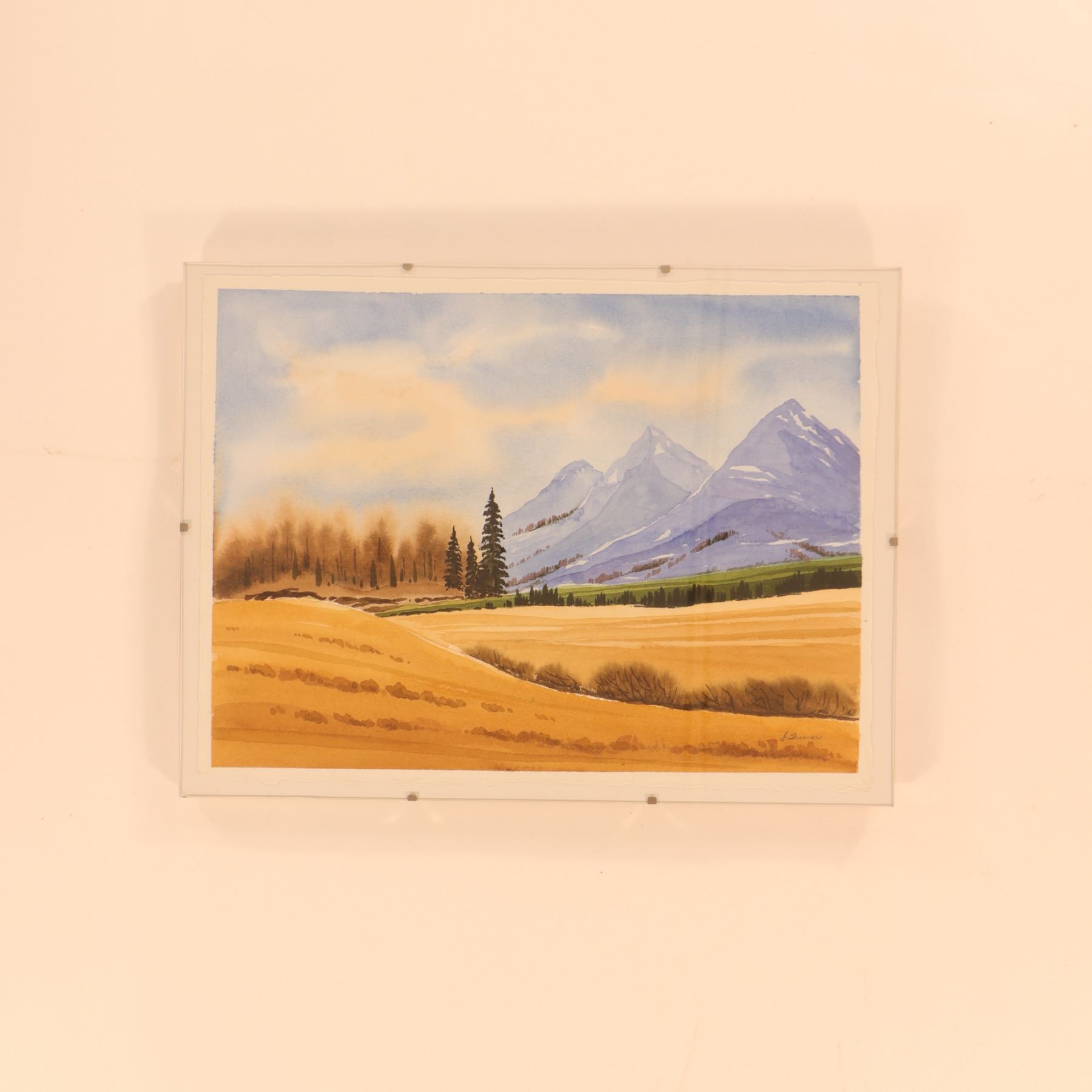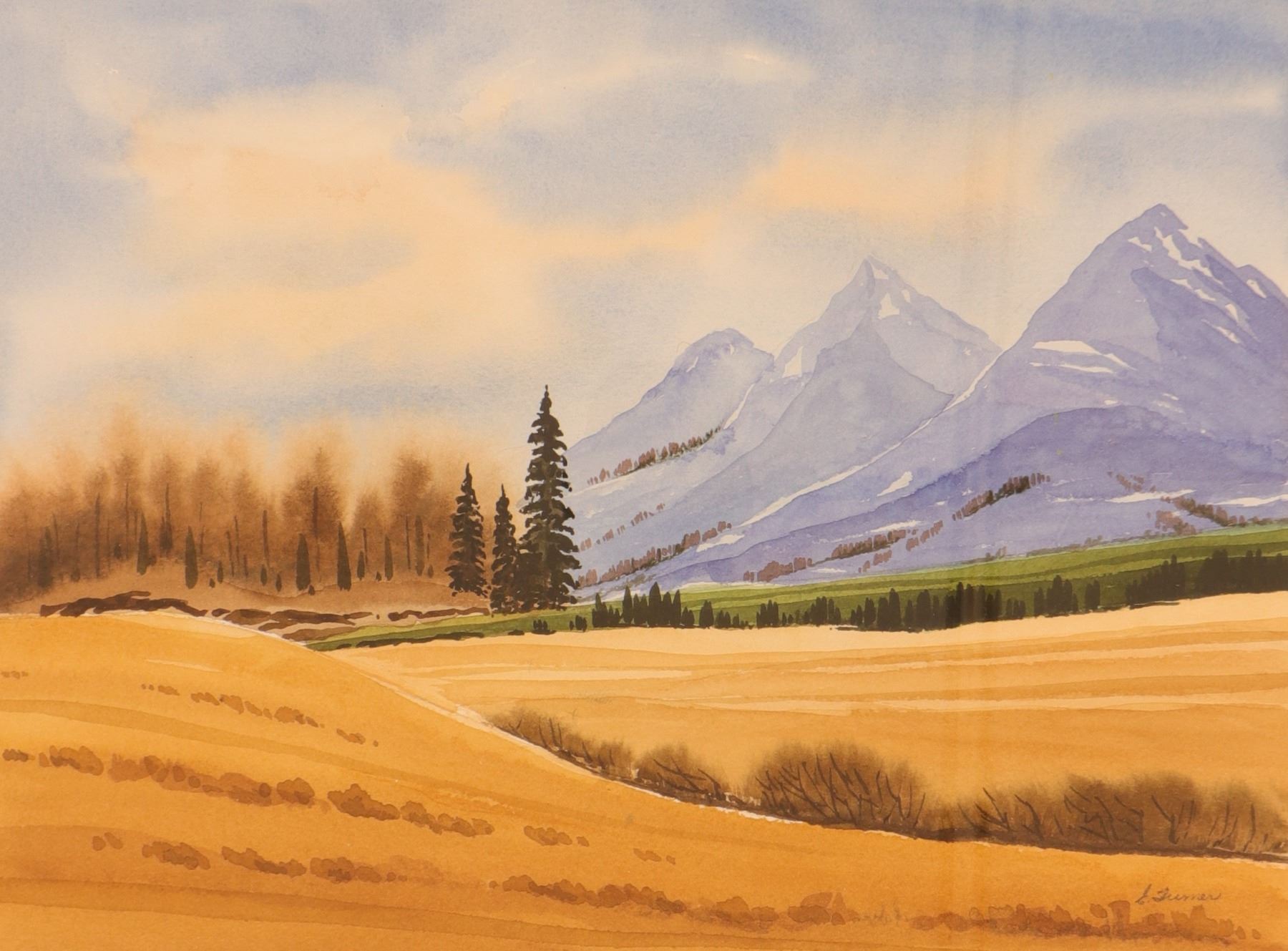 Watercolour landscape depicting The Three Sisters in the Alberta Rockies, showing the familiar trio of mountain peaks rising beyond golden foreground meadows, a dark tree line, and a band of green foothills. The composition is handled in a clean, decorative manner with soft washes of blue, violet, ochre, and green, capturing the contrast between open prairie light and the cooler mass of the mountains. Signed lower right Turner; the first initial is faint and appears to read E. Housed in a simple glass-front presentation. Verso with Evergreen Gallery, King Street Mall, Spruce Grove, AB label. Sheet size 16 x 12 in.