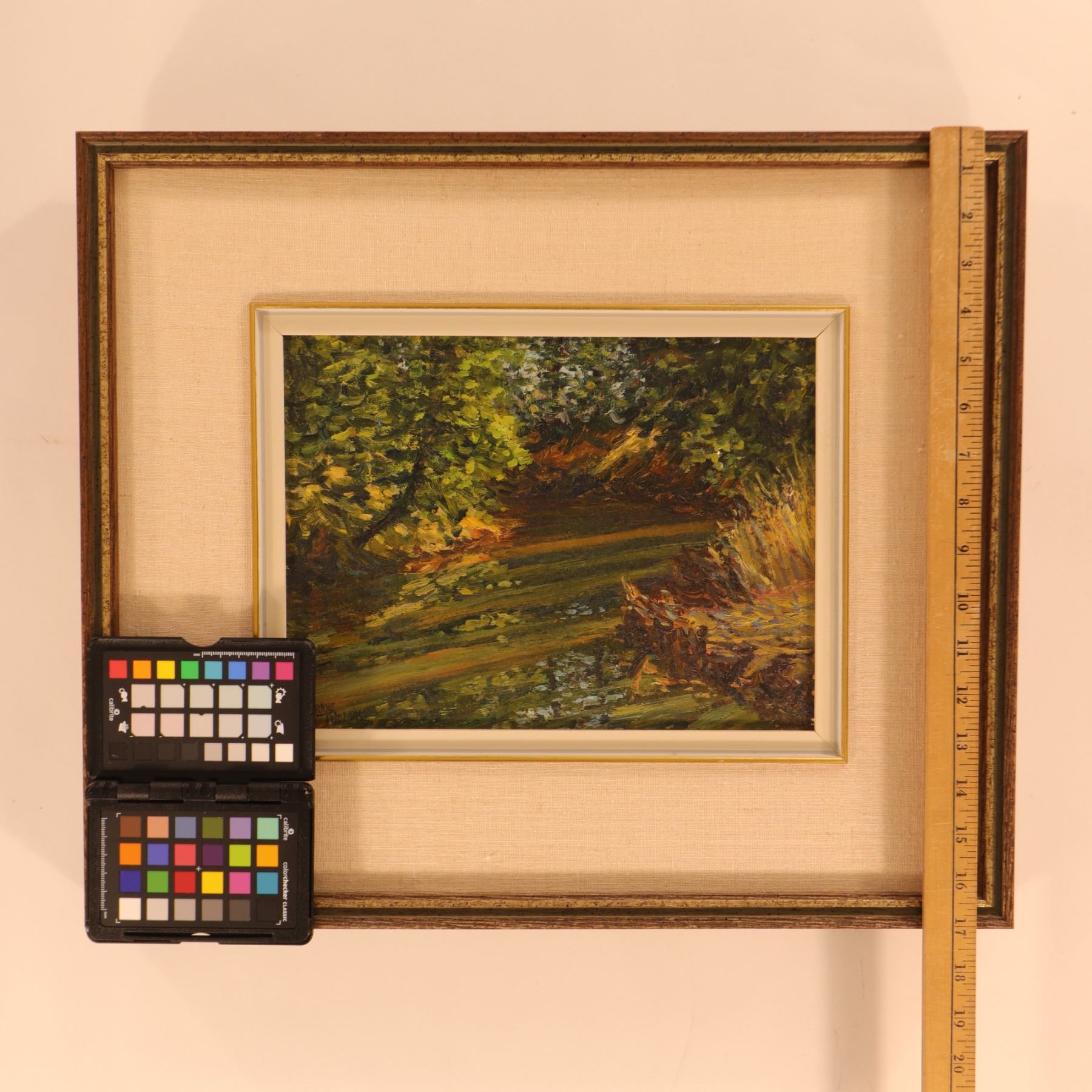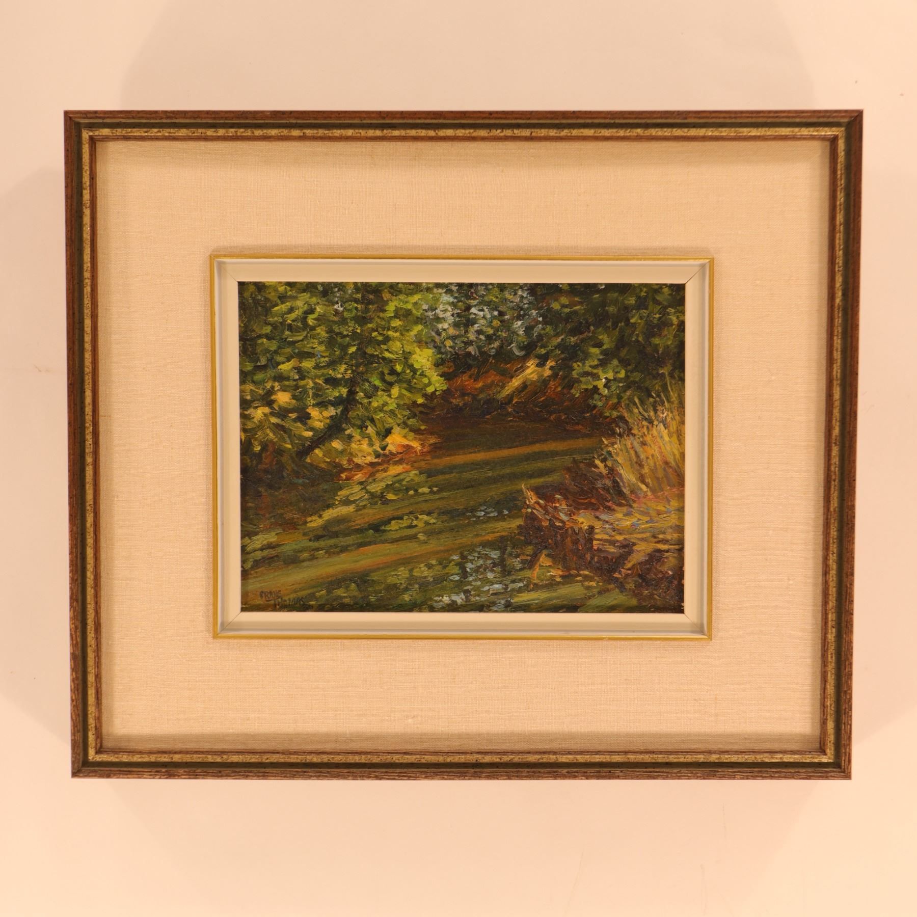 Signed landscape painting on board depicting a shaded woodland stream or marshy watercourse bordered by dense foliage and tall grasses. The composition is handled in a loose, richly textured manner, with broken brushwork and deep green, ochre, brown, and amber tones creating a strong sense of filtered light and undergrowth. The intimate scale and close-cropped viewpoint give the work a quiet, immersive character, focusing on reflection, shadow, and the movement of light across the water. Signed lower left. Art 12 x 9 in.; framed approximately 20 x 17 in.
