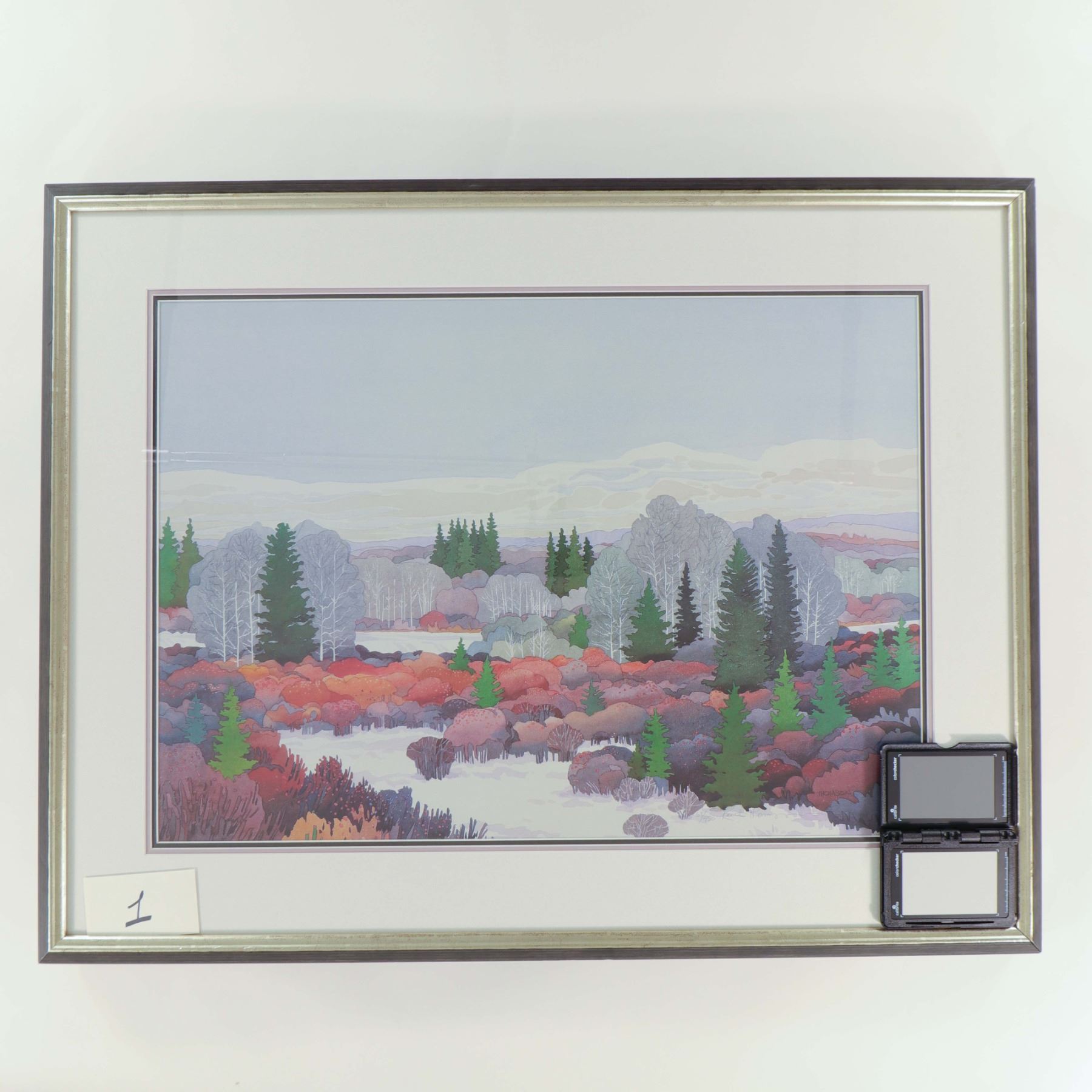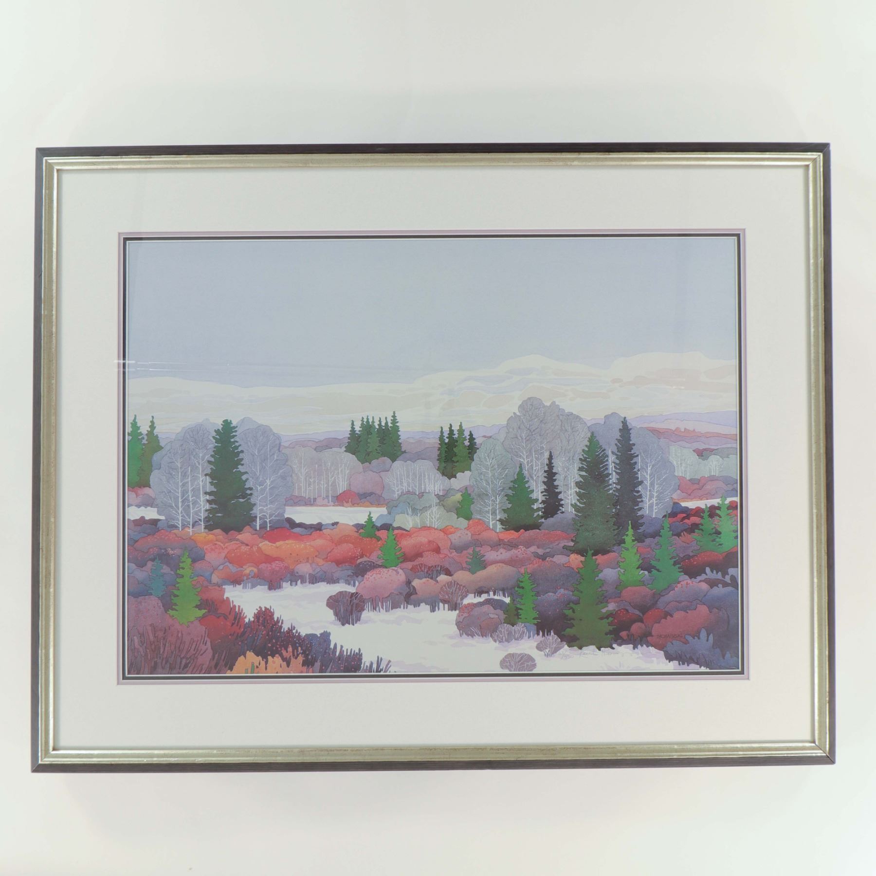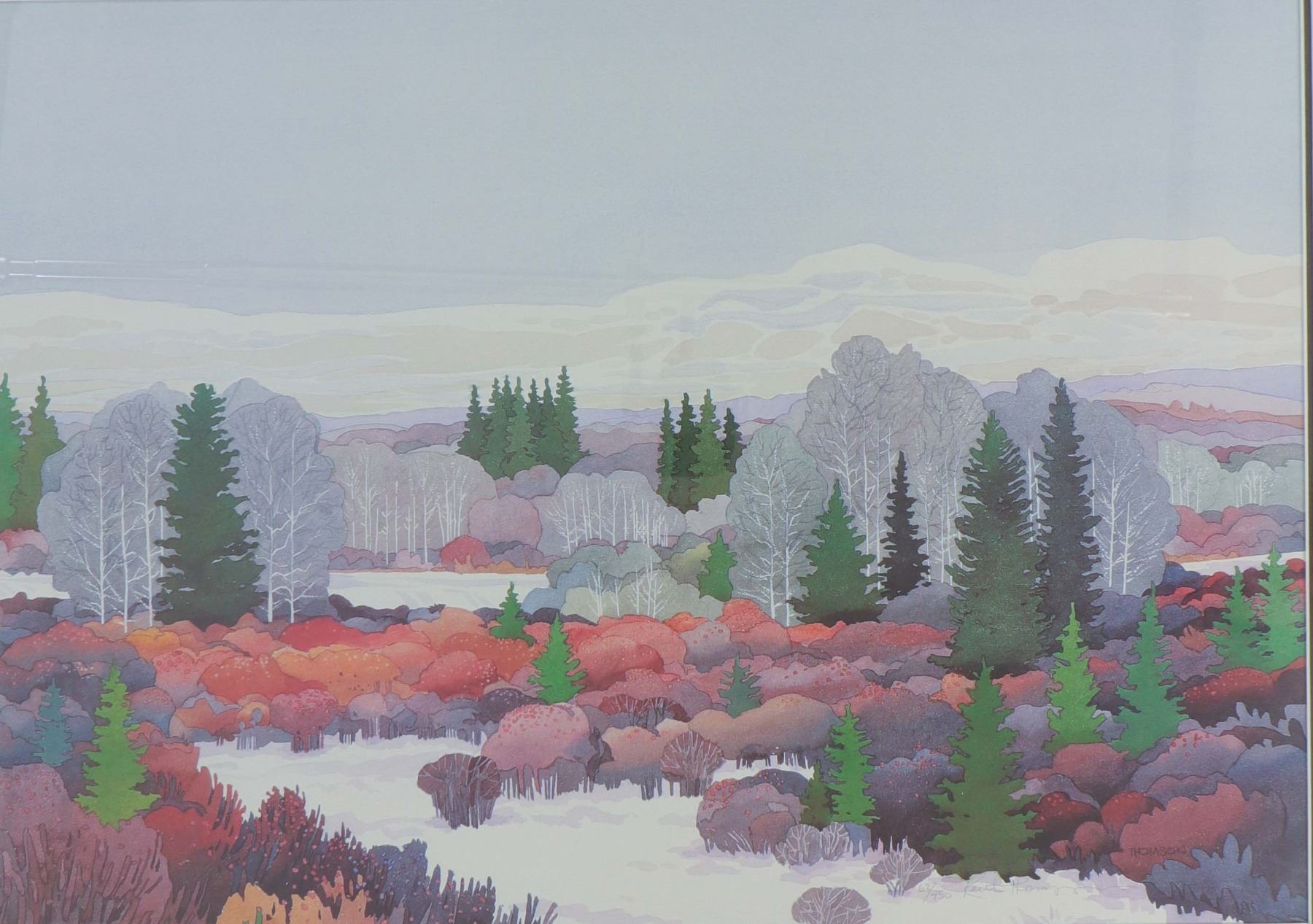 Artist-signed limited-edition colour print on paper, numbered 62/450, titled First Snowfall, dated 1989. The composition presents a wide prairie and foothill landscape at the onset of winter, with pale snow settling among shrubs and low brush in tones of mauve, rose, violet, grey, and muted green, punctuated by dark spruce and leafless poplars beneath a cool overcast sky. The panoramic format and restrained palette suit the subject especially well, giving the scene a quiet seasonal atmosphere typical of Thomson’s Western Canadian landscape imagery. Presented under glass in a silver-tone frame. Approximate image size 28 x 20 in.; framed size 32 x 24 in.