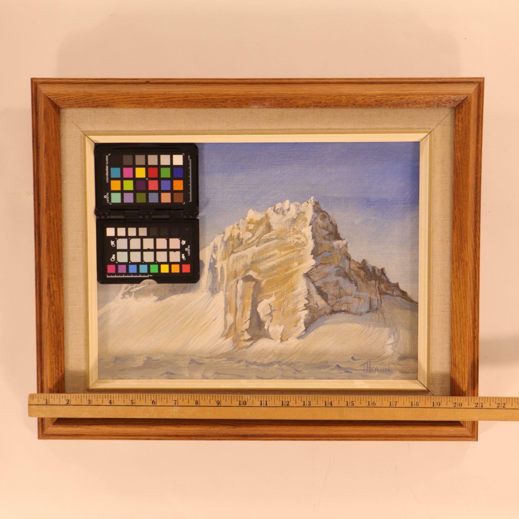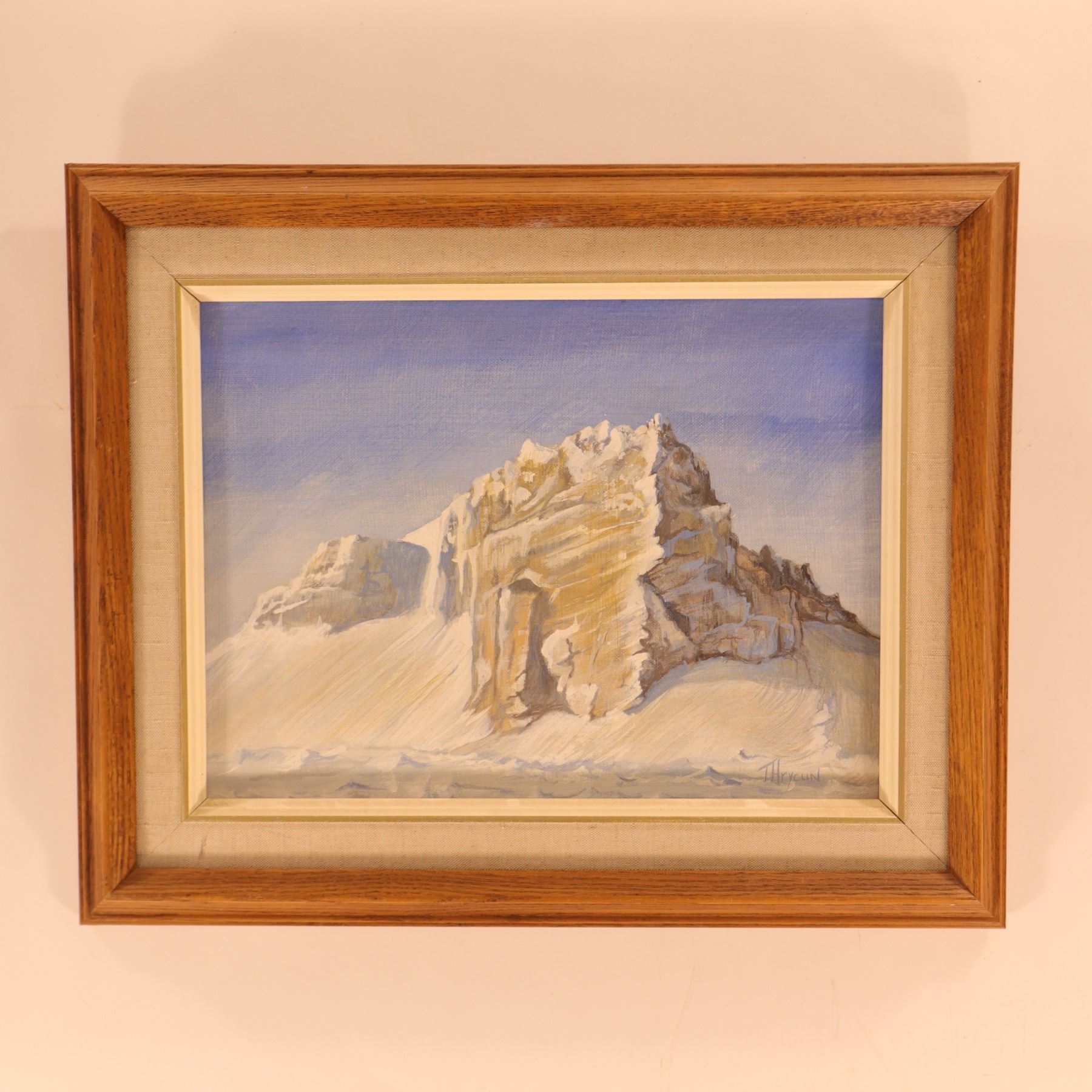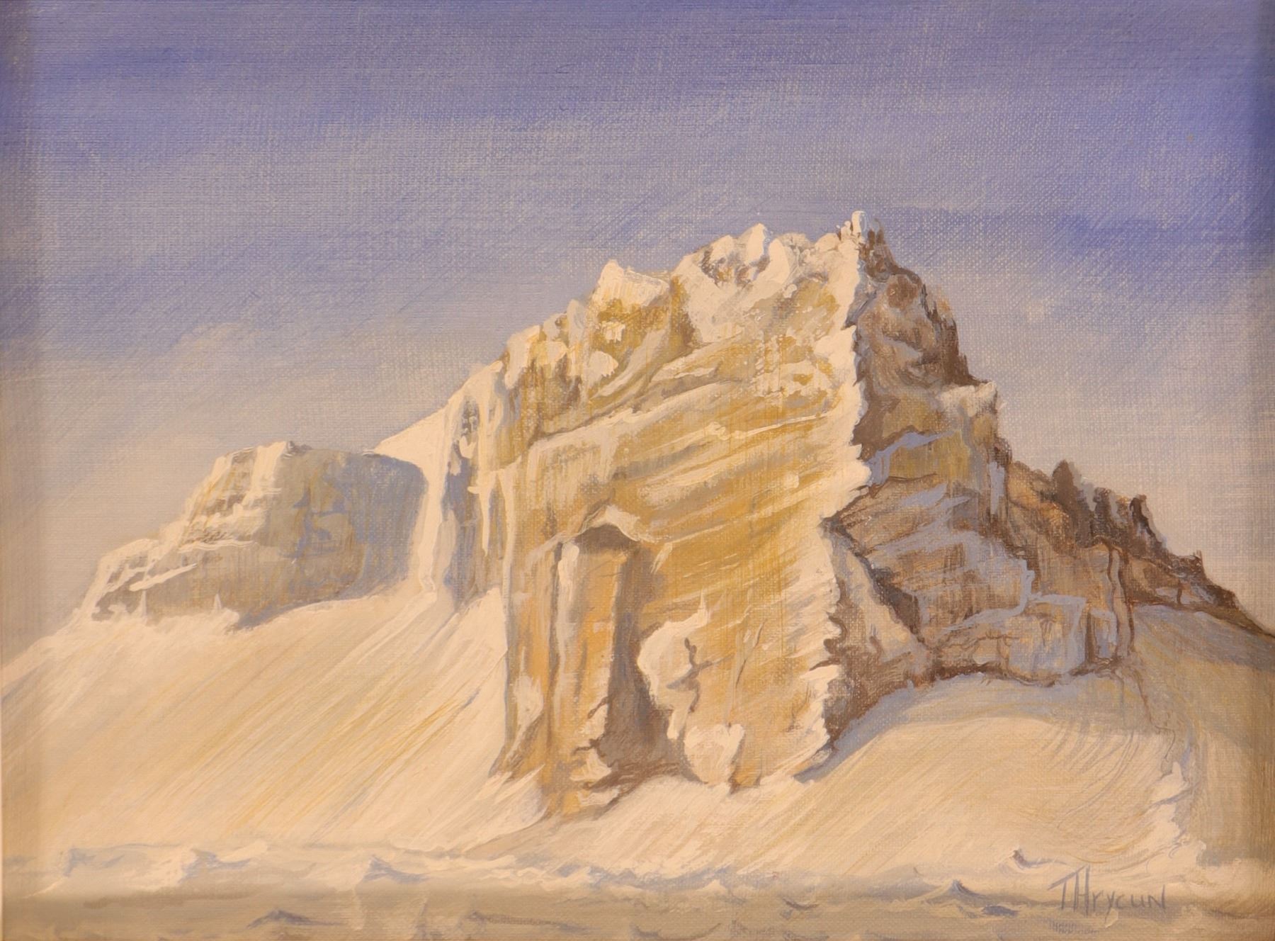 Signed lower right T. Hrycun, this Rocky Mountain landscape shows a stark snowbound massif rising from a pale, wind-swept foreground beneath a clear blue sky. The composition is simplified and sculptural, focusing on the angular planes of the rock face and the contrast between warm ochre stone and cool blue-white snow. The restrained palette and open space give the work a quiet, modern western character. Verso inscribed “The Rock.” Art approximately 16 x 12 in.; framed 21 x 17 in.