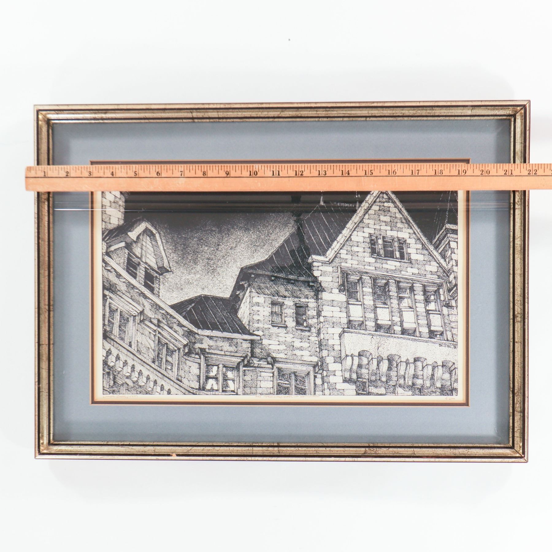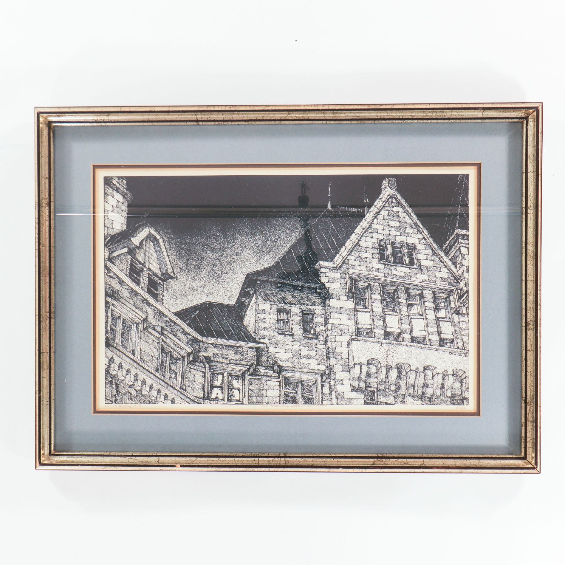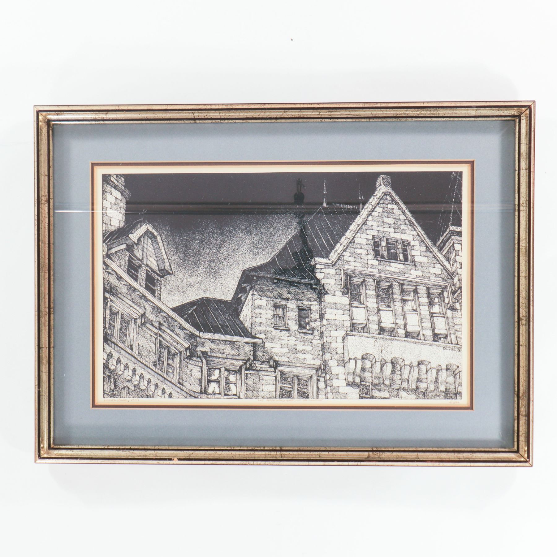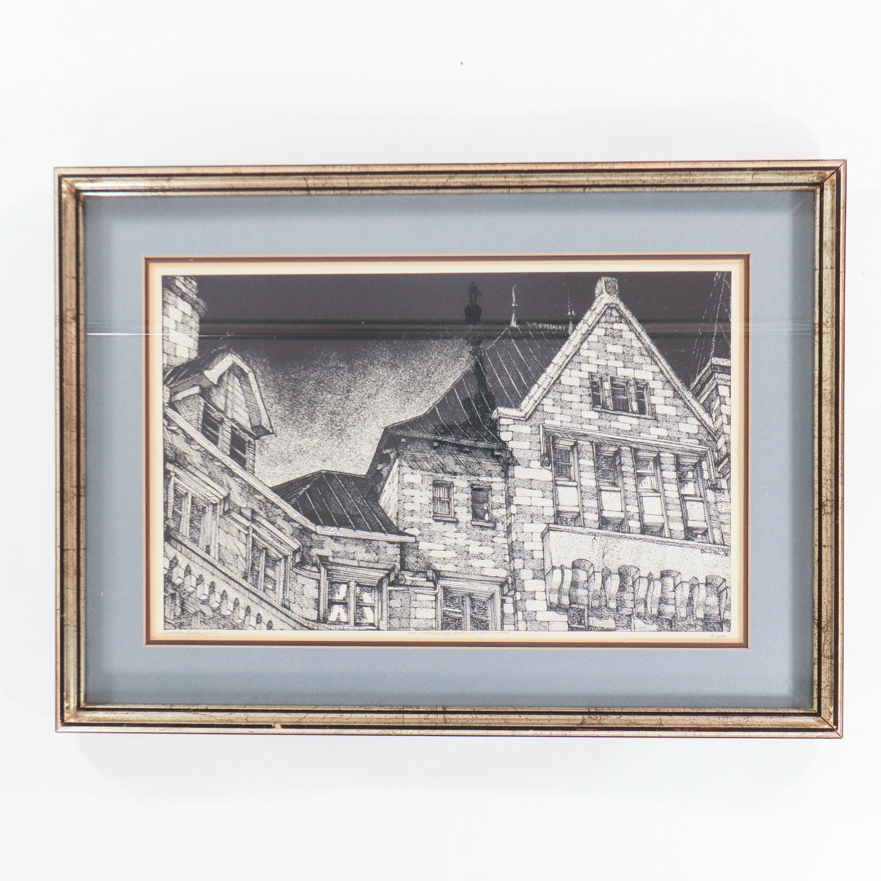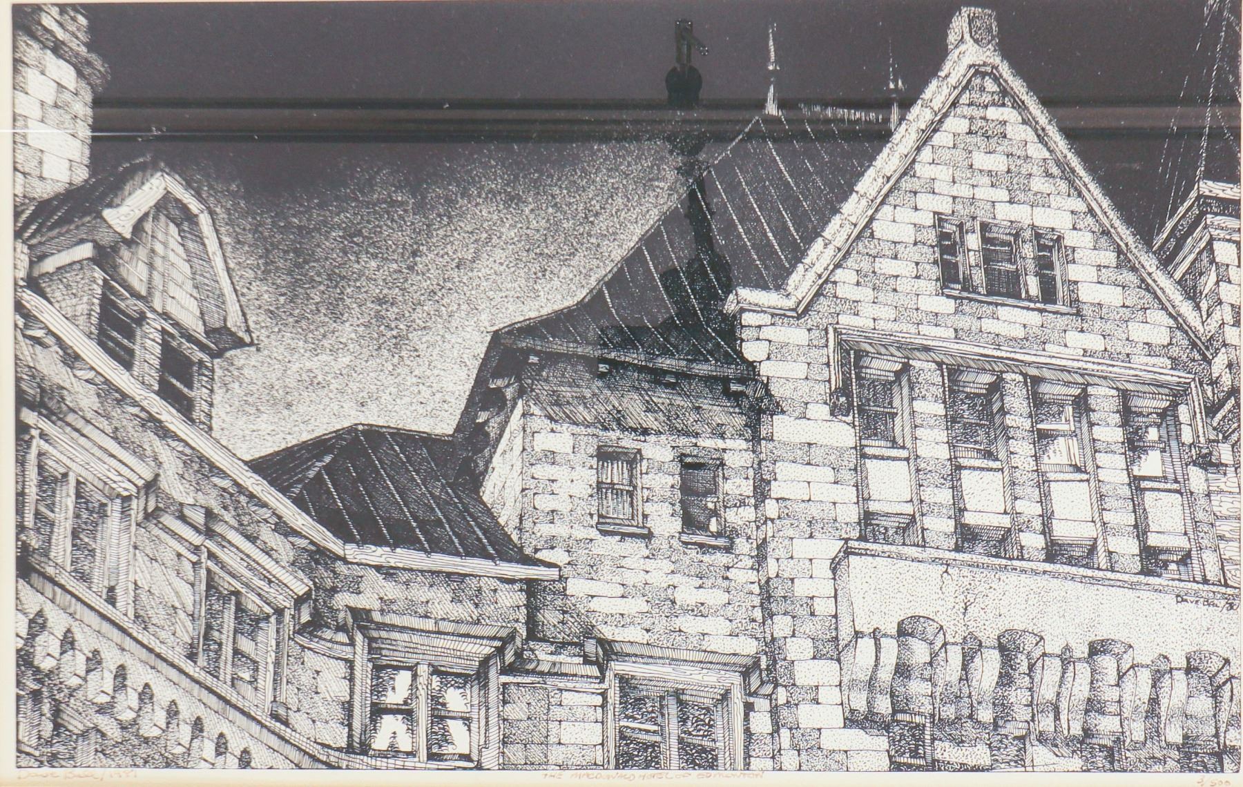 Artist-signed serigraph on paper, dated 1981 and numbered 3/500, depicting a dramatic close architectural view of Edmonton’s Hotel Macdonald. Executed in a crisp black-and-white graphic manner, the composition emphasizes the building’s steep gables, stone masonry, and window rhythm, giving the historic château-style landmark a strong sculptural presence. Presented under glass in a blue-grey mat and silver-toned frame. Image 17 x 11 in.; framed 22 x 16 in.