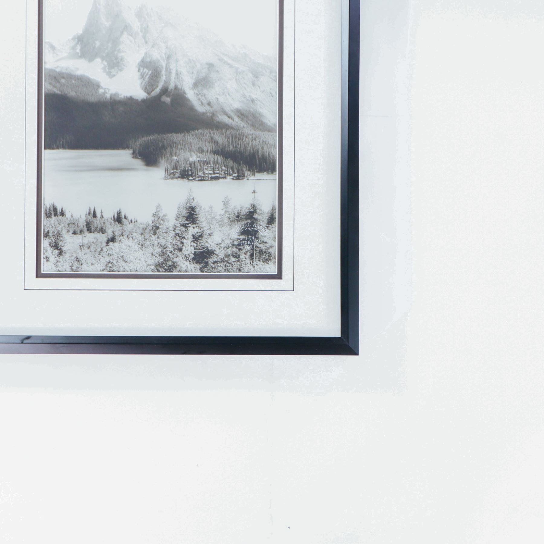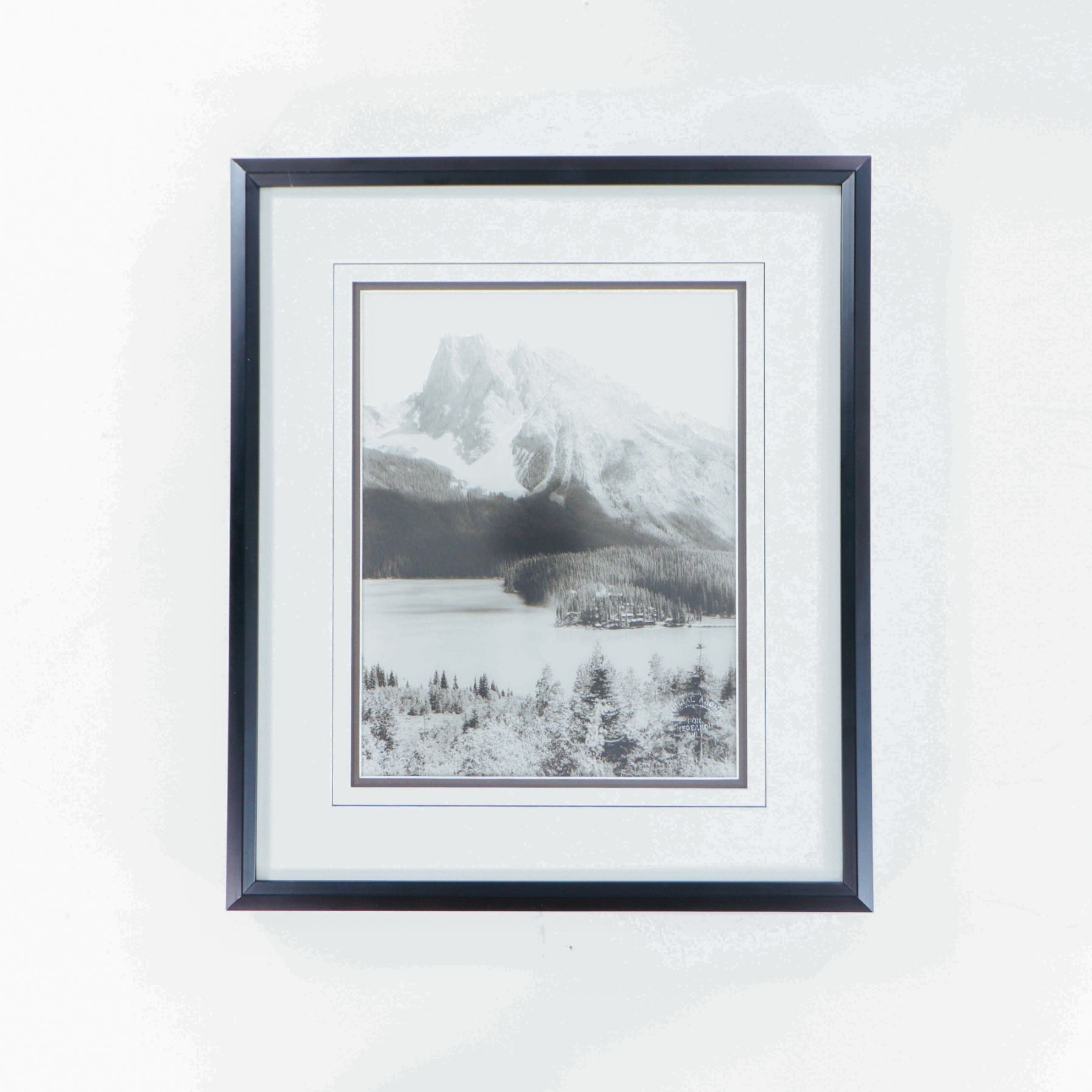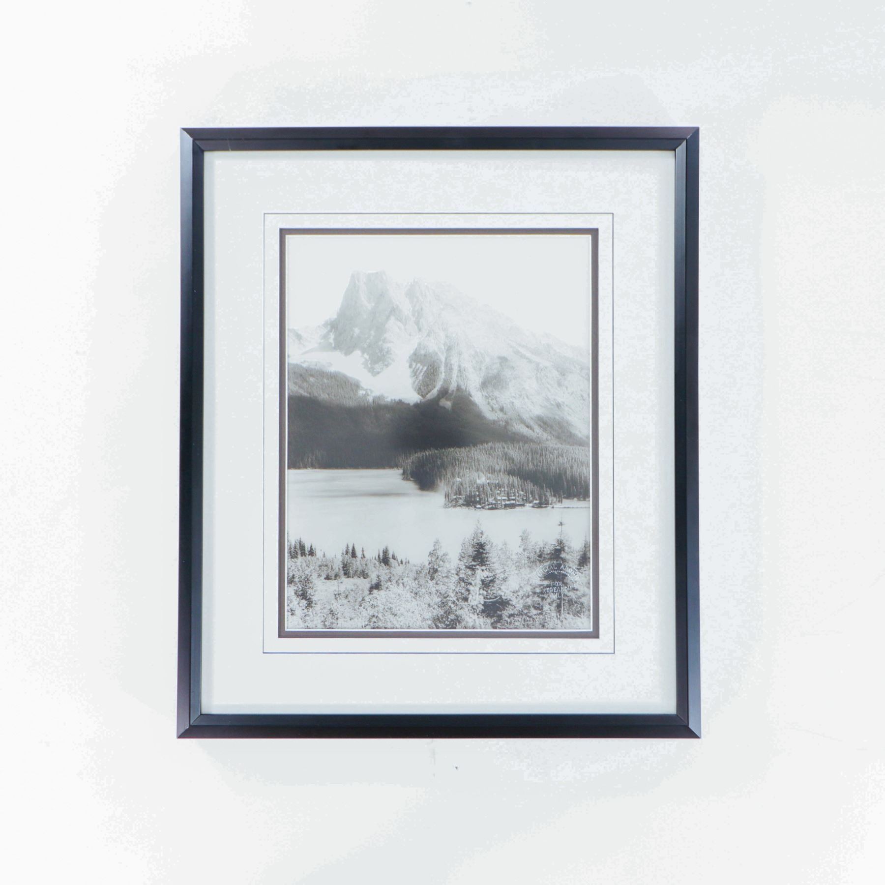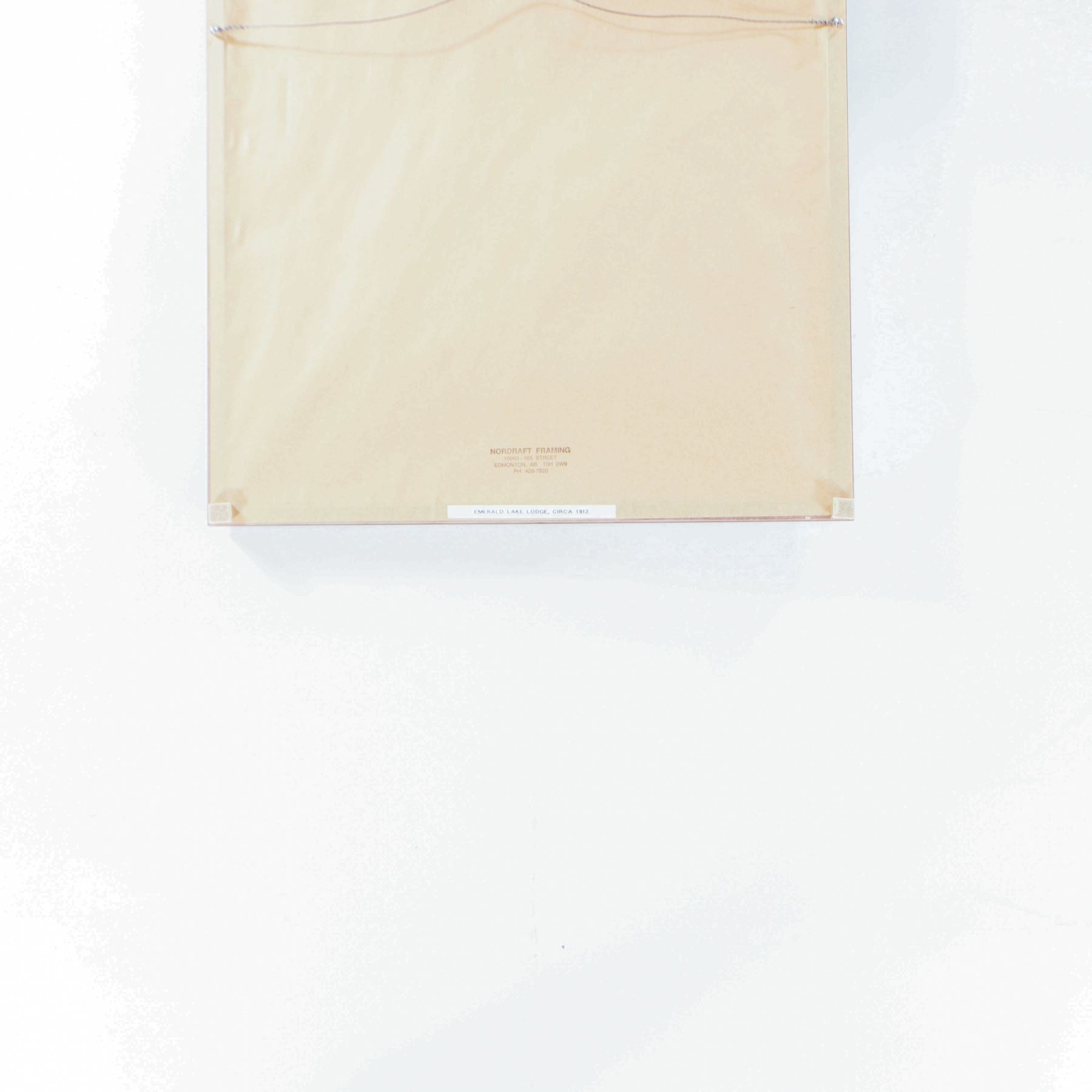 Framed black-and-white archival photographic reproduction showing Emerald Lake Lodge in the Canadian Rockies, with the caption strip verso reading “Emerald Lake Lodge, Circa 1912.” The image is presented under glass and bears an embossed lower-right stamp reading “Provincial Archives … For Research Only,” indicating it is an archive-issued reproduction rather than a period-original photograph. Verso with Nordraft Framing, Edmonton stamp. The lodge itself was established in 1902 by the Canadian Pacific Railway, so a circa-1912 view fits the site’s early resort history. Framed 18 x 20 in.; image 10.5 x 13.5 in.