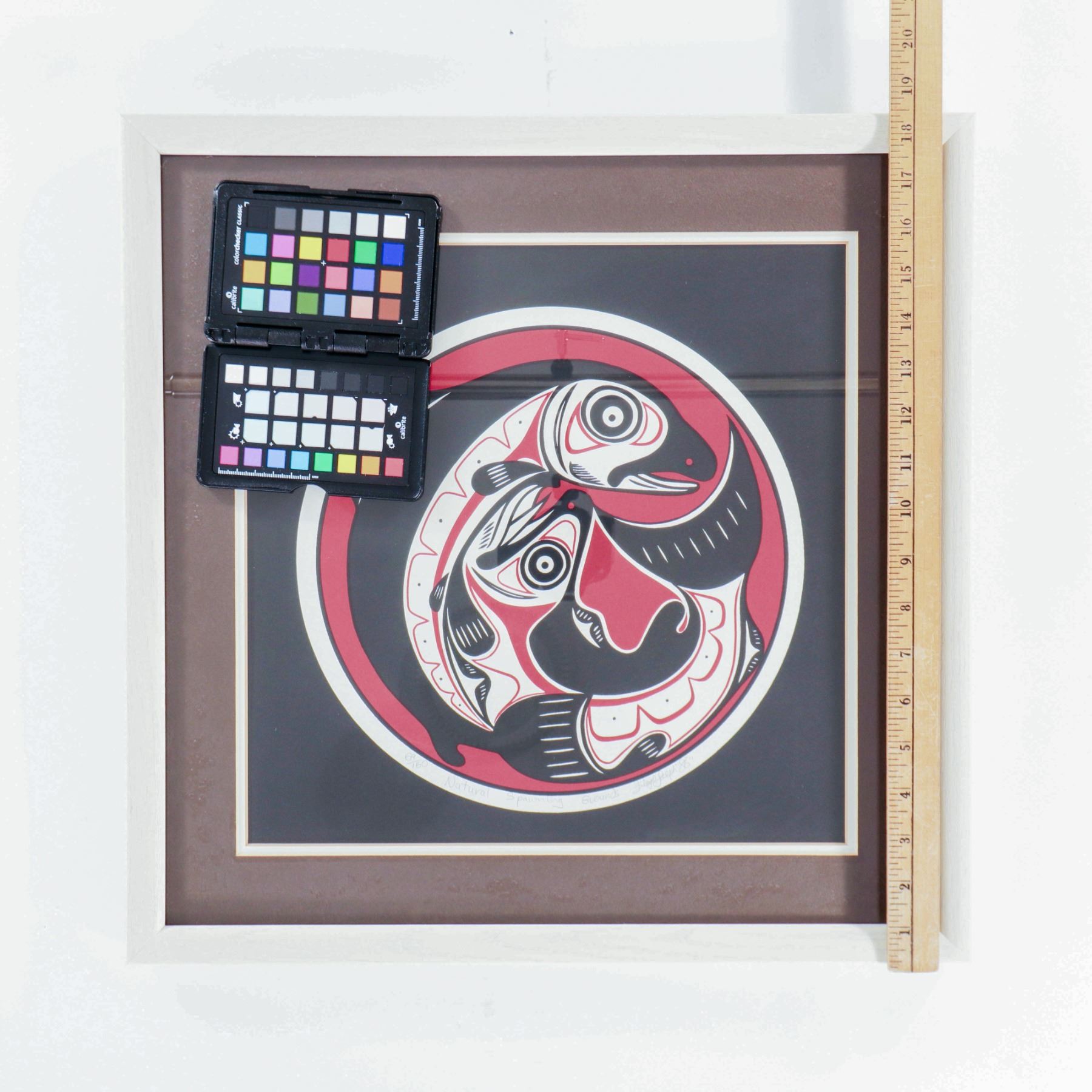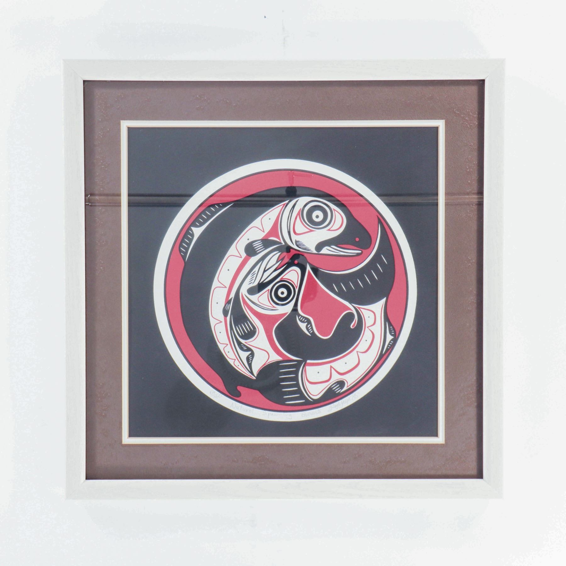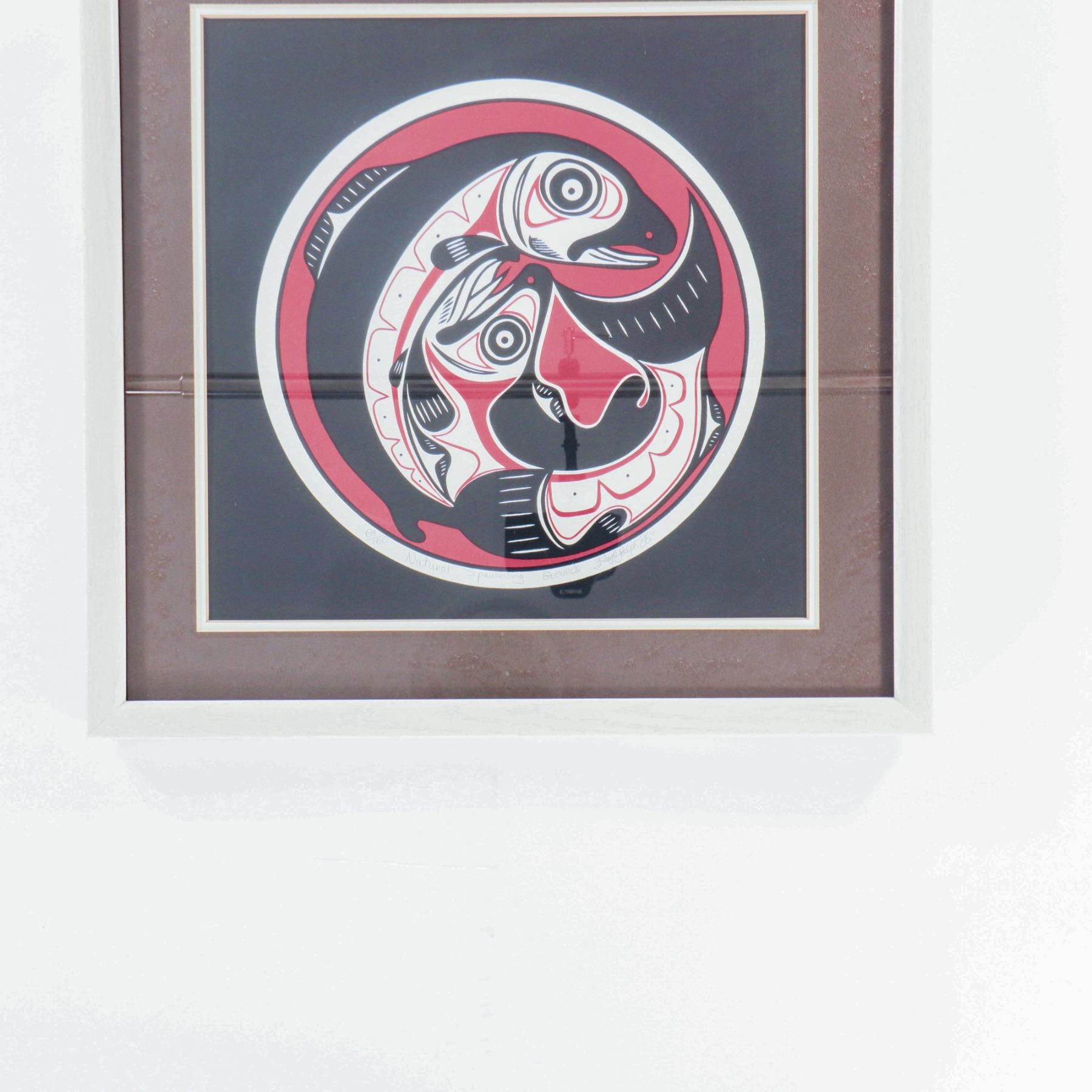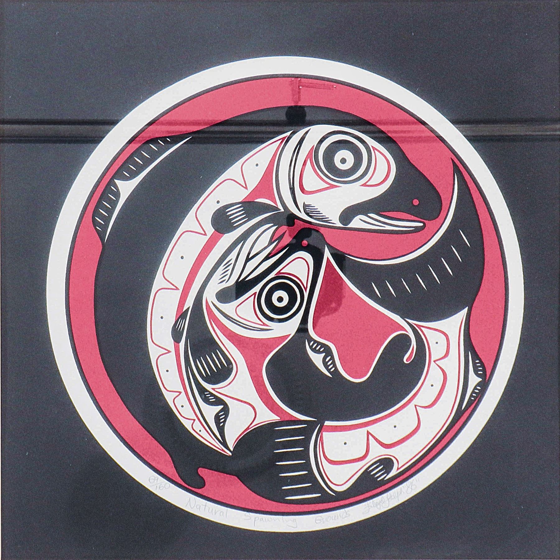Signed, titled, dated 1986, and numbered 69/160 along the lower margin, this Northwest Coast print depicts two salmon arranged in a circular, interlocking design in black, white, and vivid red. The composition is strongly graphic and emblematic, with flowing formline structure and a balanced rotational movement that suits the spawning theme especially well. The title Natural Spawning Grounds and the edition number match a recent Kastner listing for the same work, confirming the attribution and subject. Presented under glass in a square frame. Art 13 x 13 in.; framed 18.5 x 18.5 in.
