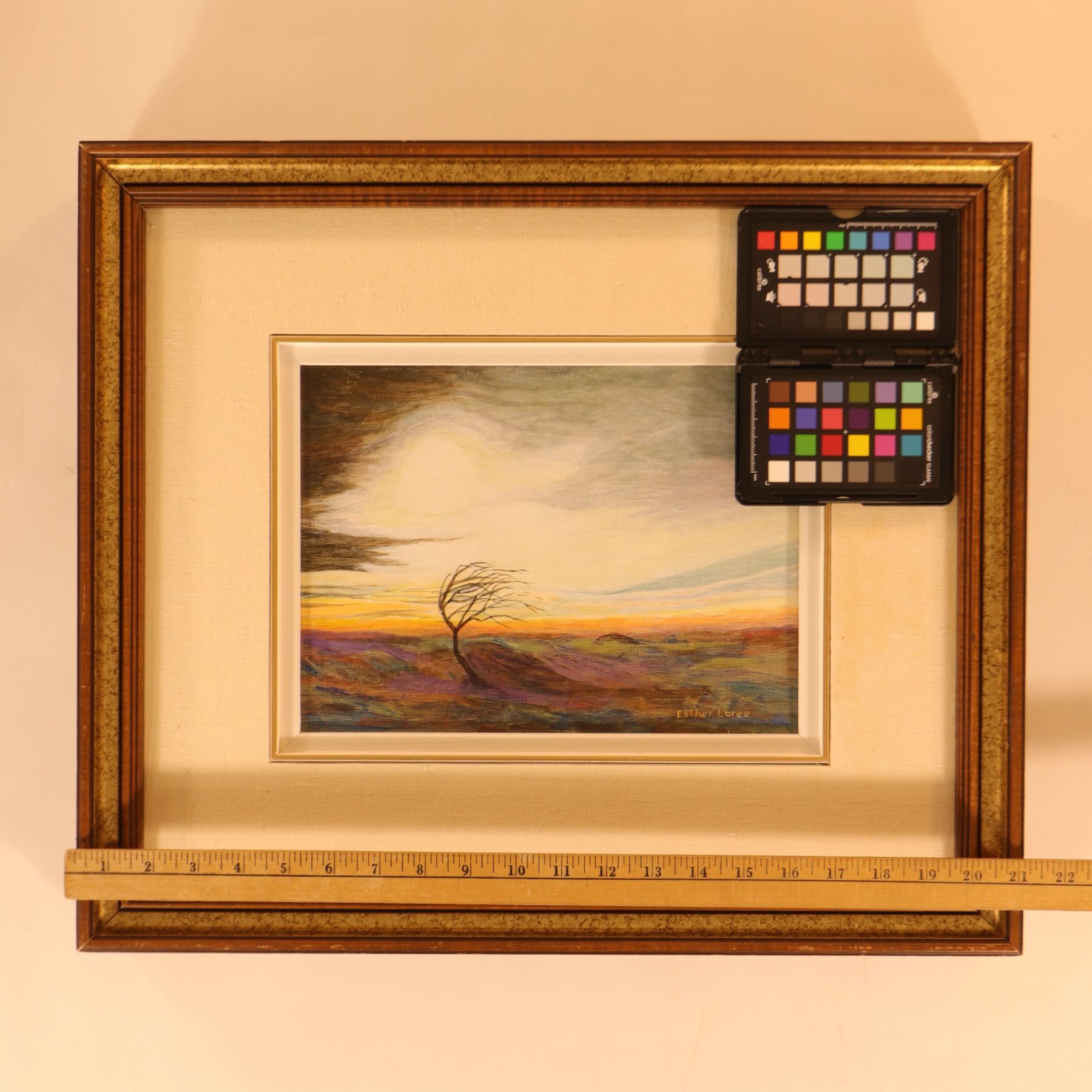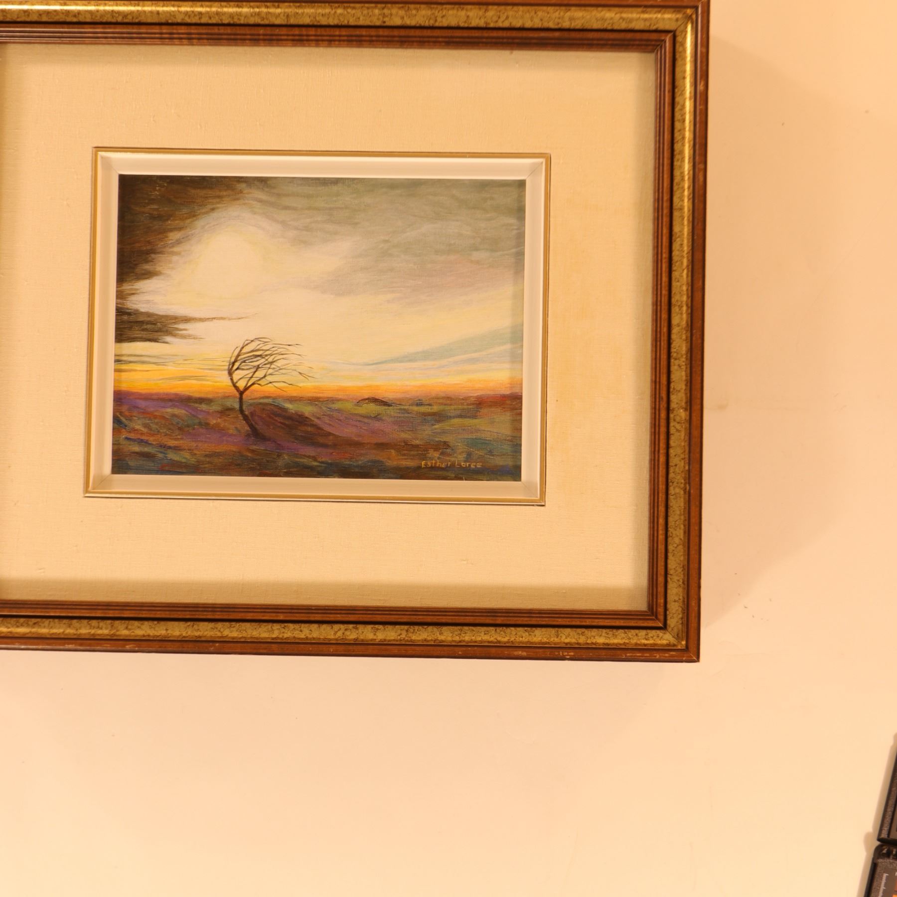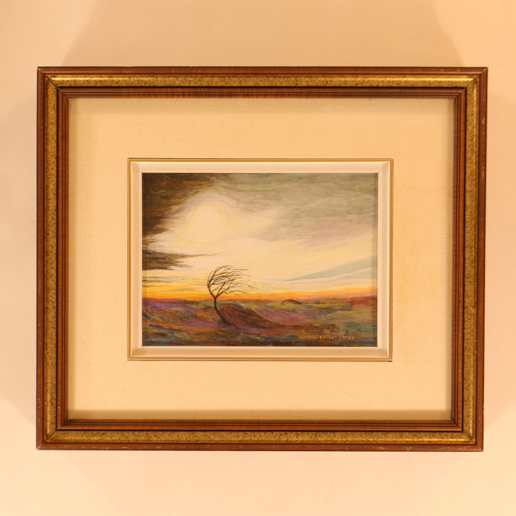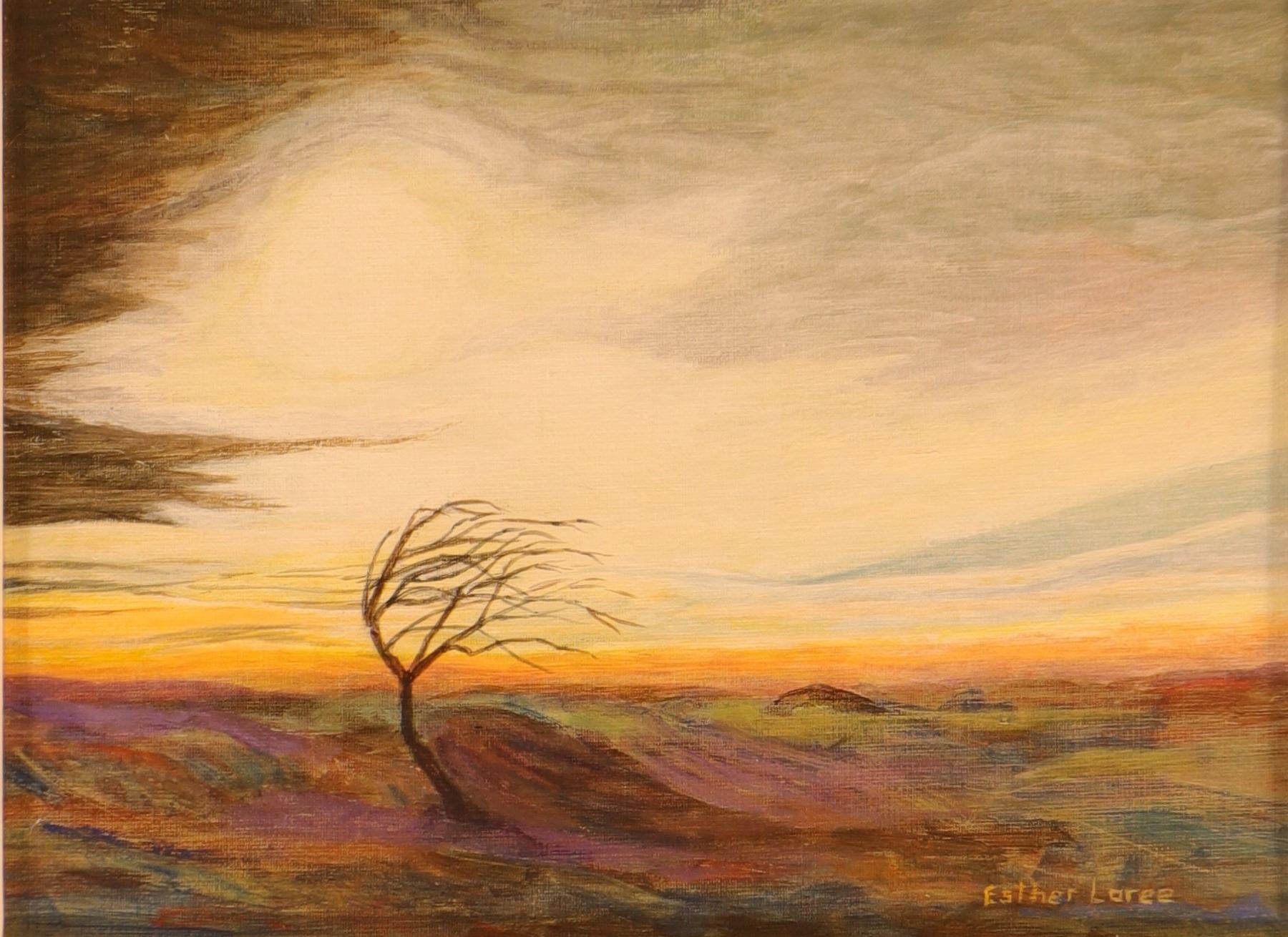 Signed lower right Esther Loree, this small acrylic landscape depicts a lone wind-bent tree across an open, rolling horizon under a broad, light-filled sky. The composition is atmospheric and expressive rather than strictly topographical, using soft veils of mauve, violet, blue, ochre, and grey to suggest movement, weather, and fading light. The verso is inscribed “Tossed About / acrylic / by Esther Loree / $40.00,” which gives the work its title and confirms the medium. Framed approximately 21 x 18 in.; visible art approximately 12 x 9 in.