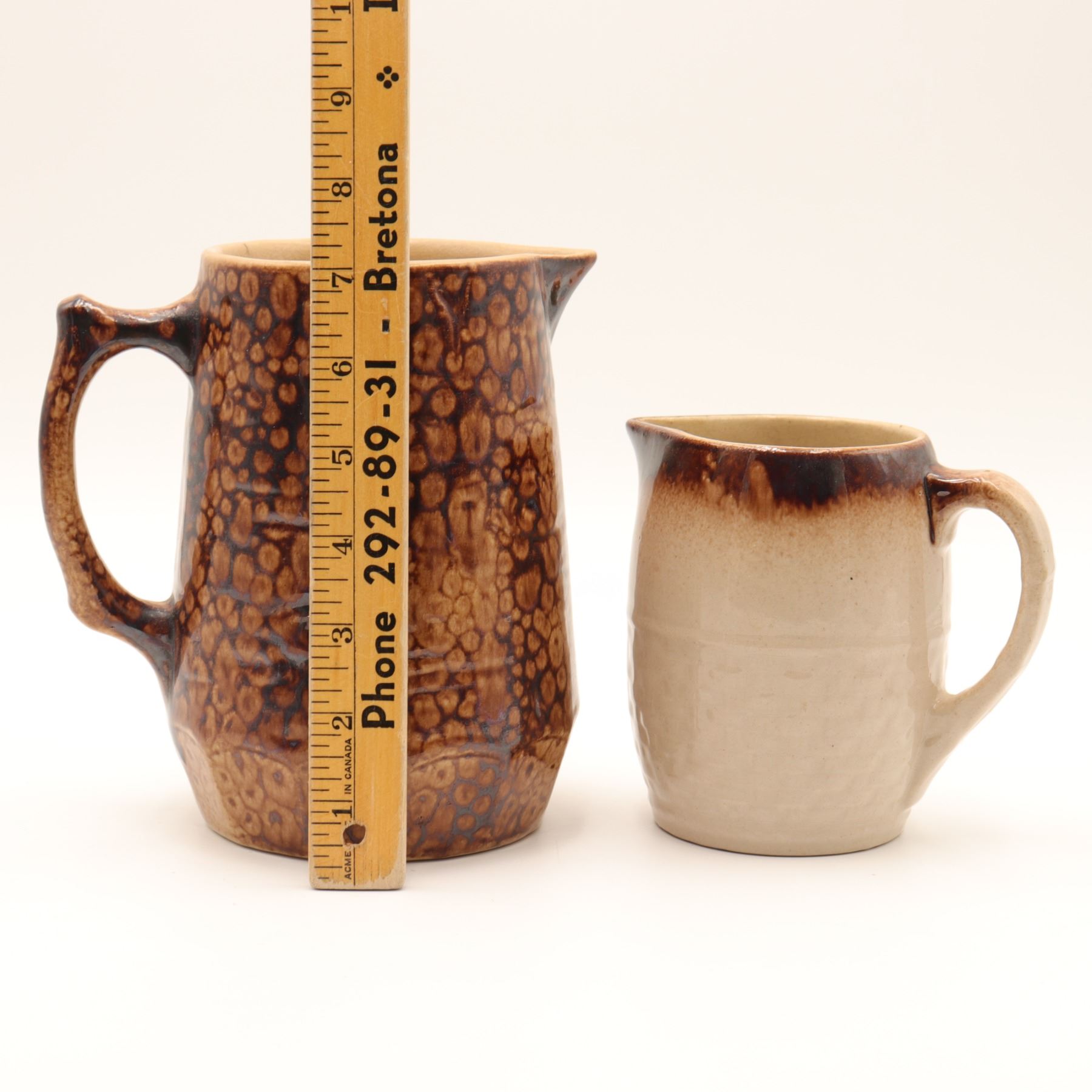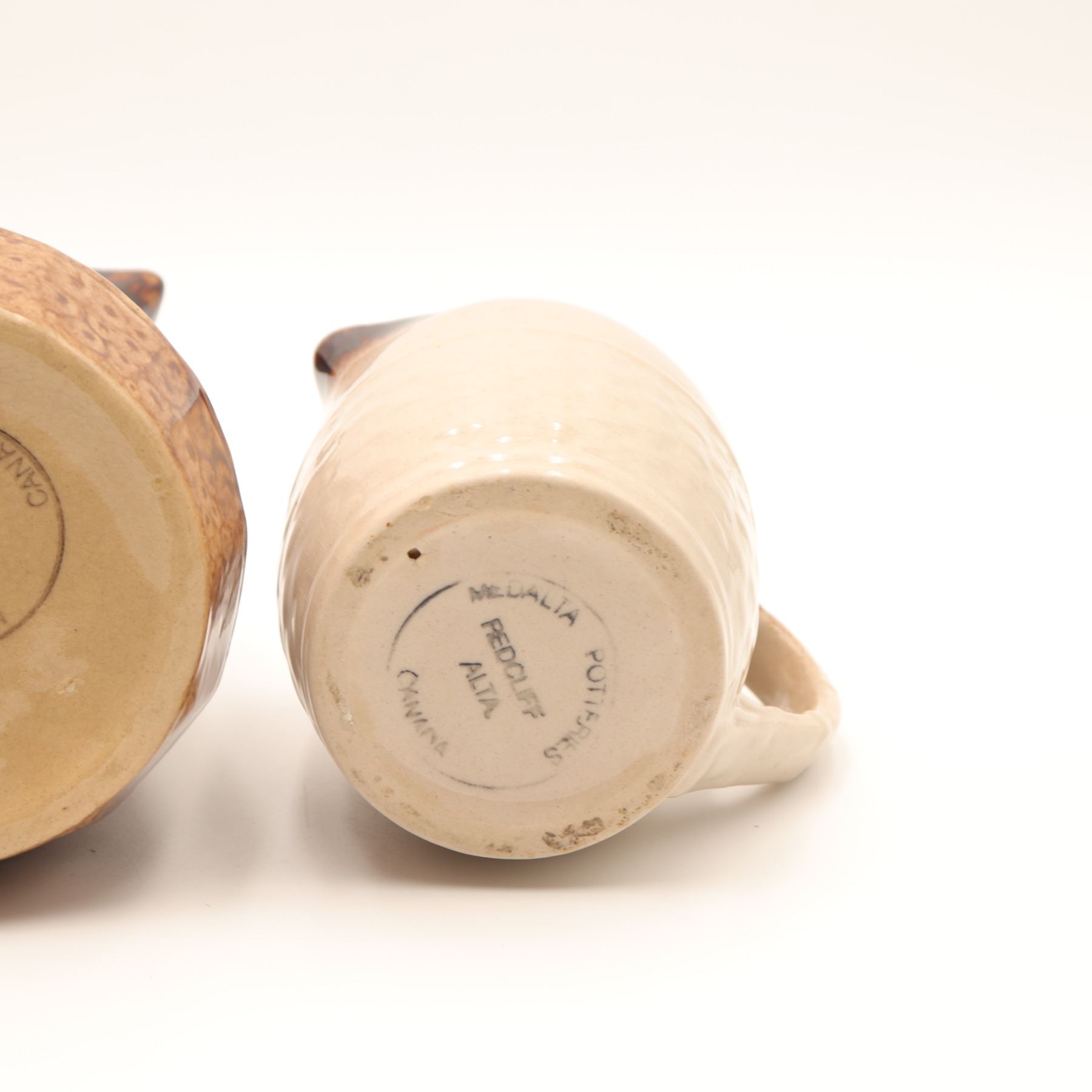 A pair of Canadian glazed pottery pitchers by Medalta Potteries, Redcliff, Alberta, each with circular factory stamp to the underside. The lot comprises a larger buff-bodied serving pitcher with mottled brown, bark-like glaze and an angular applied handle, together with a smaller cream-bodied milk or cream jug with dark brown rim wash and loop handle. Though by the same Redcliff pottery, the differing forms and glaze treatments indicate an associated lot rather than an original matched pair. Circa 1966–1986. Good visual condition overall, with minor underside wear and manufacturing irregularities; no chips, cracks, or repairs observed