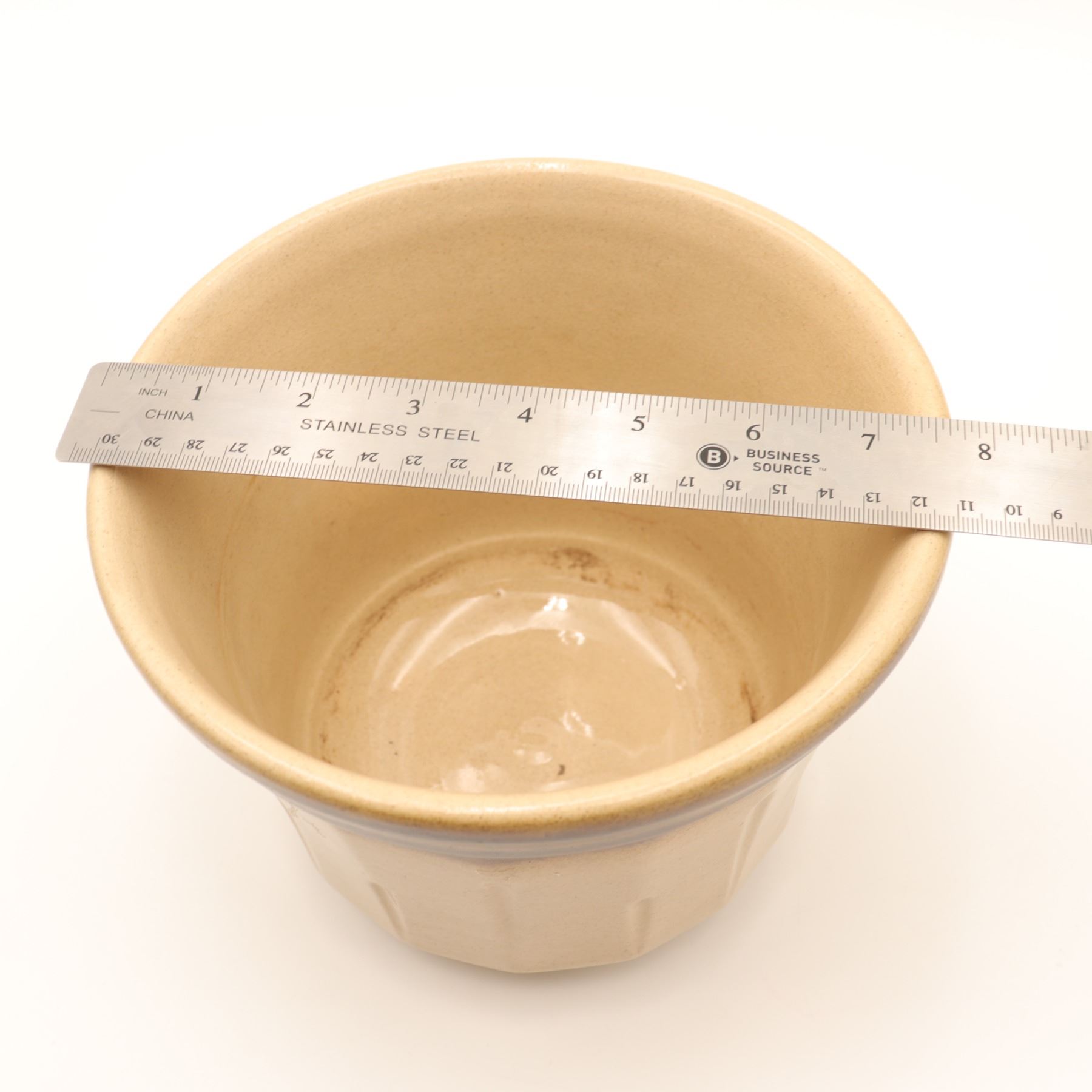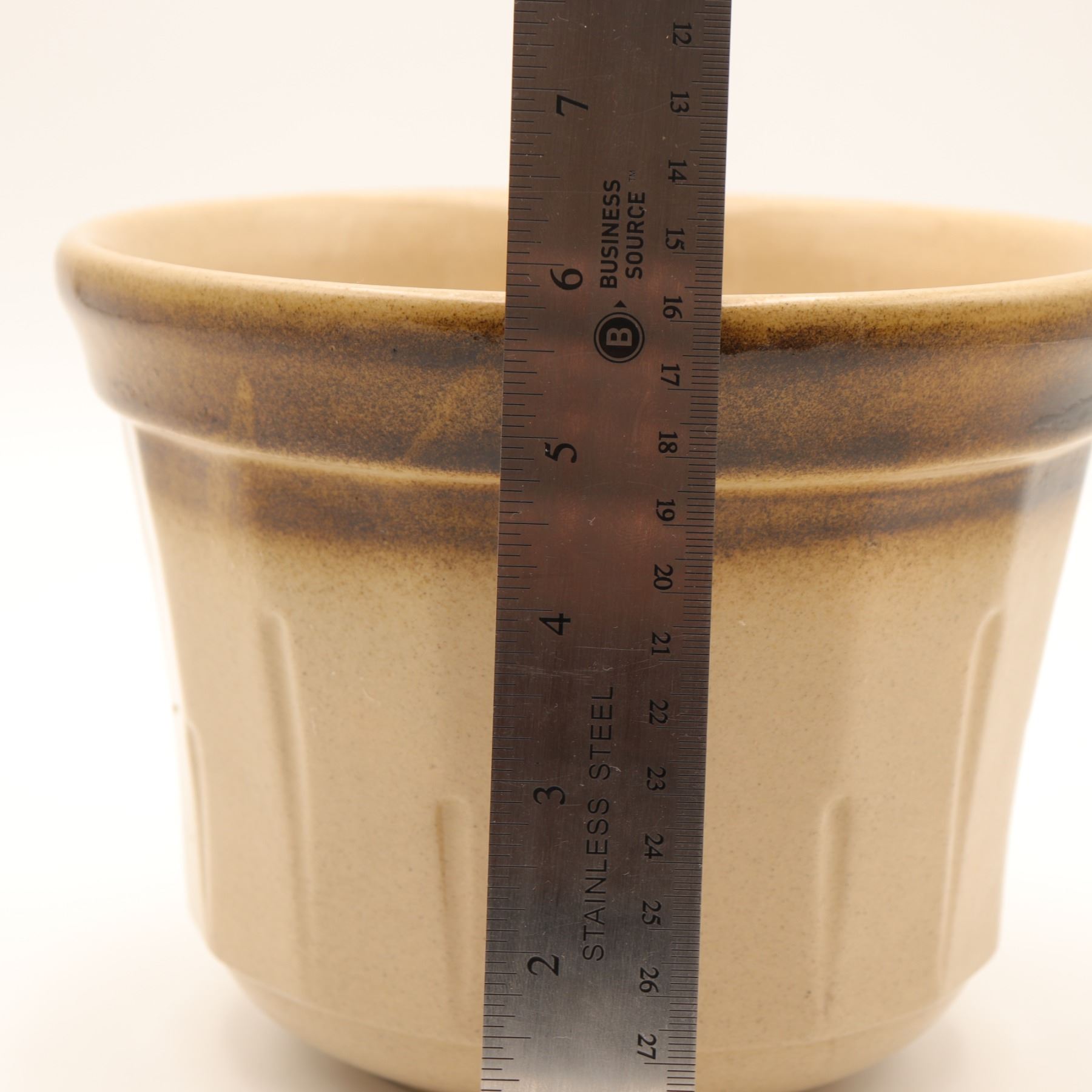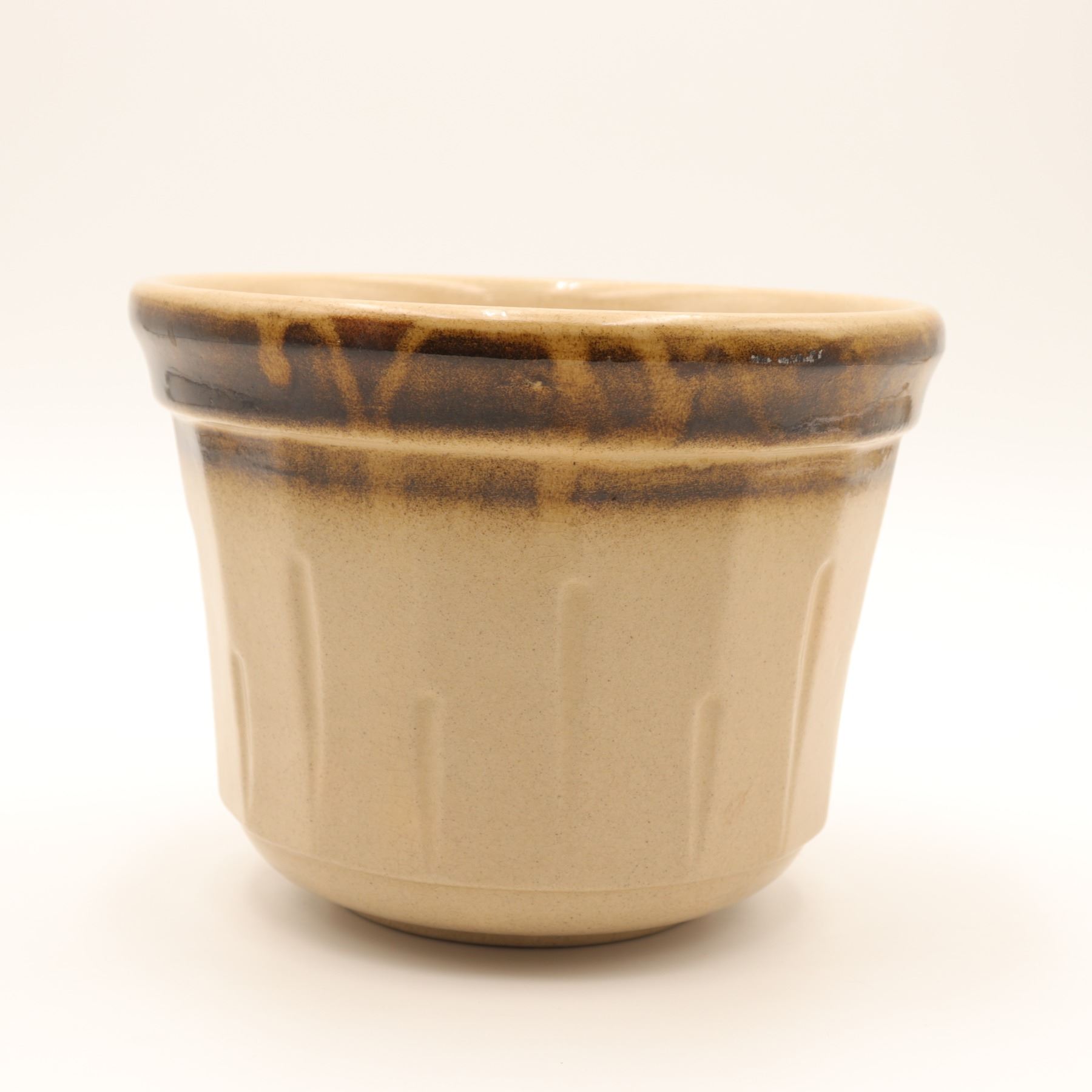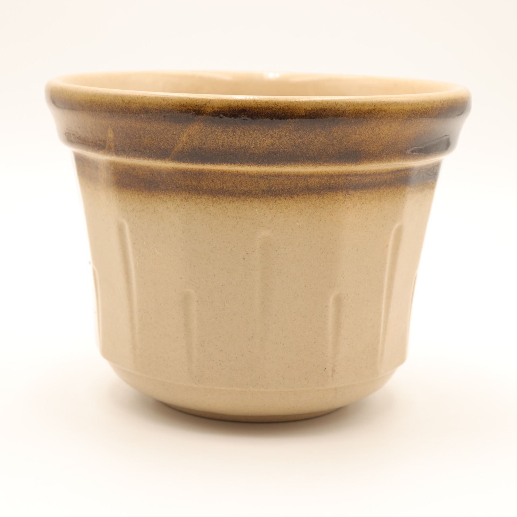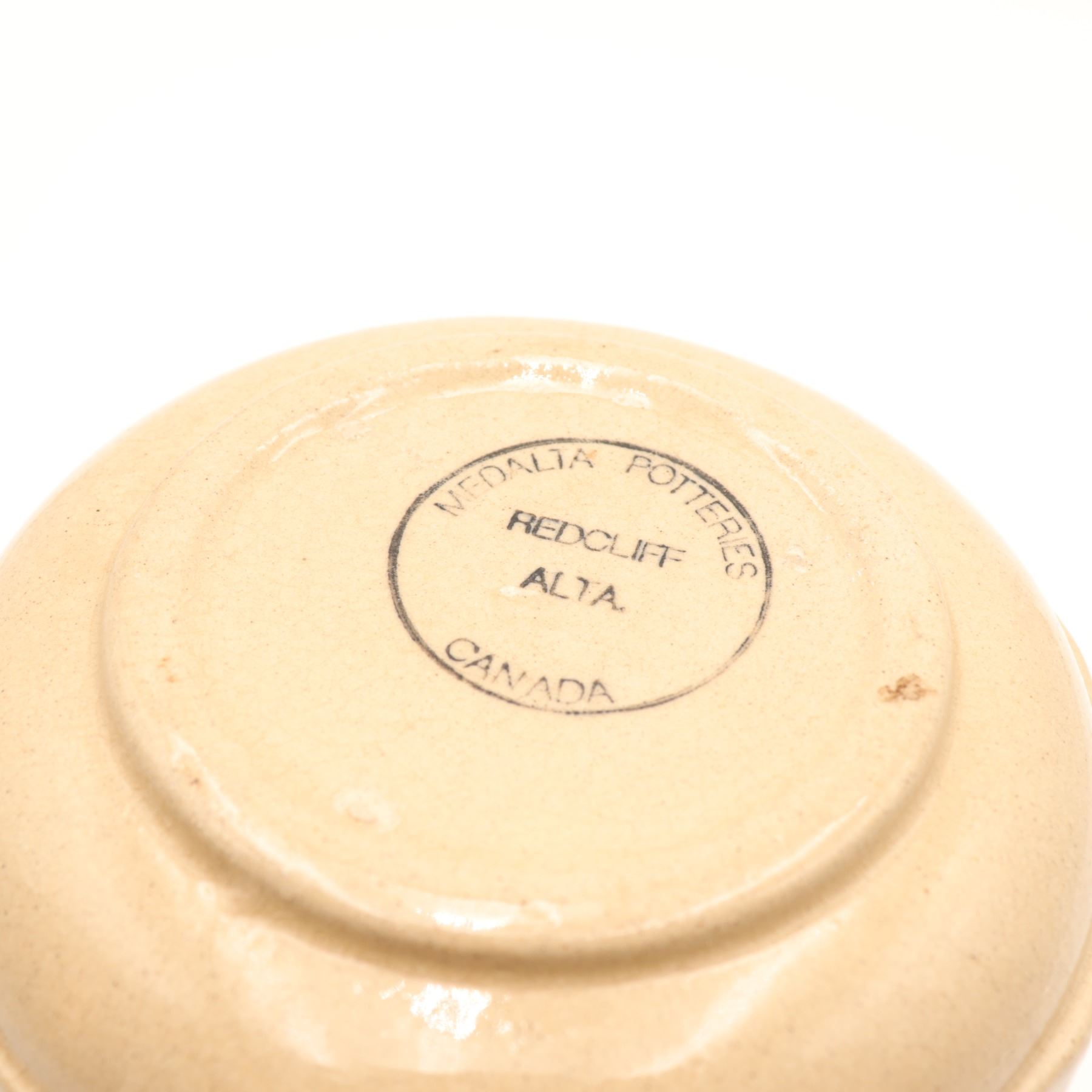 A Canadian glazed stoneware bowl by Medalta Potteries, Redcliff, Alberta, with circular factory stamp to the underside. The bowl is formed with a rolled rim, deep rounded body, and molded fluted sides, finished in a buff glaze with dark brown banding at the rim and shoulder. A practical later-20th-century Alberta pottery form with strong regional collecting interest and useful decorative presence. Good visual condition overall, with light underside wear and minor manufacturing irregularities; no chips, cracks, or repairs observed