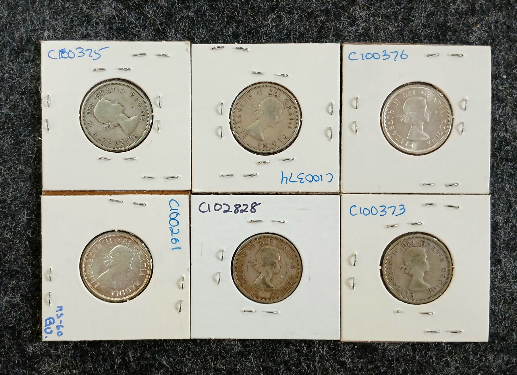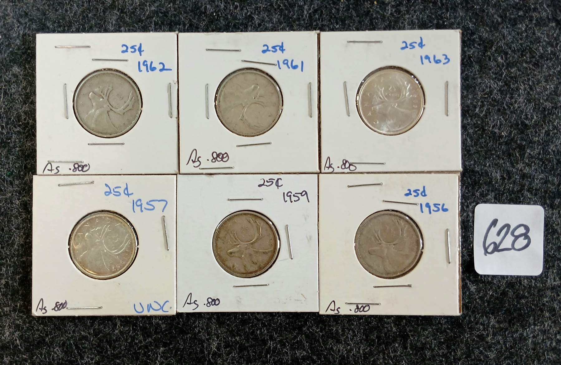 Lot 628 LOT OF 6 - 1956-1963 CDN 25 CENT COINS