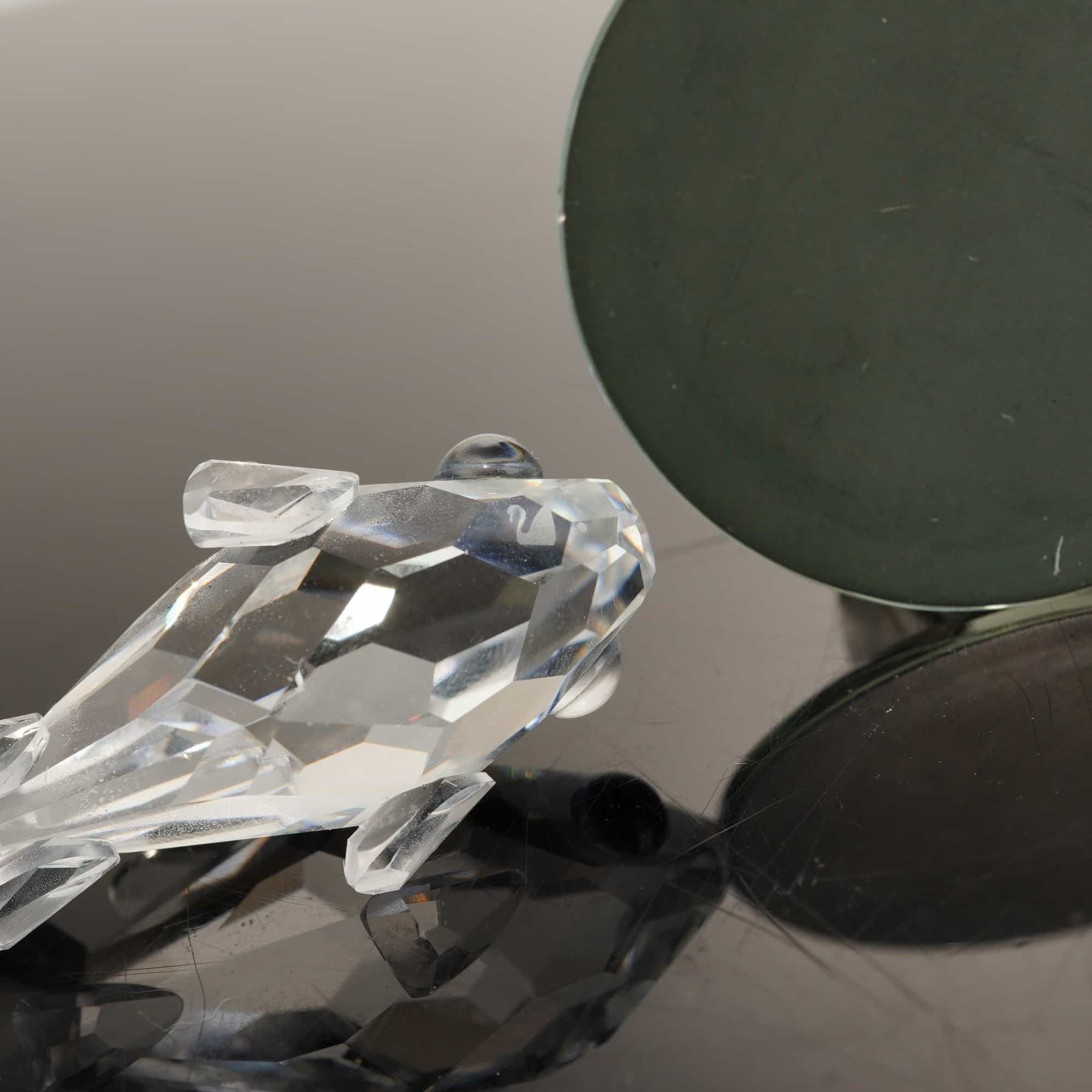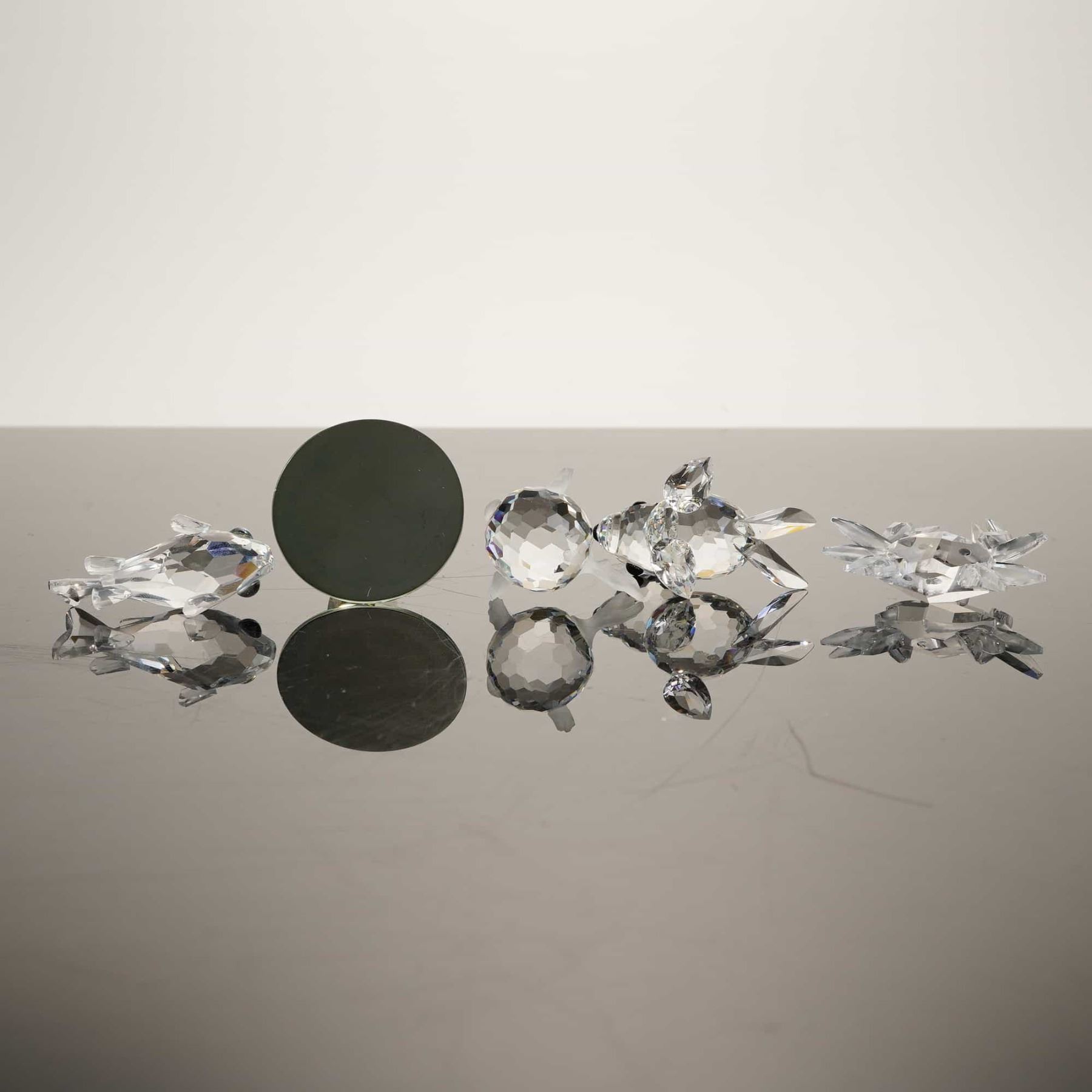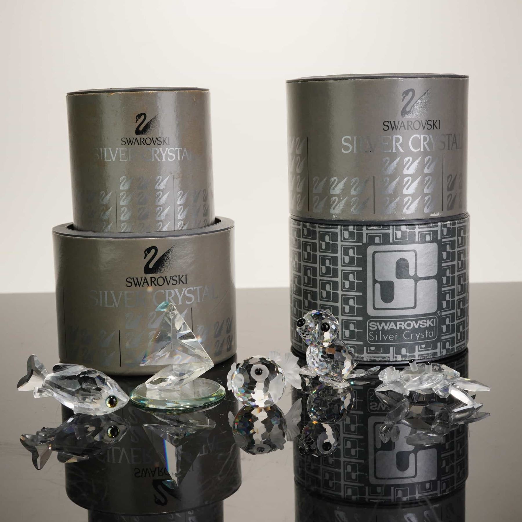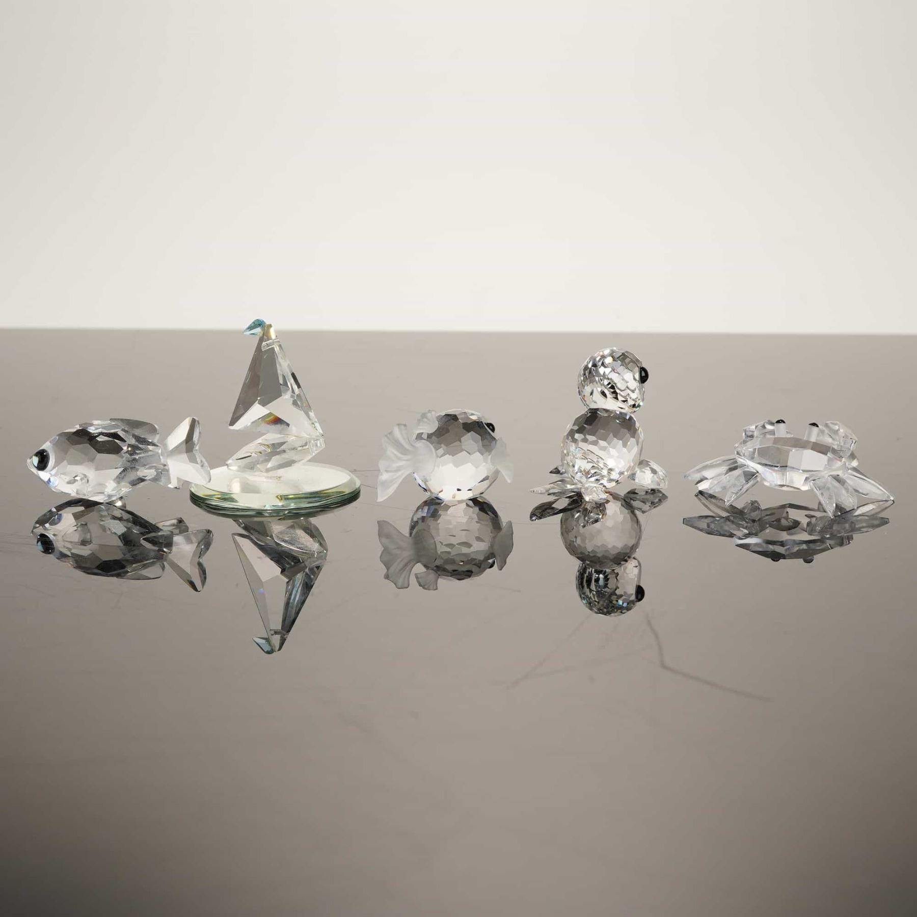 This collection features five crystal figurines with a seaside theme, including four authentic Swarovski Silver Crystal pieces and one unmarked item. The Swarovski figurines consist of a baby seal with black eyes and whiskers, a blowfish (pufferfish) with three frosted fins and black eyes, a goldfish (trout) with yellowish-green eyes, and a crab with black bead eyes on stalks. These pieces are crafted from hand-finished faceted lead crystal and are part of the "Aquatic Worlds" and "When We Were Young" series. The fifth item is an unmarked crystal sailboat from another manufacturer, featuring a faceted sail and hull with a frosted mast, mounted on a circular mirrored base. The lot includes four original grey Swarovski Silver Crystal cylindrical storage canisters with interior foam padding. Height of largest item: 3 inches.