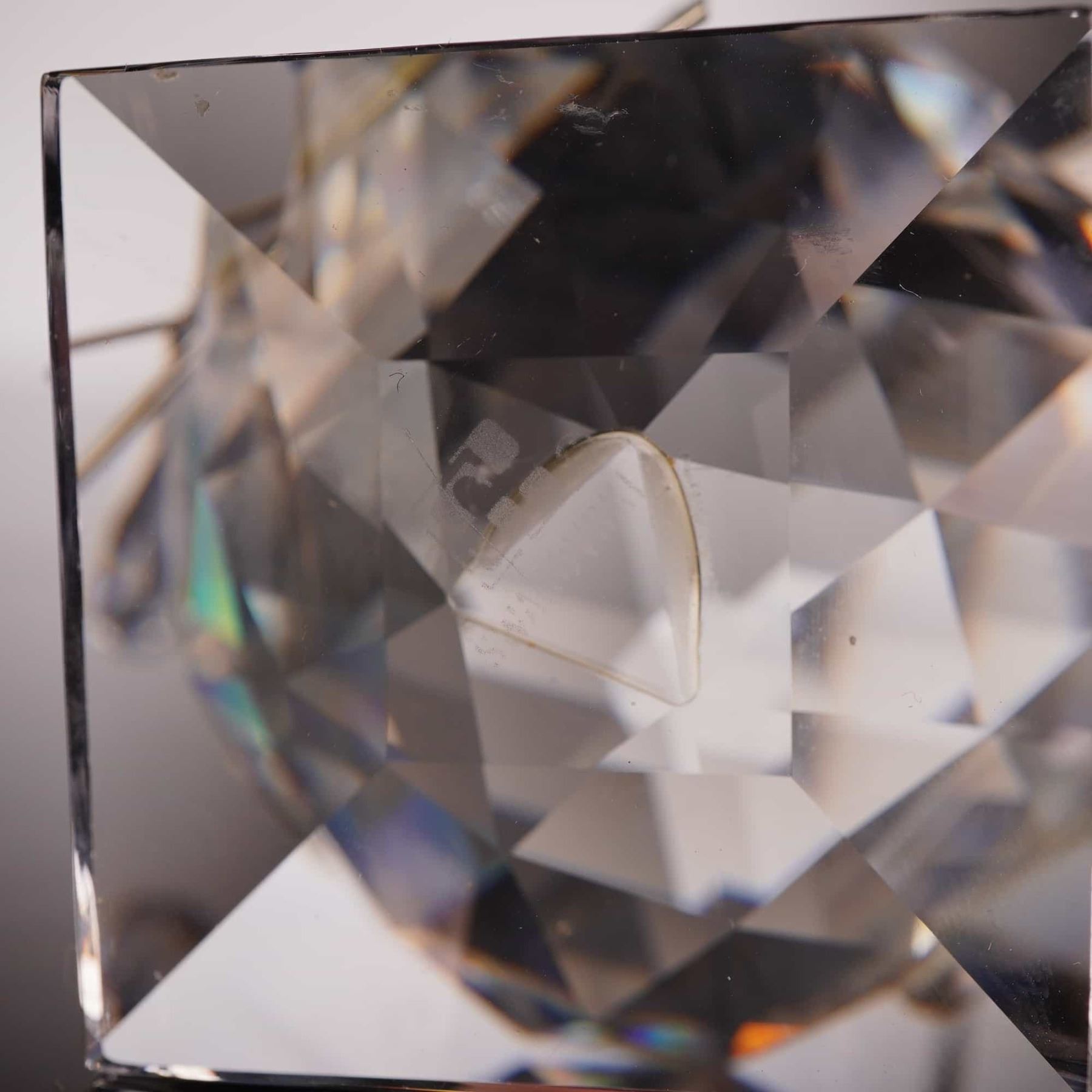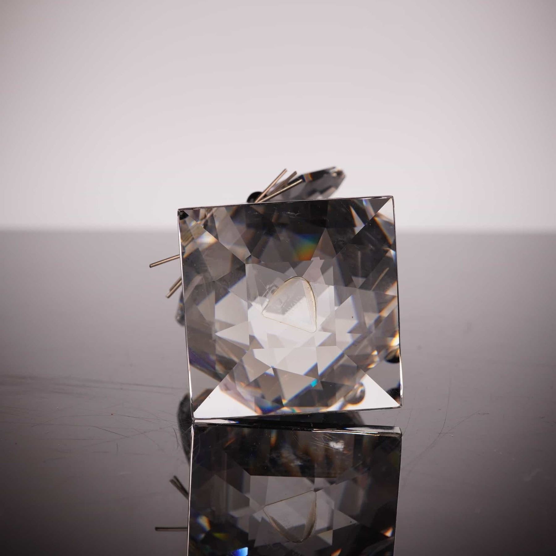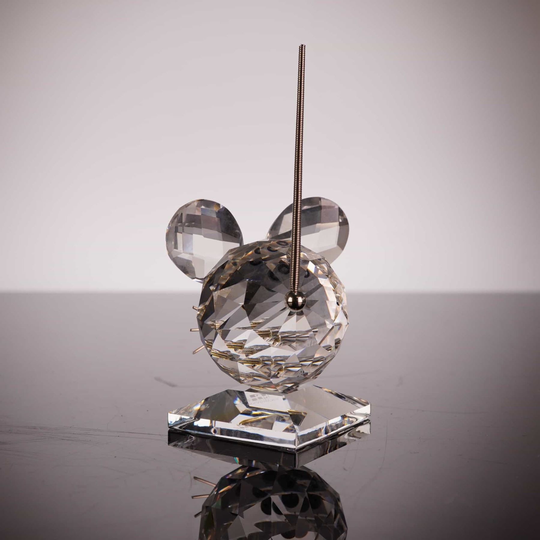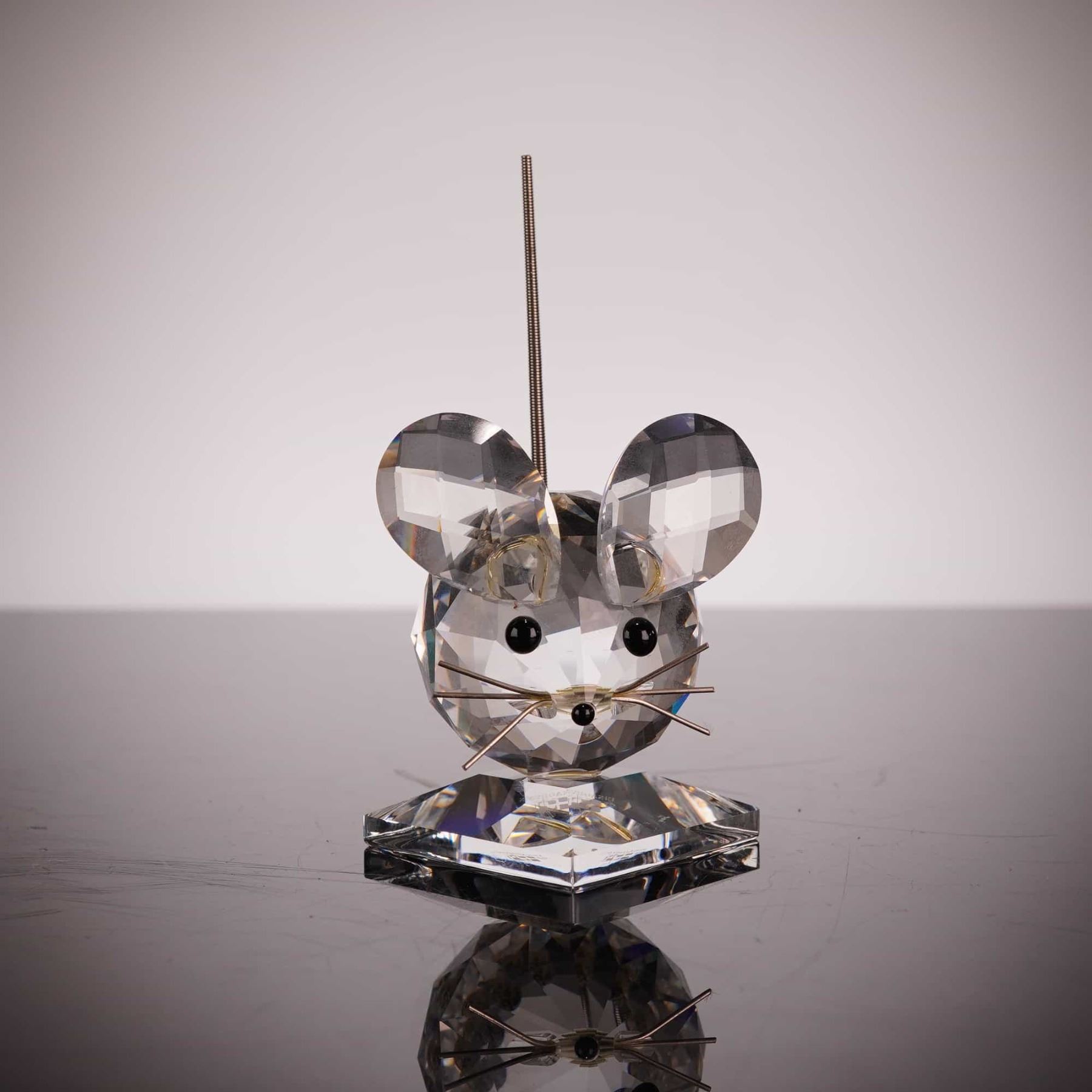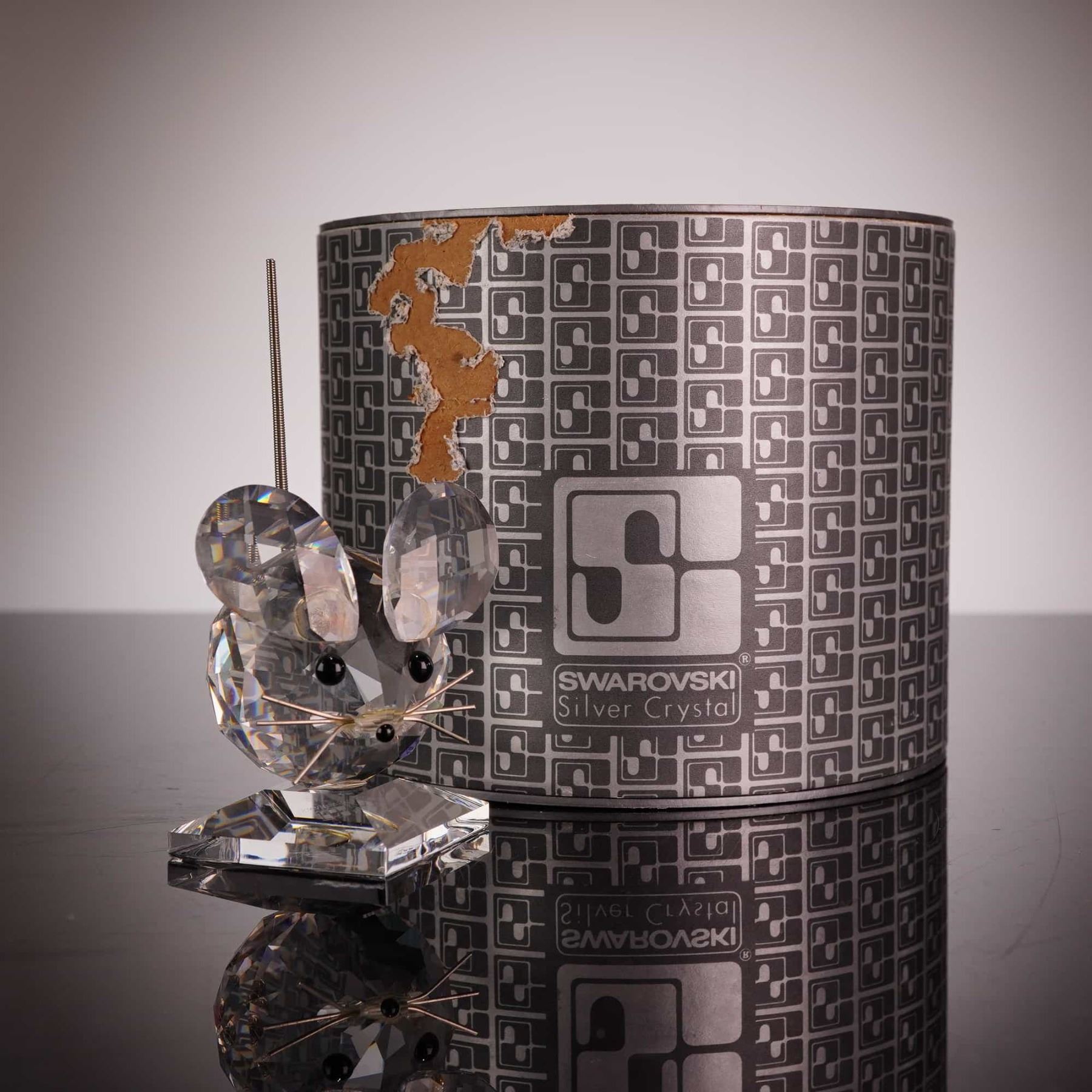 Swarovski Silver Crystal Large Mouse figurine, an early production piece from the collectible series. The stylized mouse is composed of a faceted globular body and head with large, circular faceted ears. The face features three small black beads for the eyes and nose, along with fine metal wire whiskers. The piece is finished with a long, flexible metal spring-like tail and stands on a square beveled base. The underside of the base bears the acid-etched Swarovski Block SC logo, which was used by the factory between 1976 and 1988. This item is accompanied by its original Swarovski Silver Crystal cylindrical box. Height: 3 inches.