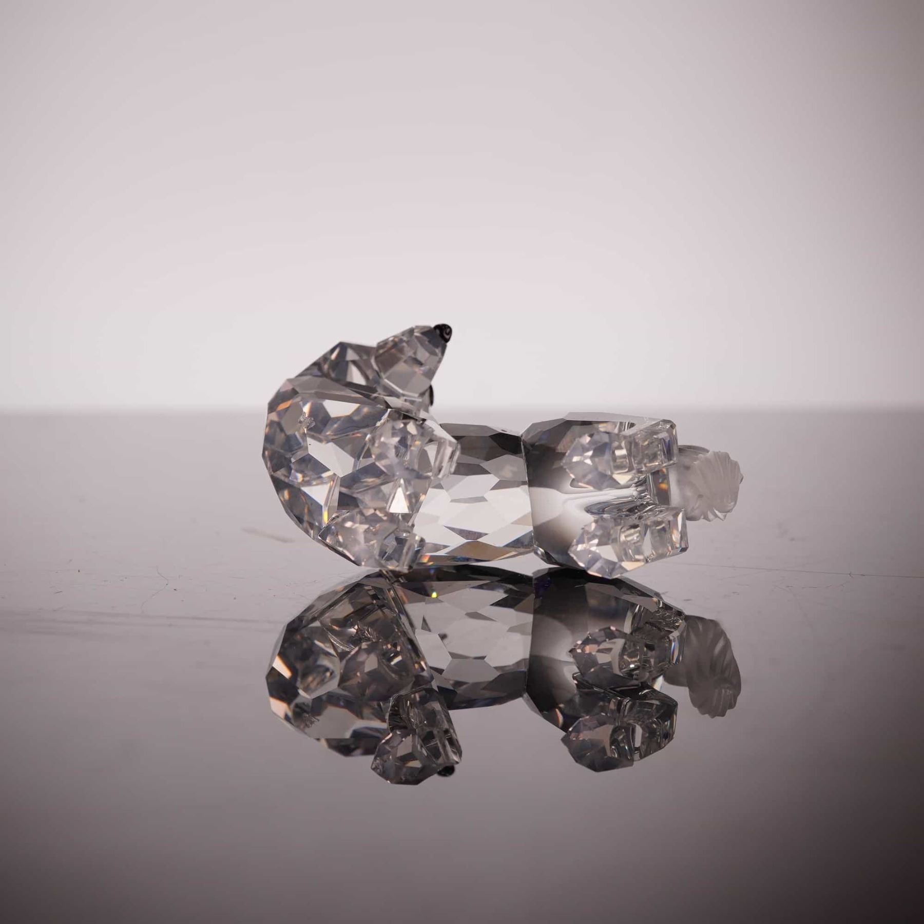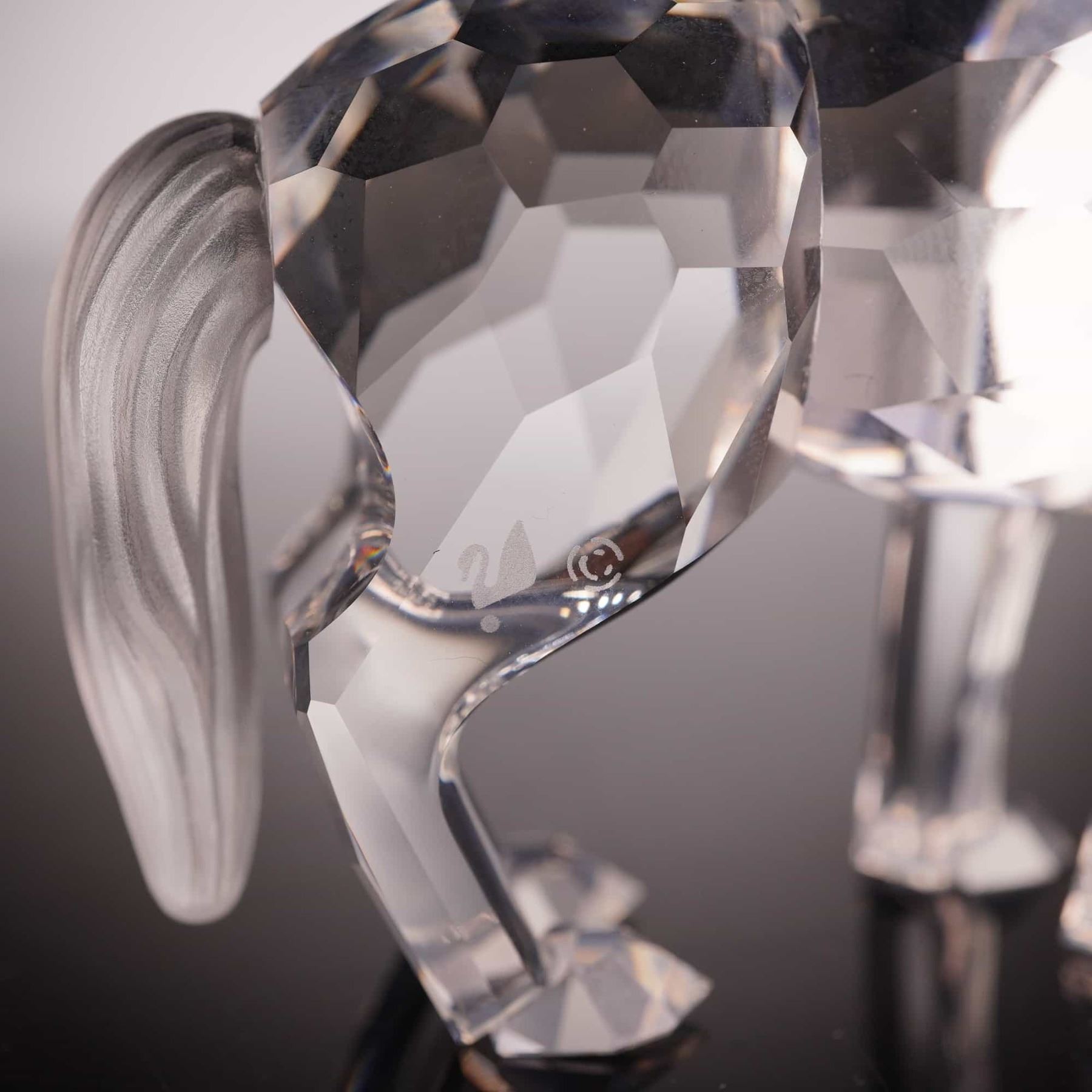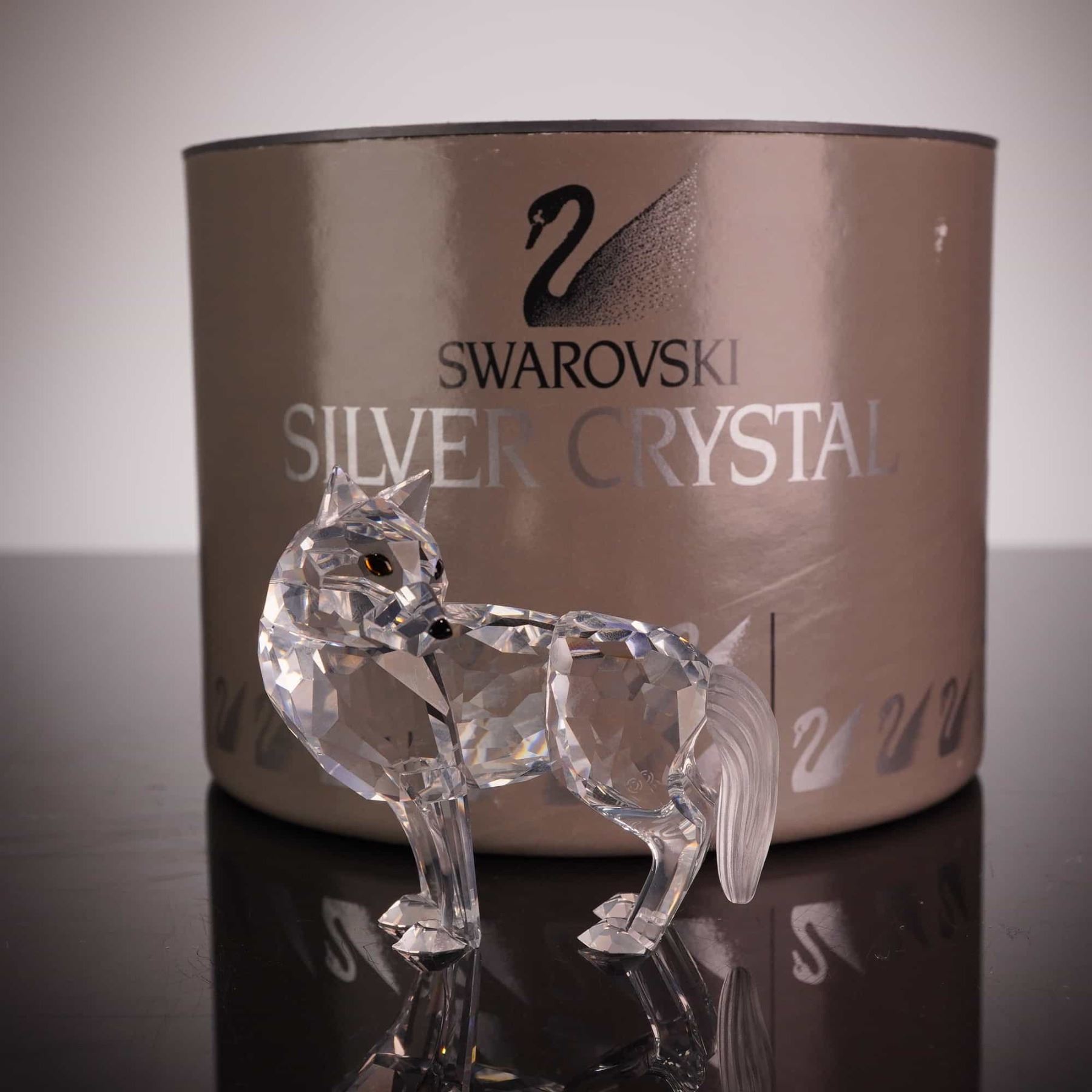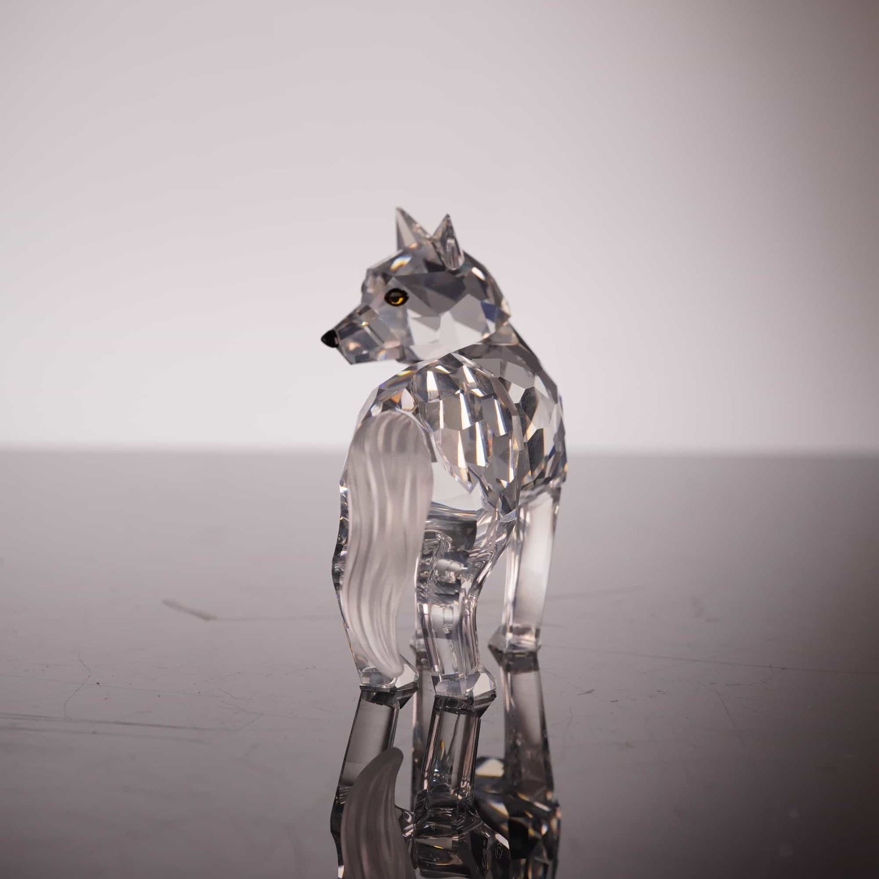 A Swarovski Silver Crystal figurine of a standing wolf, model number 207549 and system number 7550 000 002. Designed by Adi Stocker for the Rare Encounters collection, this piece is meticulously crafted from clear lead crystal with sharp, light-refracting facets. The wolf is depicted with its head turned over its left shoulder and features a contrasting frosted finish on the tail. The eyes are detailed with dark pupils. The authentic acid-etched Swarovski swan logo and copyright symbol are located on the lower back of the rear left leg. This item includes its original cylindrical Swarovski Silver Crystal branded packaging. Height: 2.5 inches.