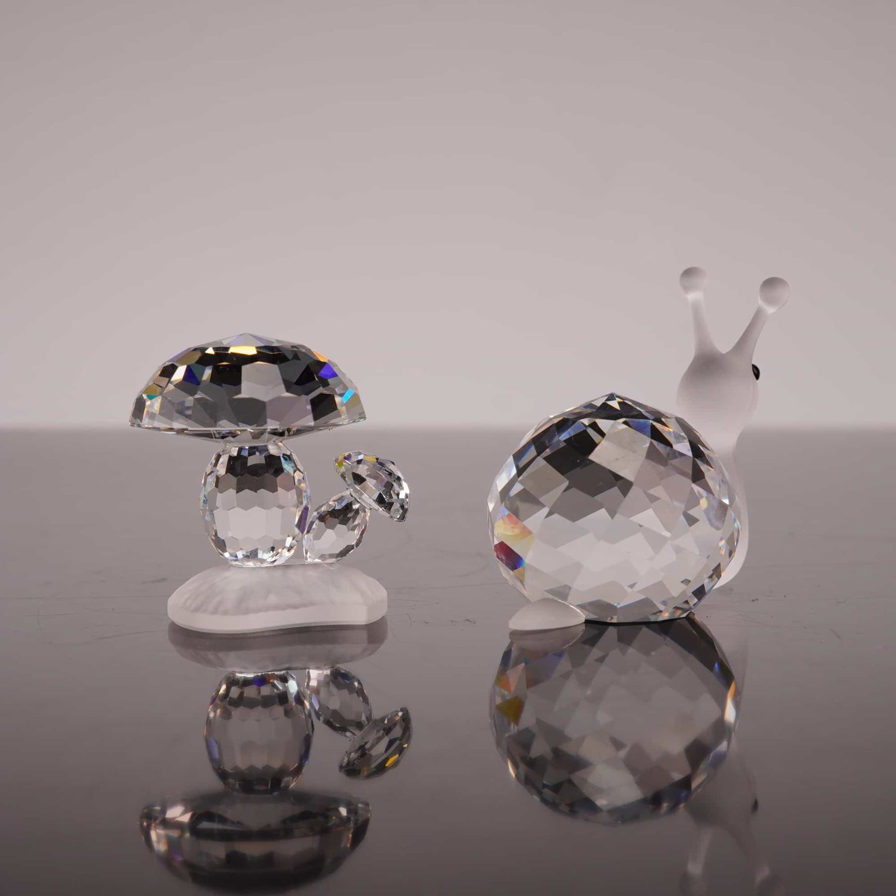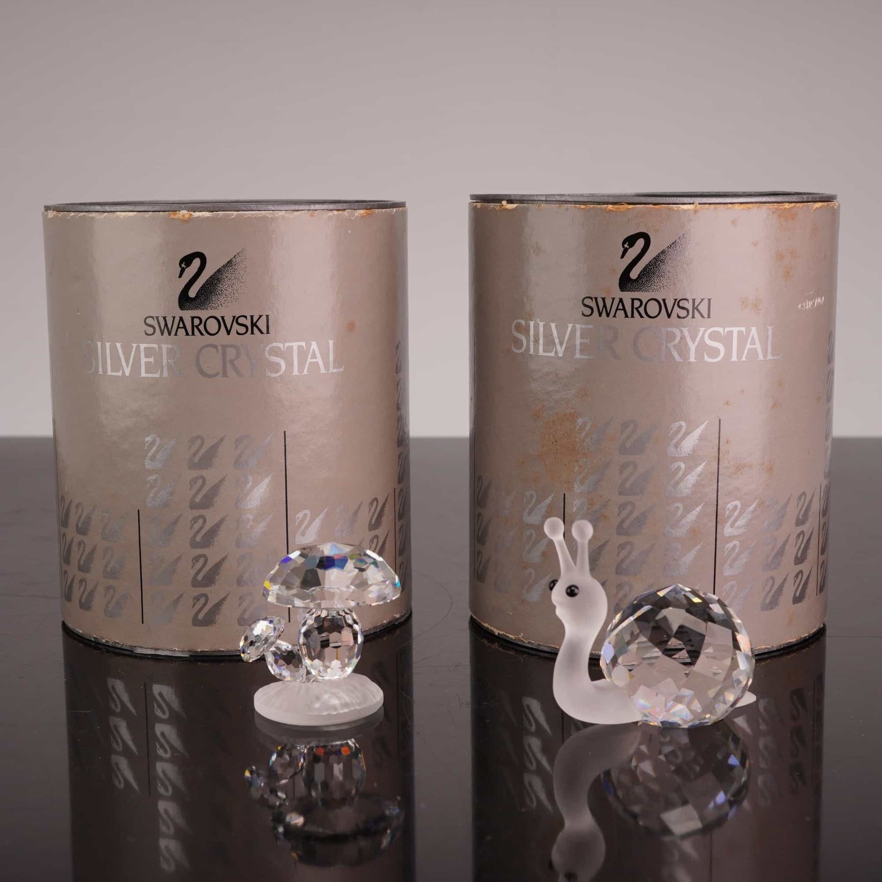 A set of two Swarovski Silver Crystal figurines featuring woodland themes. The first figurine consists of a pair of toadstools or mushrooms, featuring one large faceted lead crystal mushroom and one smaller faceted mushroom, both set upon a frosted crystal base. The second figurine is a stylized snail featuring a frosted crystal body with black bead eyes and a large multi-faceted clear crystal shell. Both items bear the acid-etched Swarovski swan maker mark on the underside. The toadstools figurine also features a smaller circular mark adjacent to the swan logo. Both items are accompanied by their original cylindrical gray Swarovski Silver Crystal storage boxes.