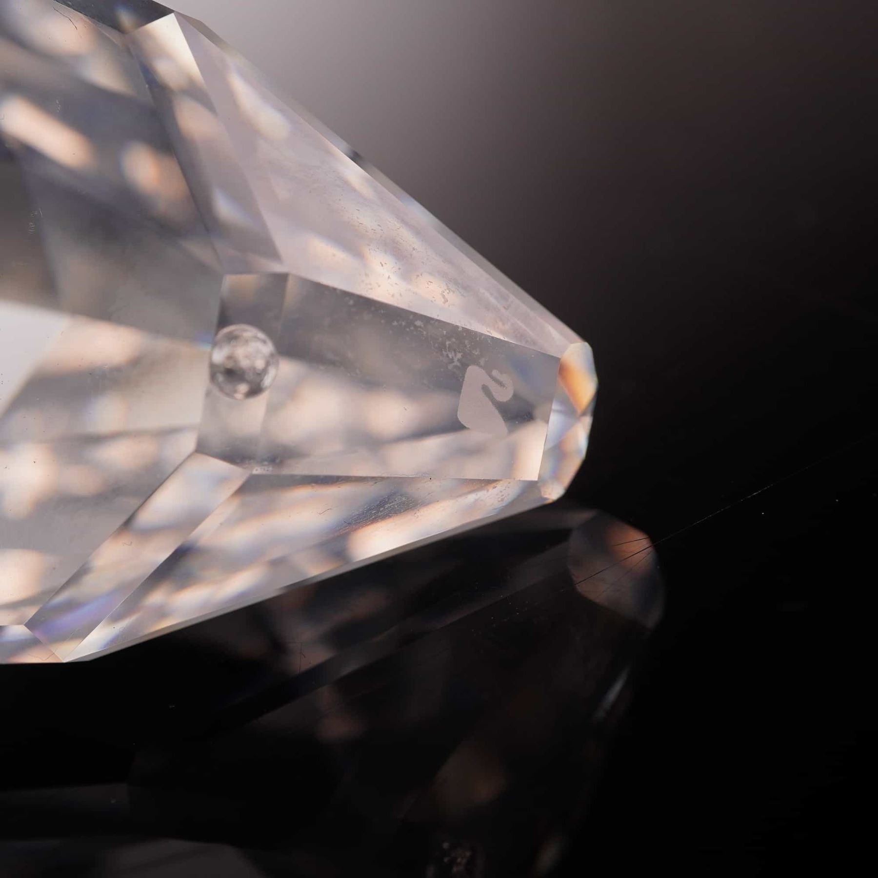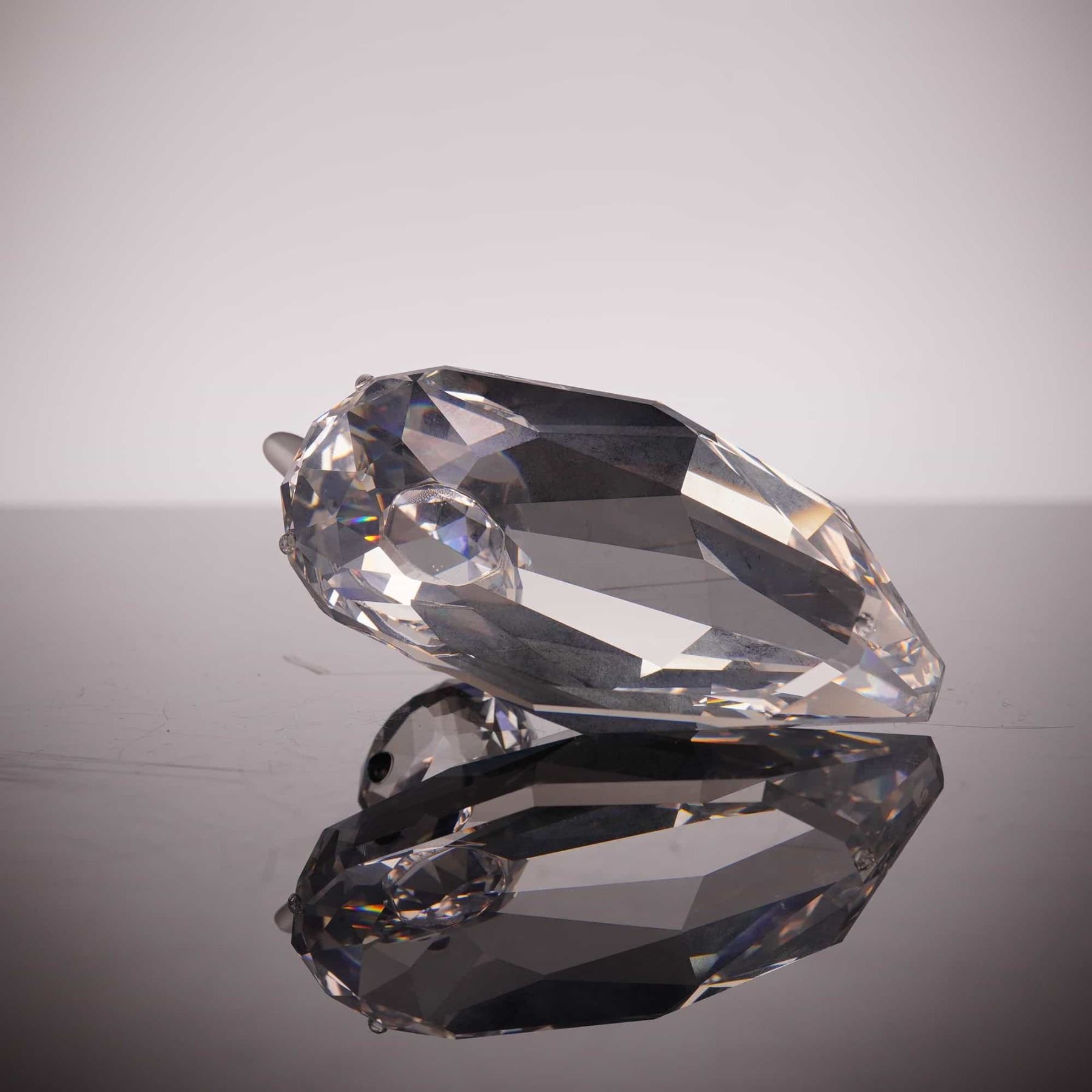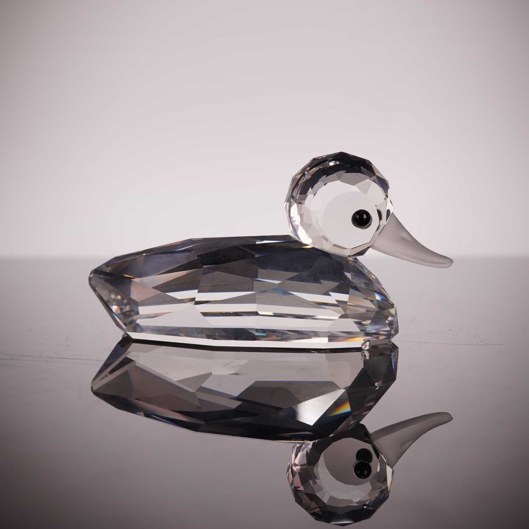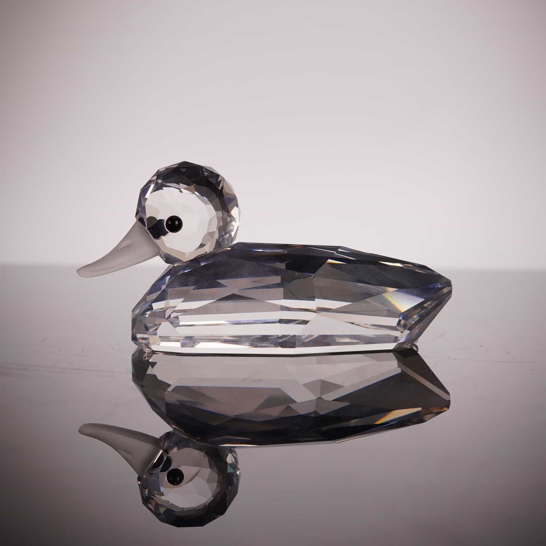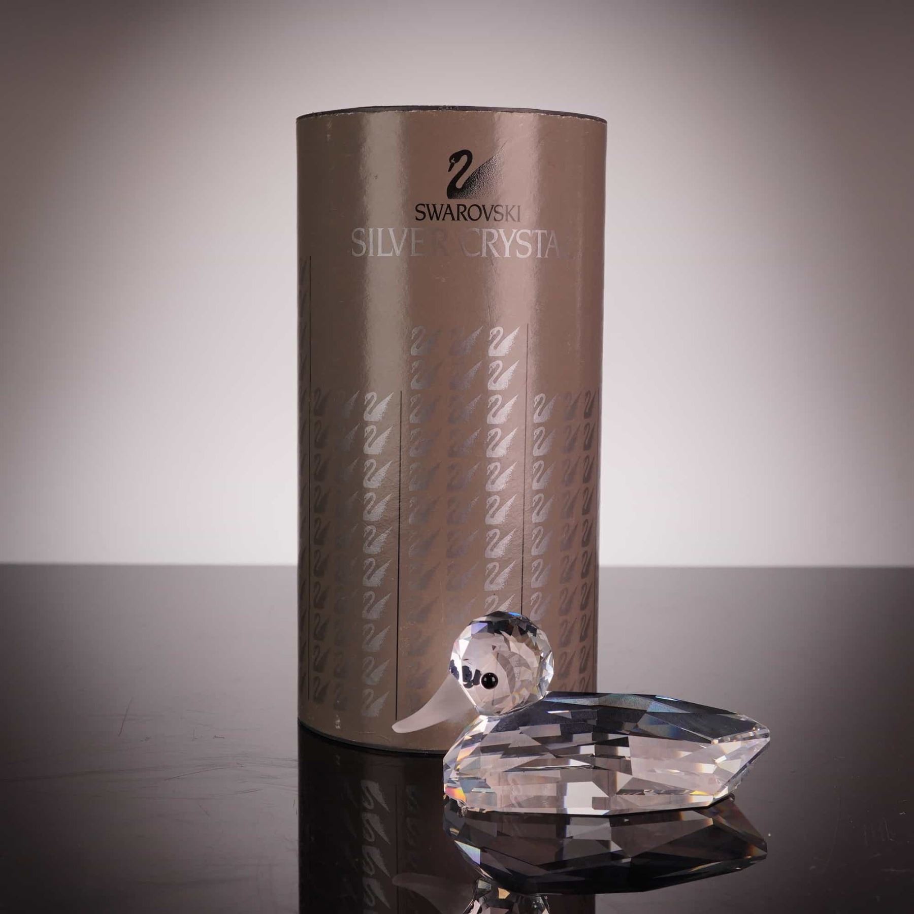 Swarovski faceted lead crystal figurine of a mallard duck from the "Beauties of the Lake" series. The piece features a clear faceted body and head, a frosted crystal beak, and applied black bead eyes. The authentic Swarovski swan logo is etched on the underside of the tail. This item includes the original Silver Crystal cylindrical tube packaging with the swan logo motif. 3 inches.