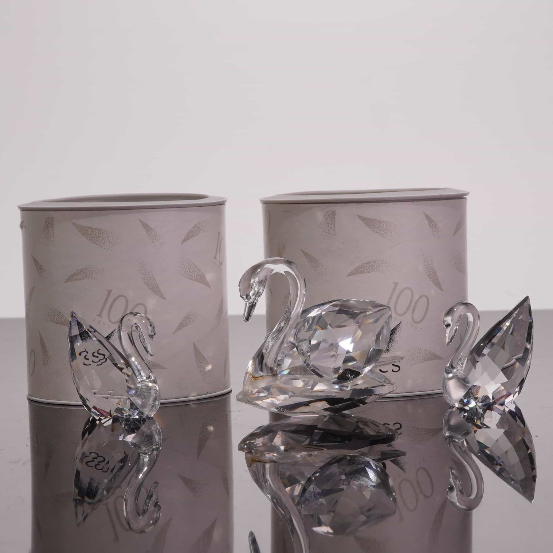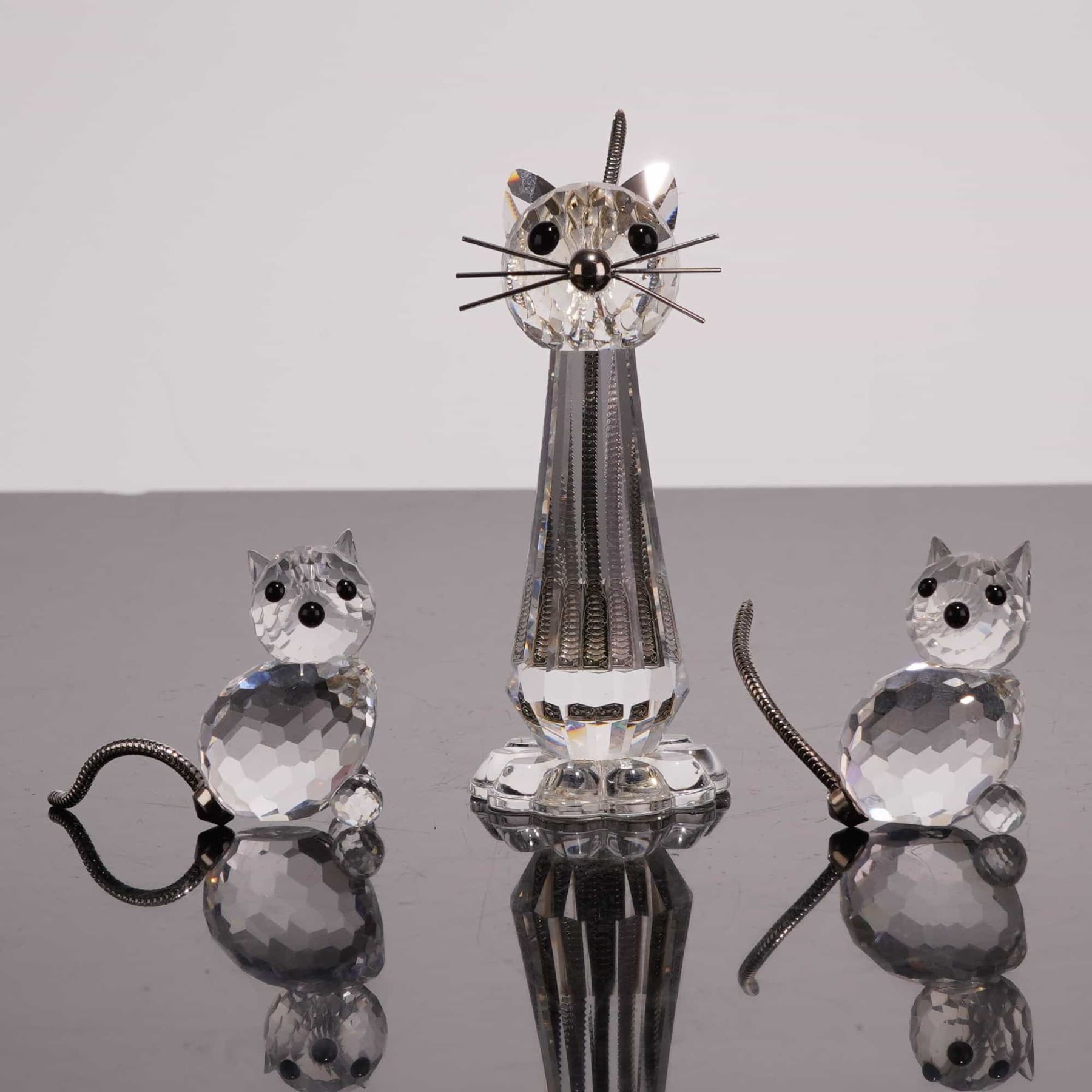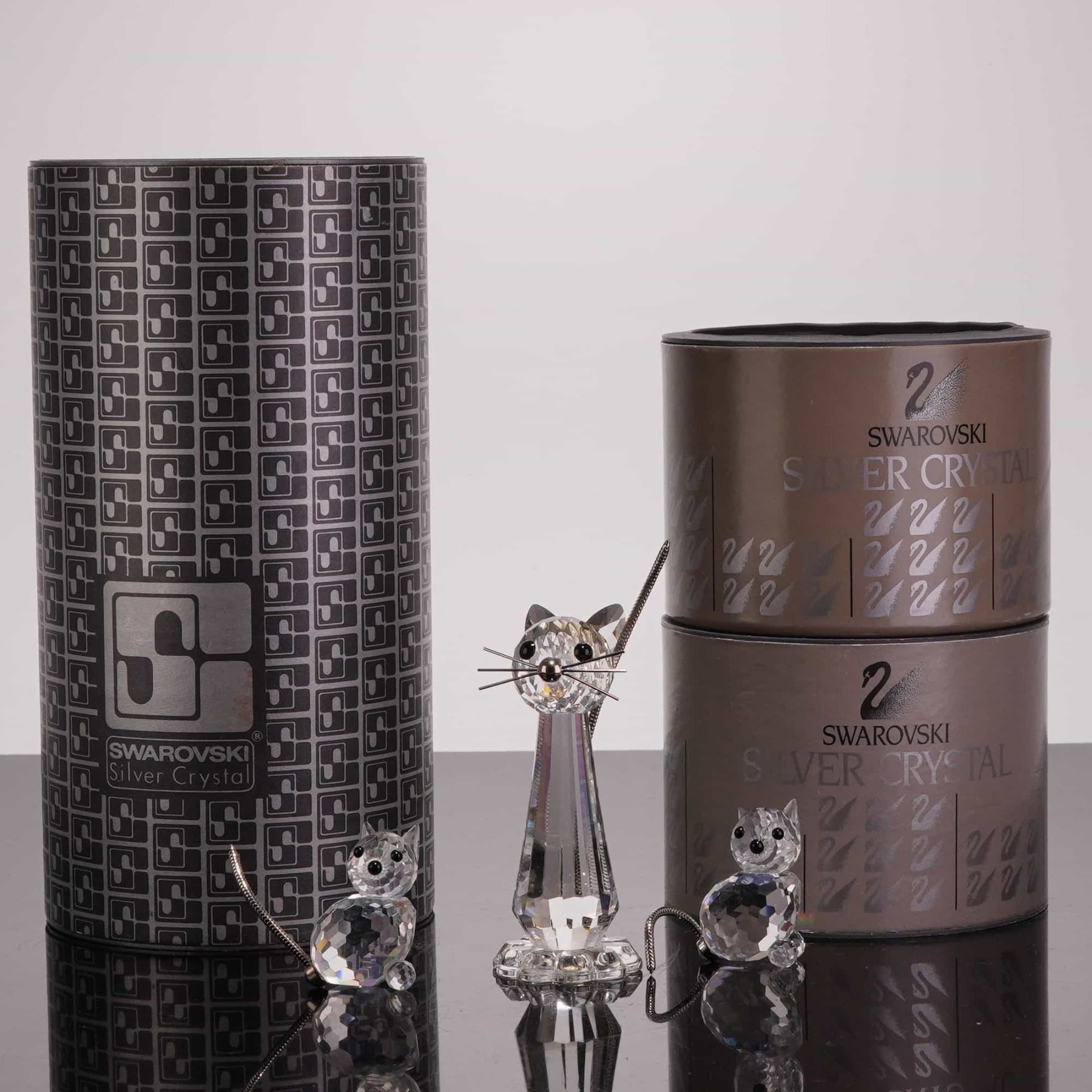 Swarovski Silver Crystal collection faceted lead crystal figurines. This lot includes a three-piece swan family featuring a large 1895–1995 Centenary Edition swan (model 187 510) and two smaller companion swans (model 010 006). Also included is a three-piece cat family consisting of a tall seated cat with wire whiskers and a metal nose (model 010 007), alongside two miniature cats with textured metal tails (model 010 009). Each figurine is marked with the acid-etched Swarovski swan logo on the base. The lot is accompanied by five original cylindrical boxes, including two centenary-themed and three Silver Crystal packages. Tallest cat height 3.25 inches.
