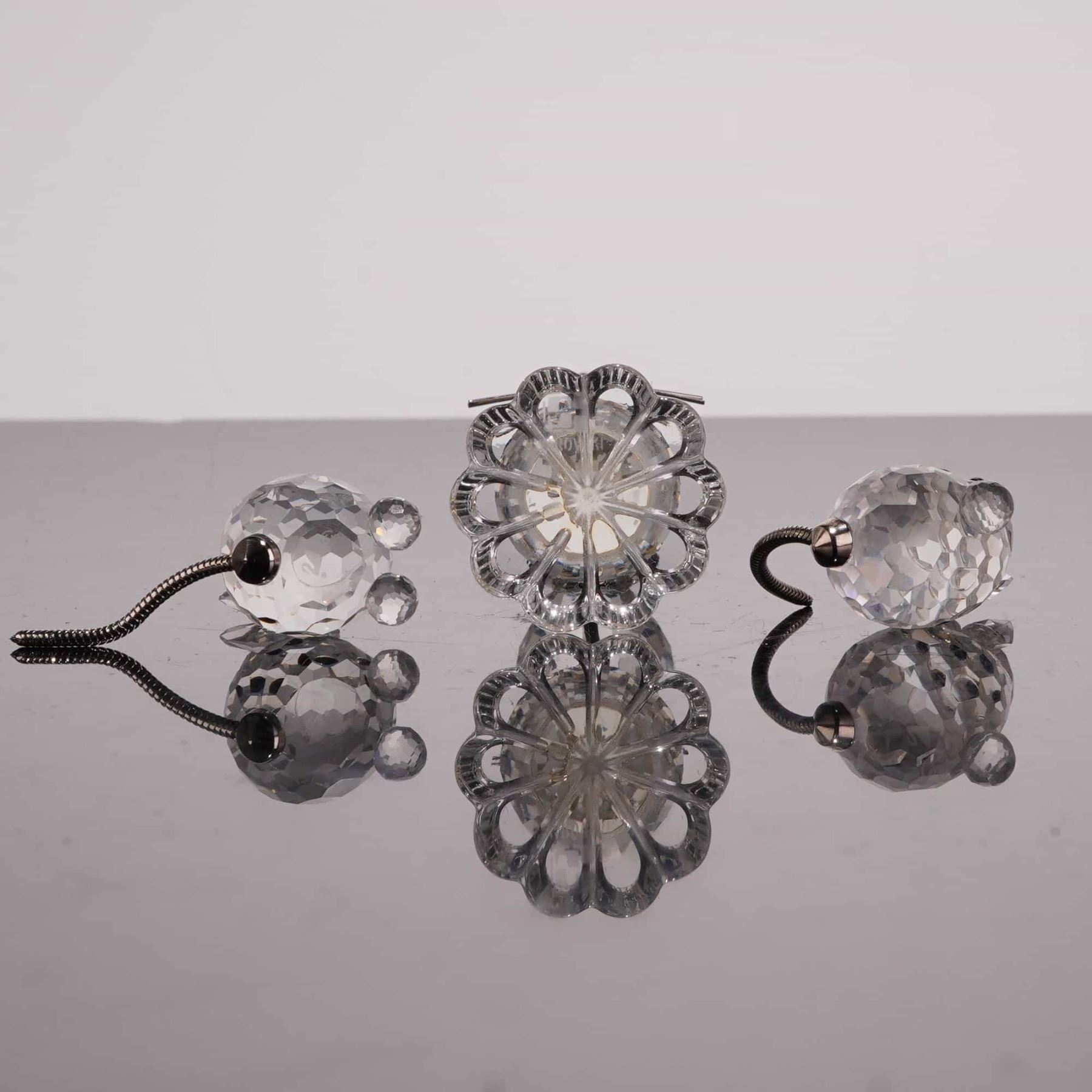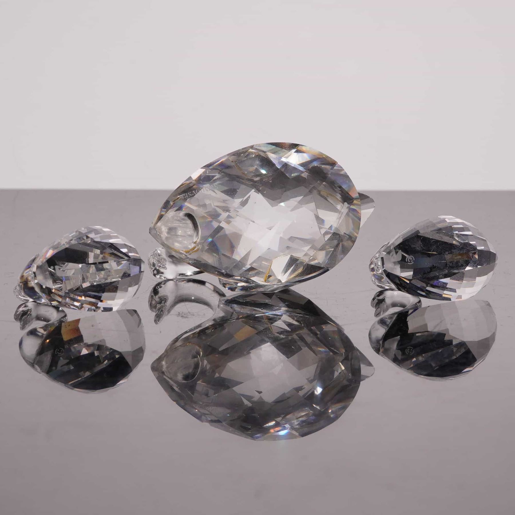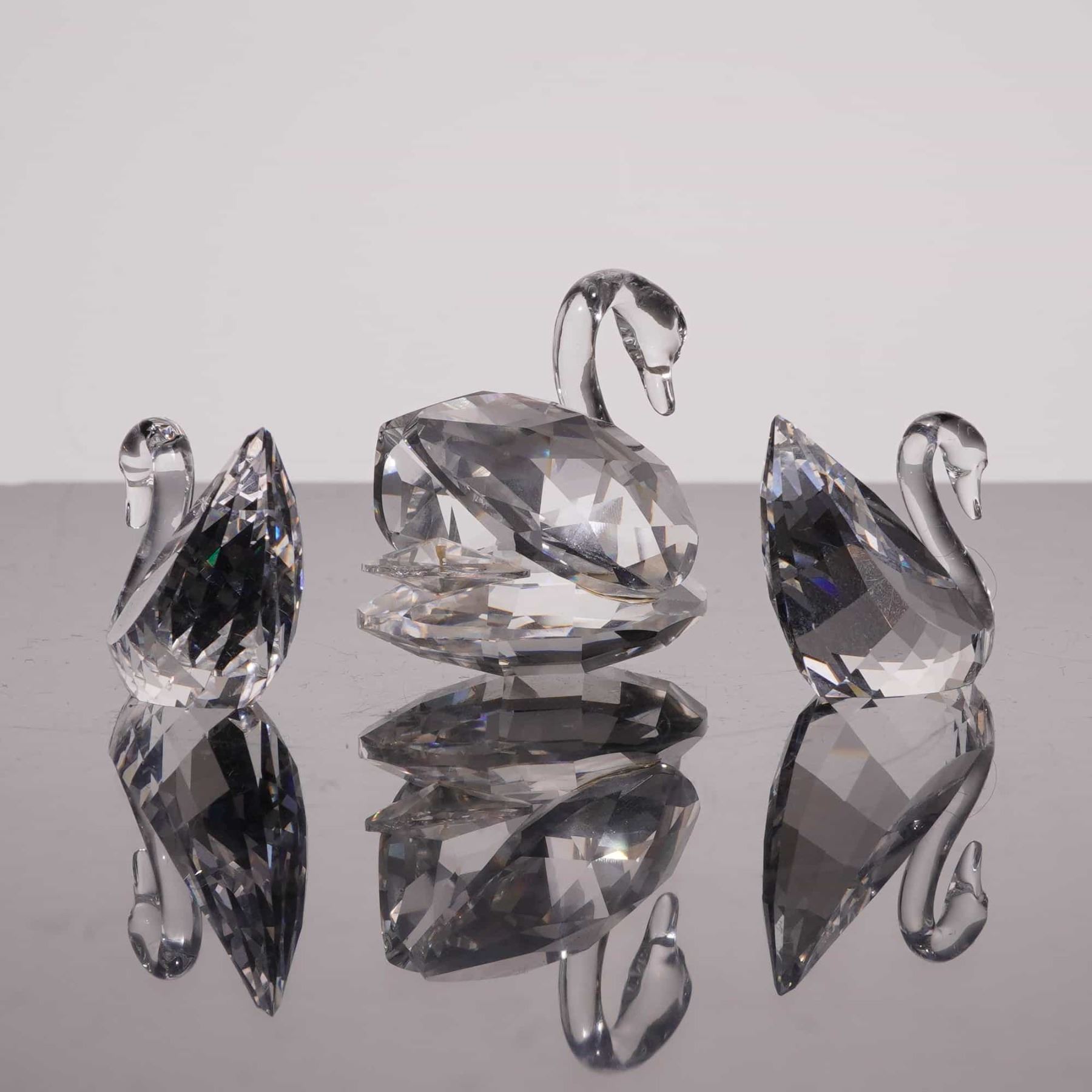 Swarovski Silver Crystal collection faceted lead crystal figurines. This lot includes a three-piece swan family featuring a large 1895–1995 Centenary Edition swan (model 187 510) and two smaller companion swans (model 010 006). Also included is a three-piece cat family consisting of a tall seated cat with wire whiskers and a metal nose (model 010 007), alongside two miniature cats with textured metal tails (model 010 009). Each figurine is marked with the acid-etched Swarovski swan logo on the base. The lot is accompanied by five original cylindrical boxes, including two centenary-themed and three Silver Crystal packages. Tallest cat height 3.25 inches.