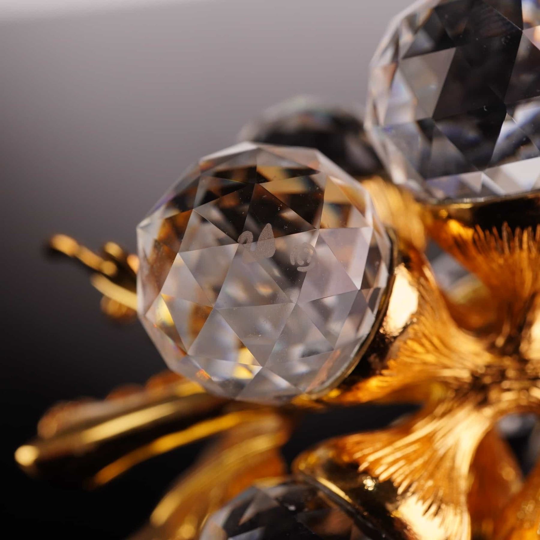 This Swarovski Silver Crystal figurine depicts a large cluster of grapes from the Sparkling Fruit collection. The piece features approximately 15 individually faceted spherical crystal beads, each meticulously machine-cut with diamond-shaped facets to maximize light refraction and rainbow dispersion. The crystal cluster is set upon a gold-toned metal stem featuring a textured leaf and two coiled tendrils. The item is authenticated by a laser-etched Swarovski swan logo located on one of the crystal facets. This retired piece is composed of high-lead content crystal, characteristic of the Silver Crystal line's premium quality and weight. The figurine is accompanied by its original cylindrical Swarovski Silver Crystal presentation box with the signature gray swan motif. Dimensions: Approximately 6.25 inches in length.