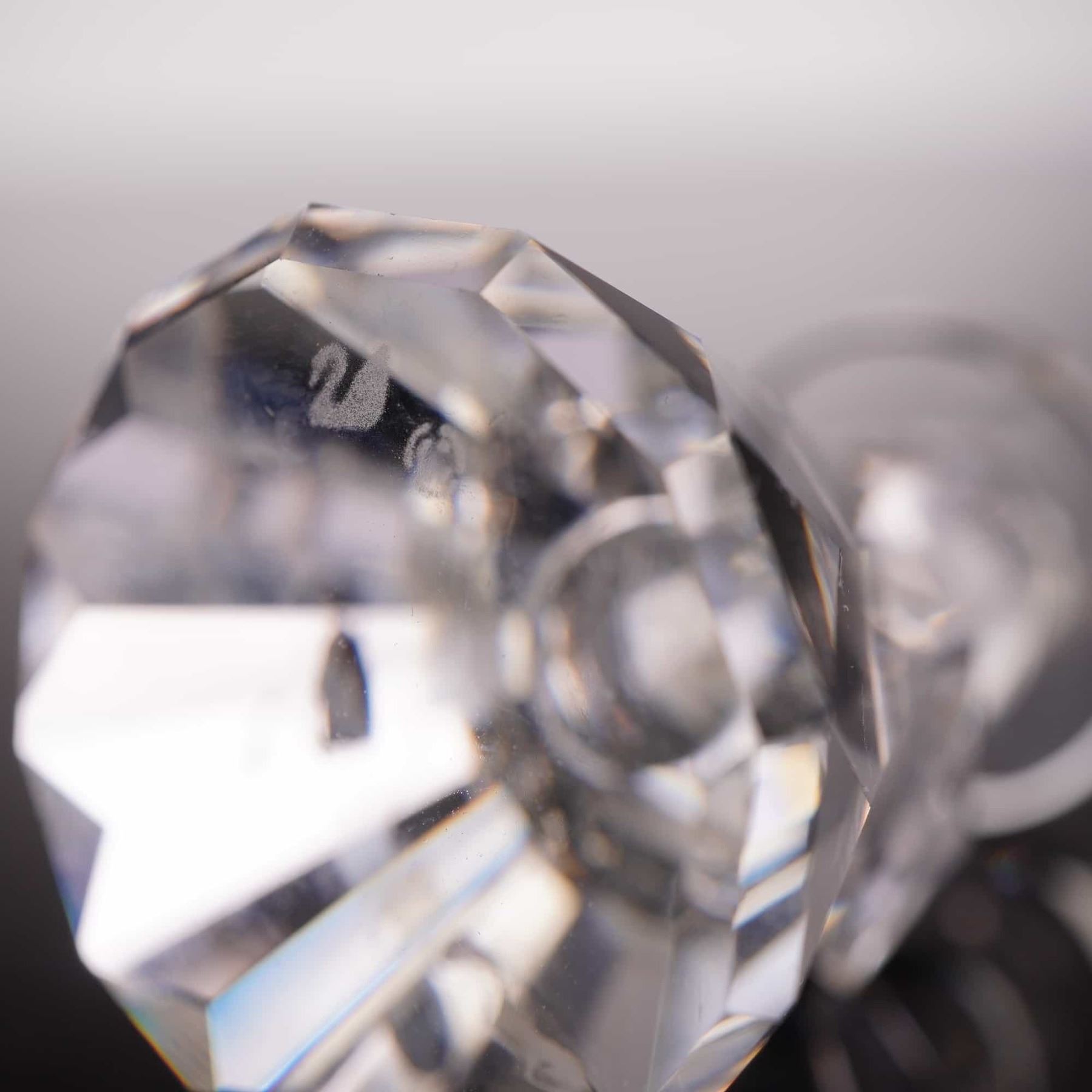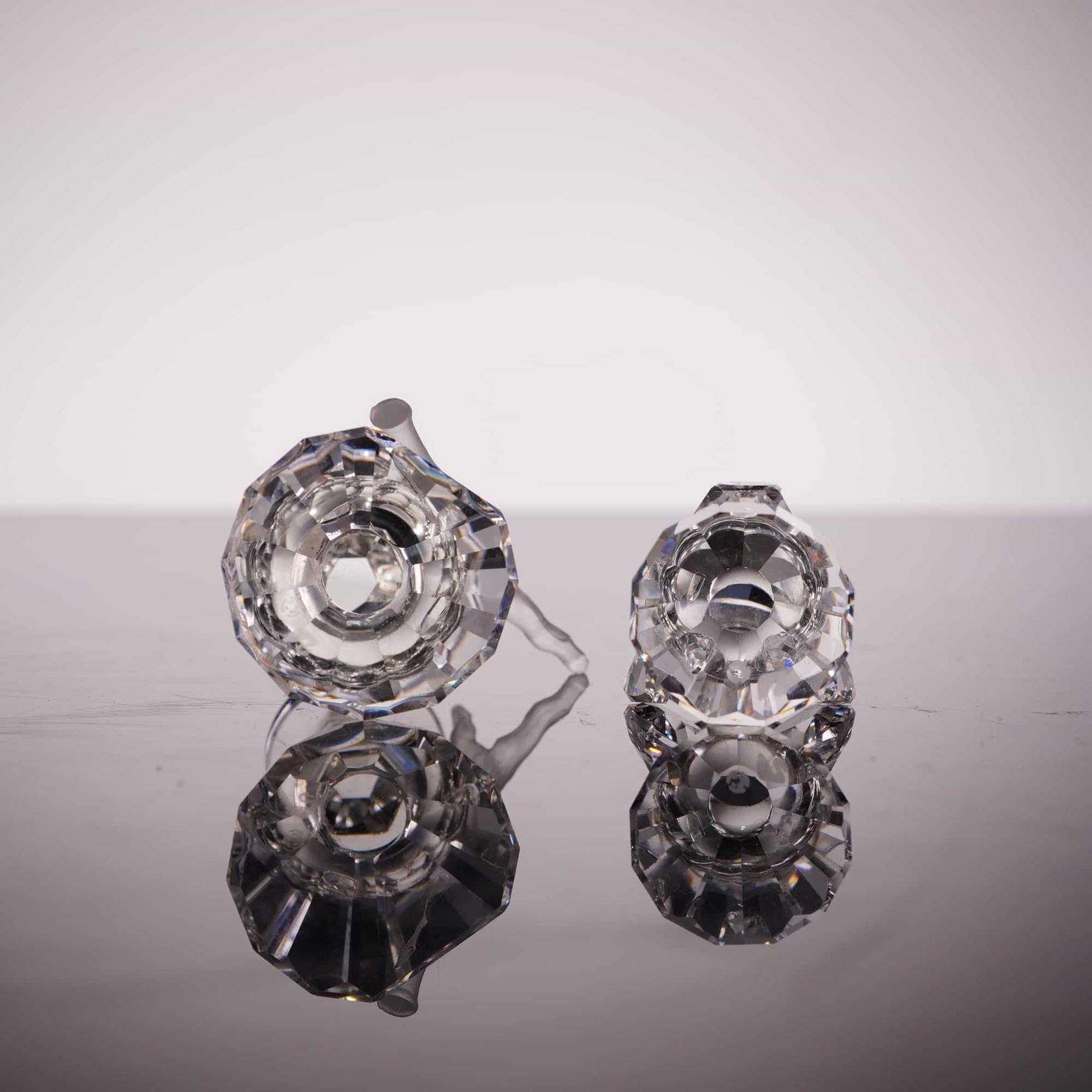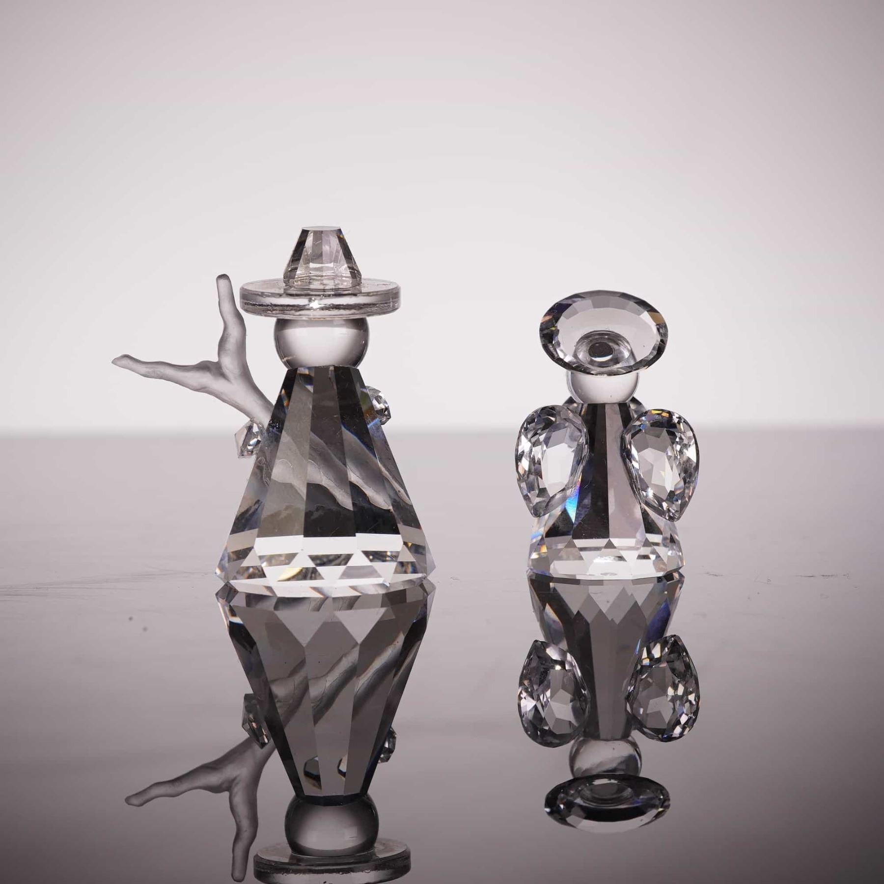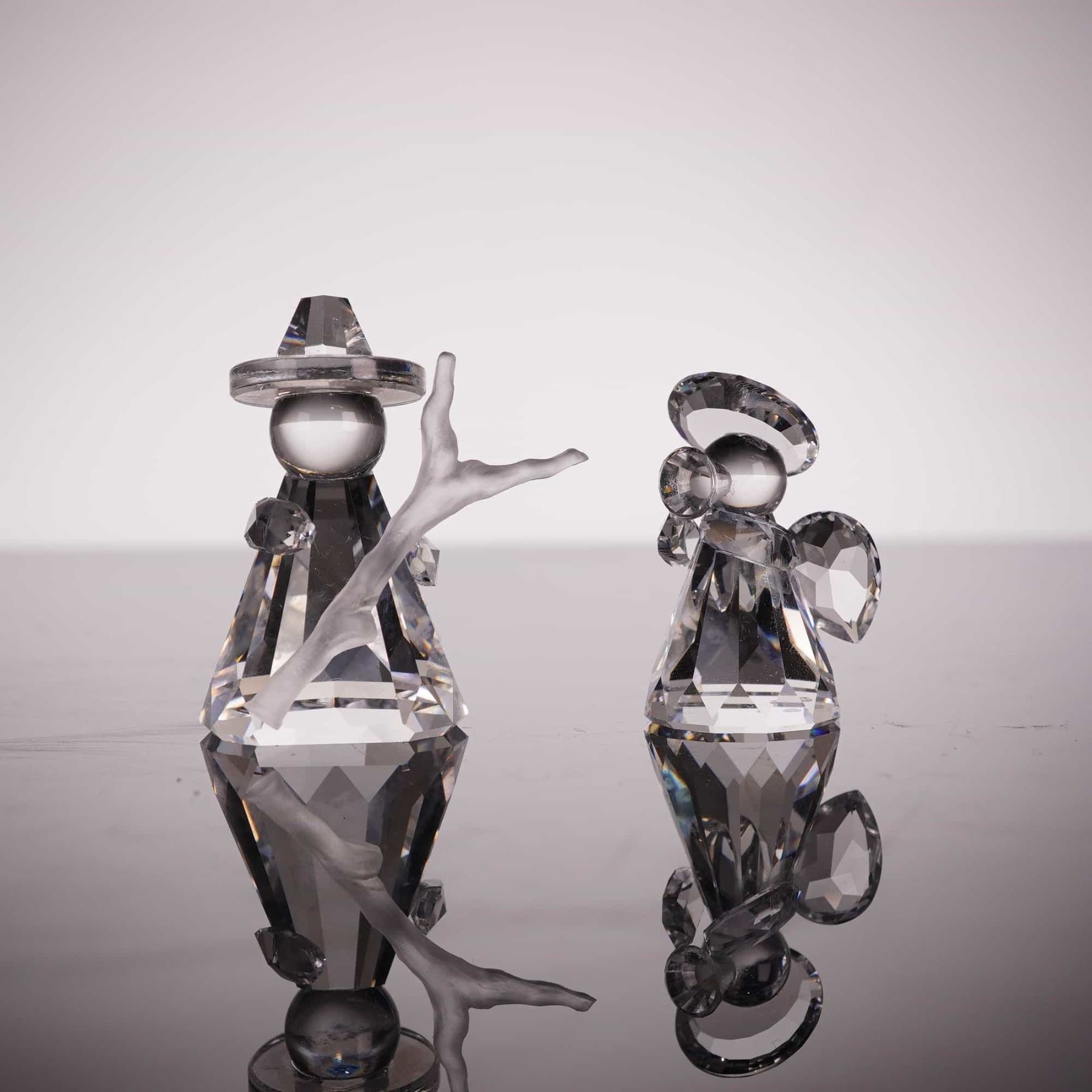 A pair of faceted lead crystal figurines from the Swarovski Nativity collection. This set includes the Shepherd and the Angel. The Shepherd is designed with a faceted body and wide-brimmed hat, carrying a frosted glass crook. The Angel features heart-shaped wings and a circular halo, holding a small trumpet. Both figurines are executed in clear faceted crystal. Each piece is marked with the etched Swarovski swan logo on the underside. Height: 1.75 inches.