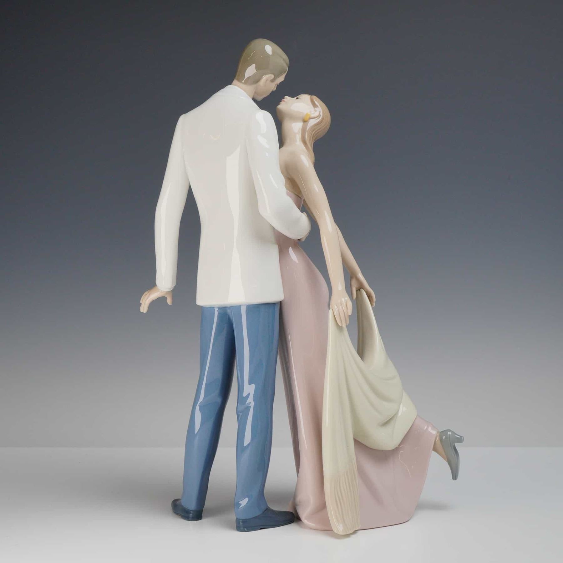 Depicts an elegant couple in a romantic dancing pose. The male figure is dressed in a formal white dinner jacket with blue trousers and a blue bow tie, while his partner leans back in a long, sleeveless pink gown holding a draped white shawl. The piece features the soft pastel palette and elongated forms characteristic of the manufacturer. The underside bears the blue Lladro factory stamp. The base also features an incised model number, Lladro hand-painted signature, and a handwritten date of 9-8-05.