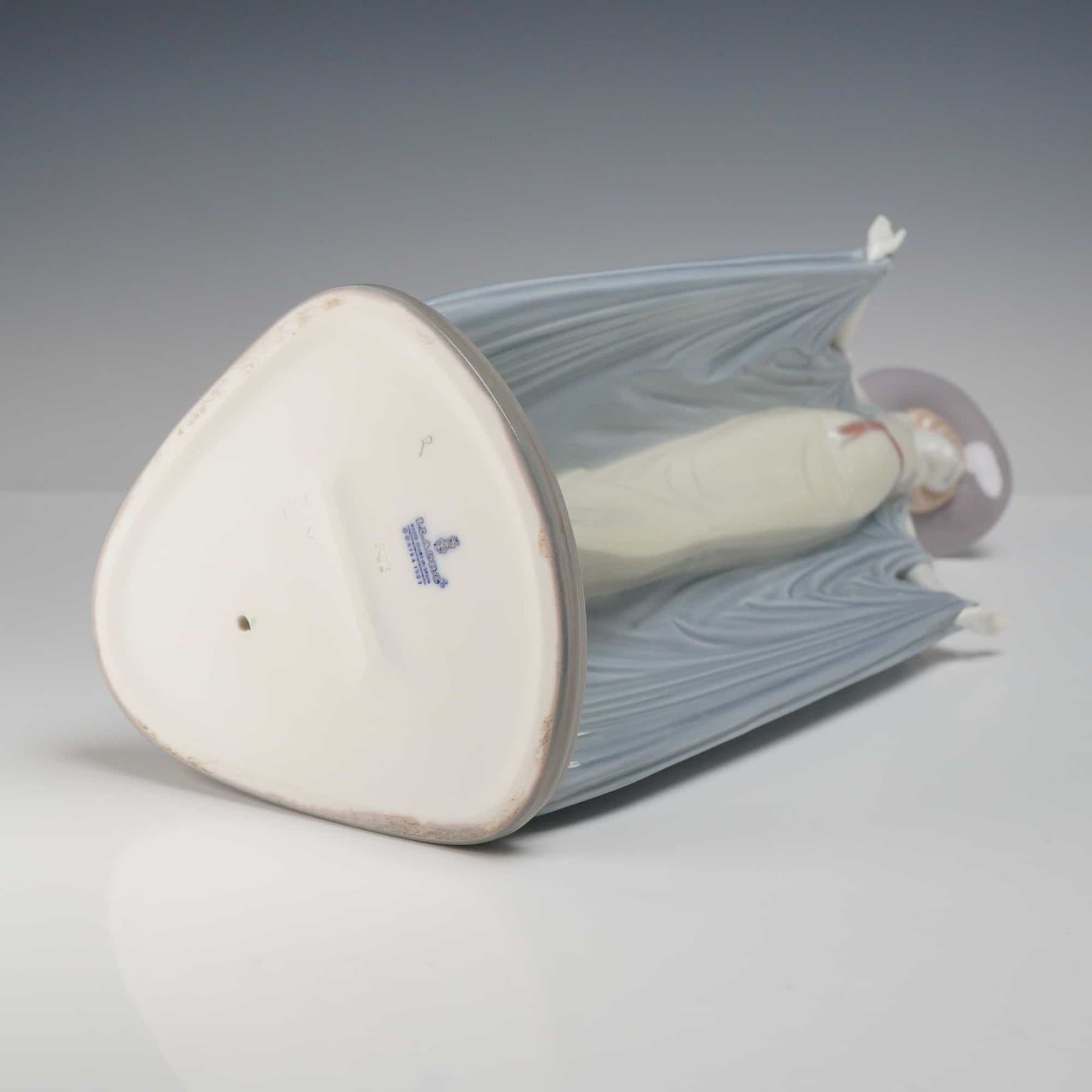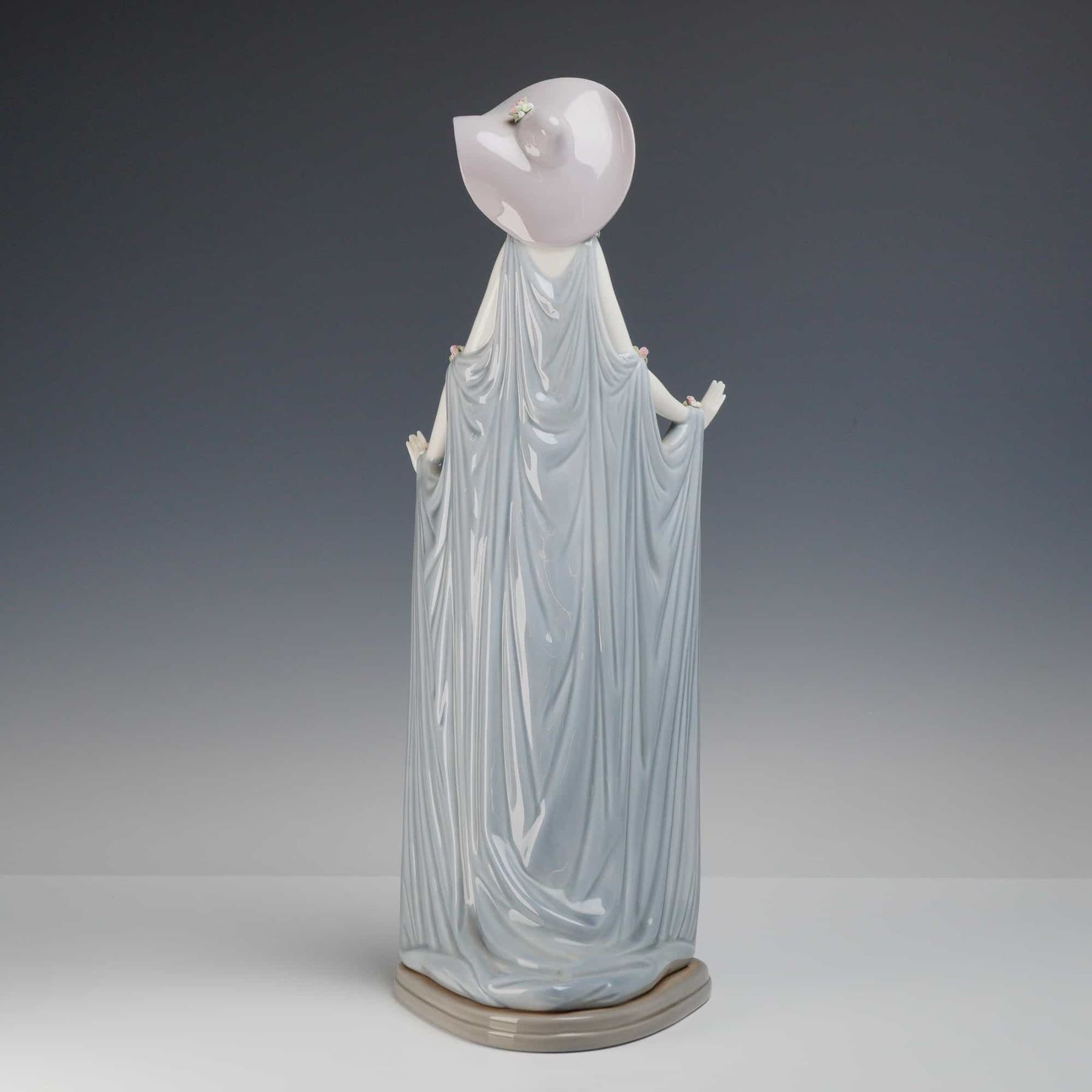 Depicts a tall, elegant woman in a stylized, elongated pose. She wears a wide-brimmed lavender hat and a slender cream-colored gown, holding an expansive, draped periwinkle-blue shawl that falls to the base. The piece is accented with delicate, hand-applied miniature porcelain flowers at the shoulders and on the hat brim. The base features the blue printed Lladro mark.