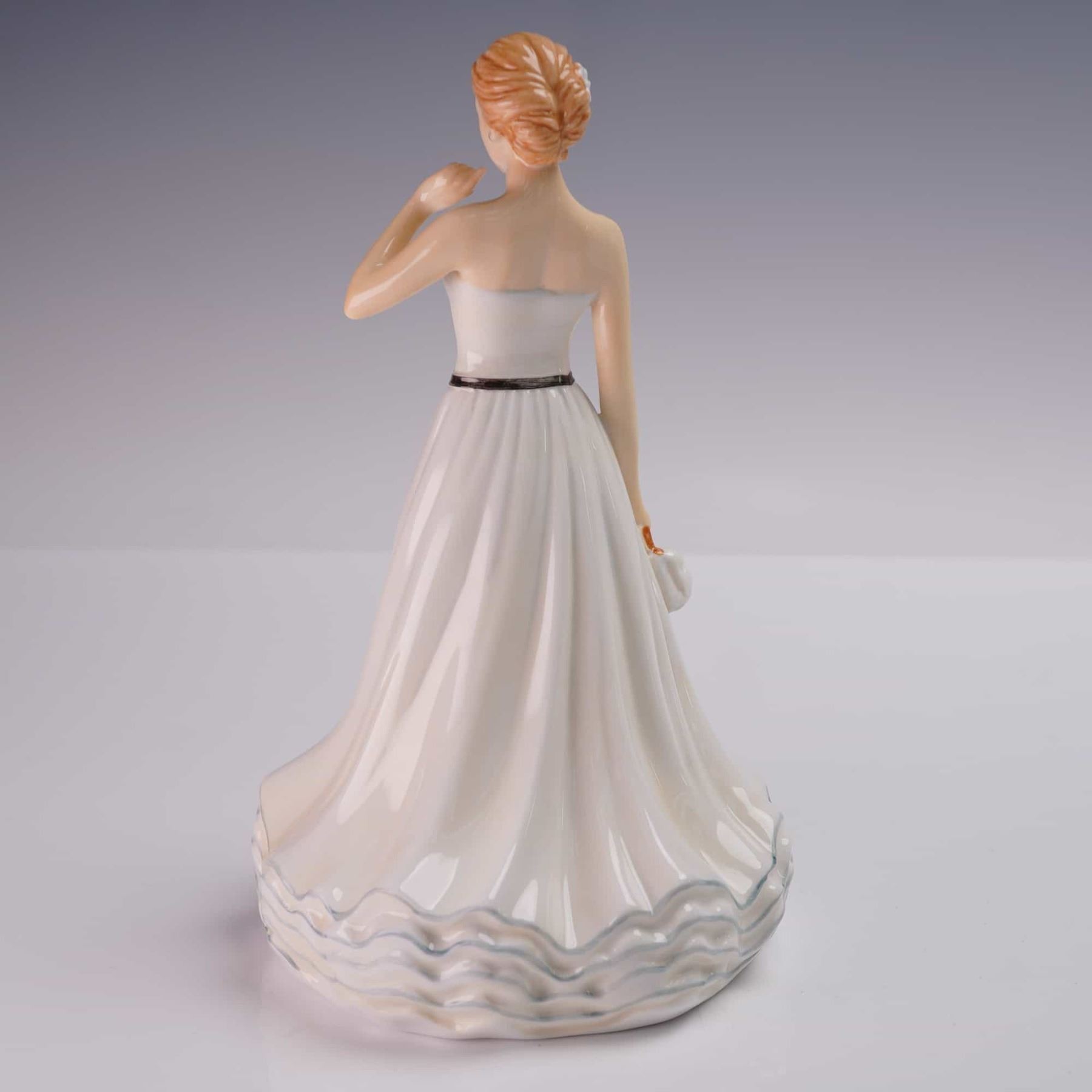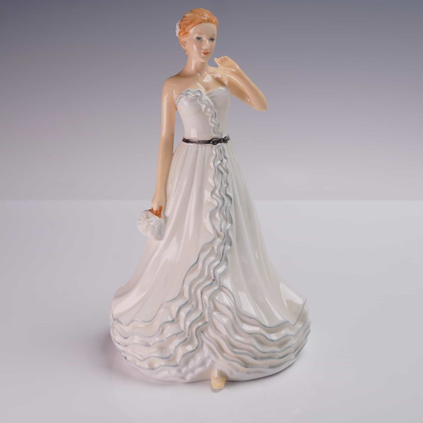 Royal Doulton Pretty Ladies bone china figurine titled Wendy, model HN5724. This 2014 petite edition features a strapless white gown with a soft blue ruffle trim and sculpted wave hem. A fine belt with bow defines her waist, and she holds a matching clutch in one hand. Hand decorated and marked with the Royal Doulton backstamp. Measures 7"H.