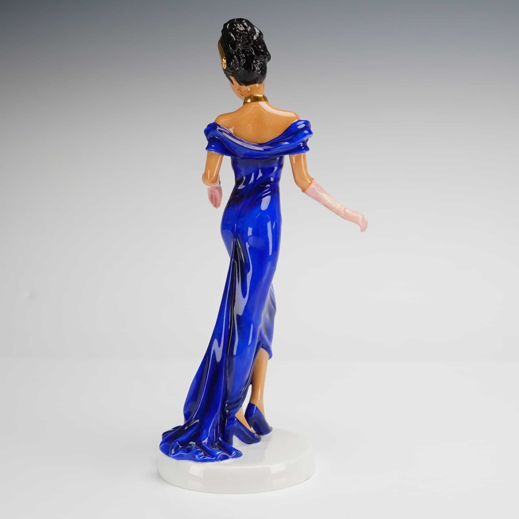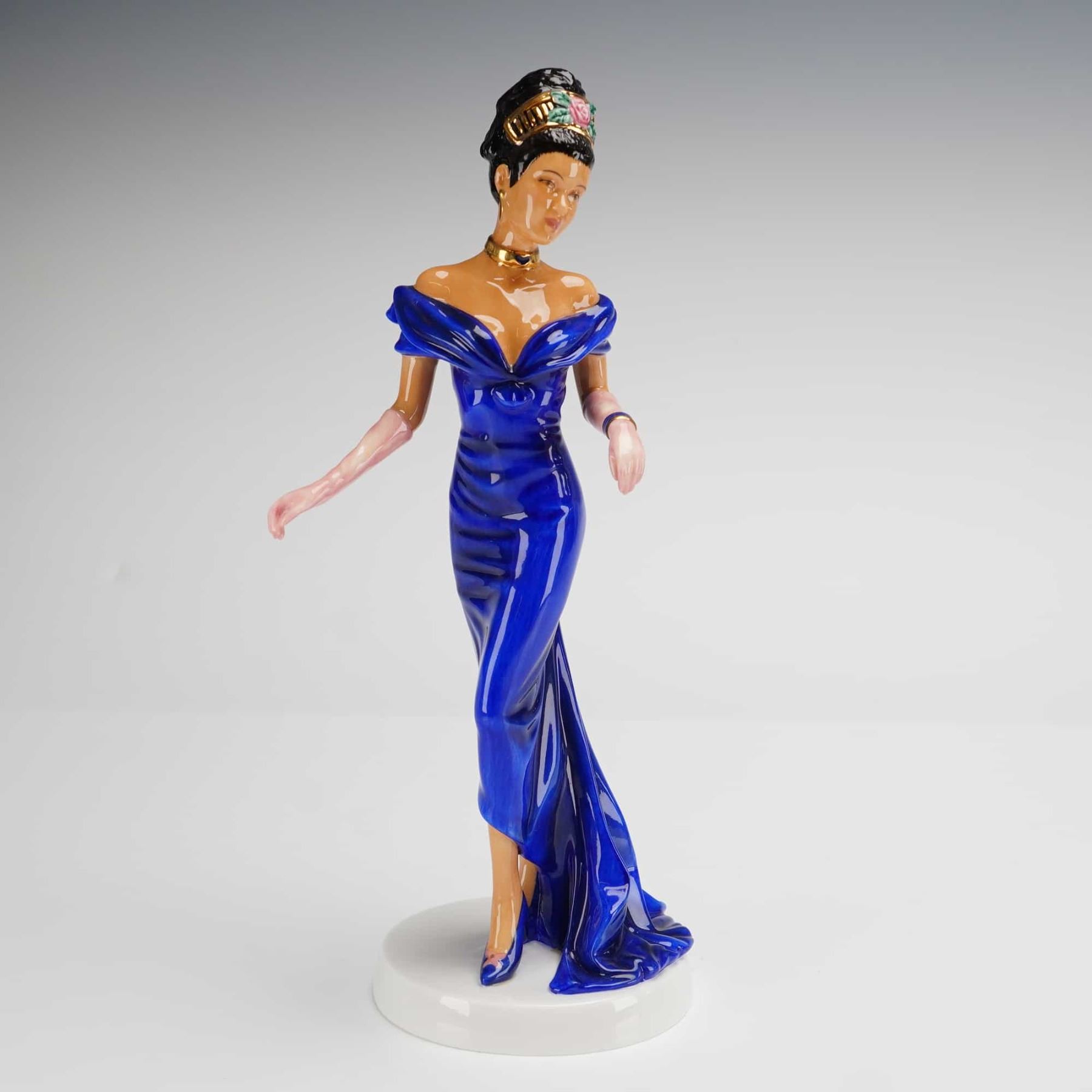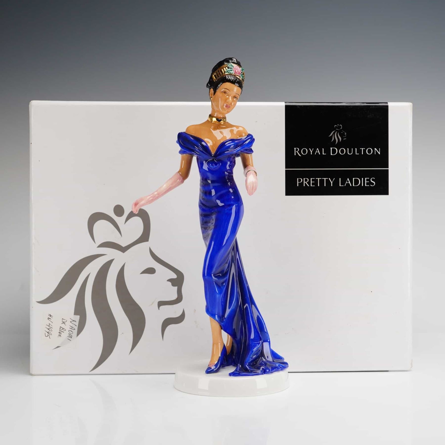 A Royal Doulton bone china figurine titled Naomi, model HN 4995, from the Pretty Ladies collection. This hand-decorated figure is depicted in a floor-length cobalt blue off-the-shoulder gown with a train. The figure features pale pink evening gloves, a gold-toned choker, and a matching tiara decorated with miniature pink roses. The circular white base bears the official Royal Doulton maker mark, indicating the piece was designed in England and produced in Thailand with a 2007 copyright date. The lot includes the original branded white and black presentation box.