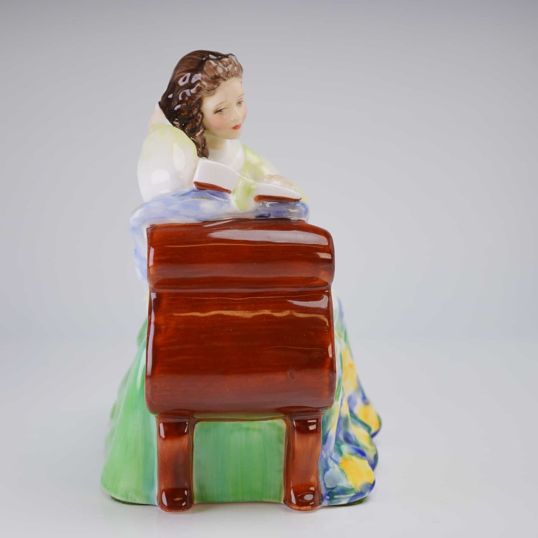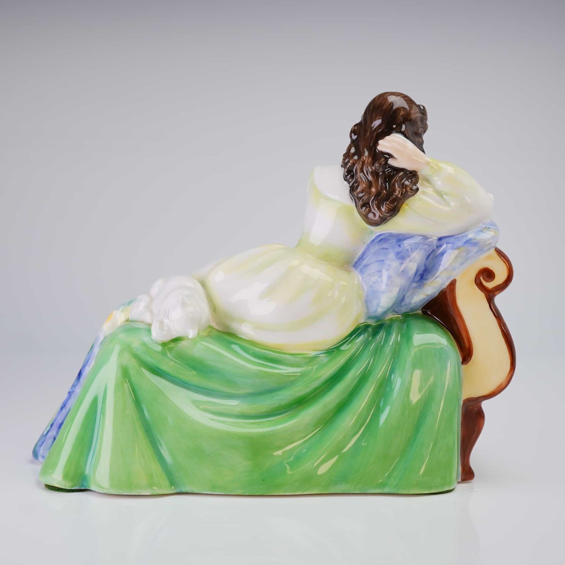 Royal Doulton Bone China Figurine, Solitude (H2810), depicting a woman in a pale yellow bodice and floral skirt seated on a reddish-brown settee, marked 1976 on the underside.