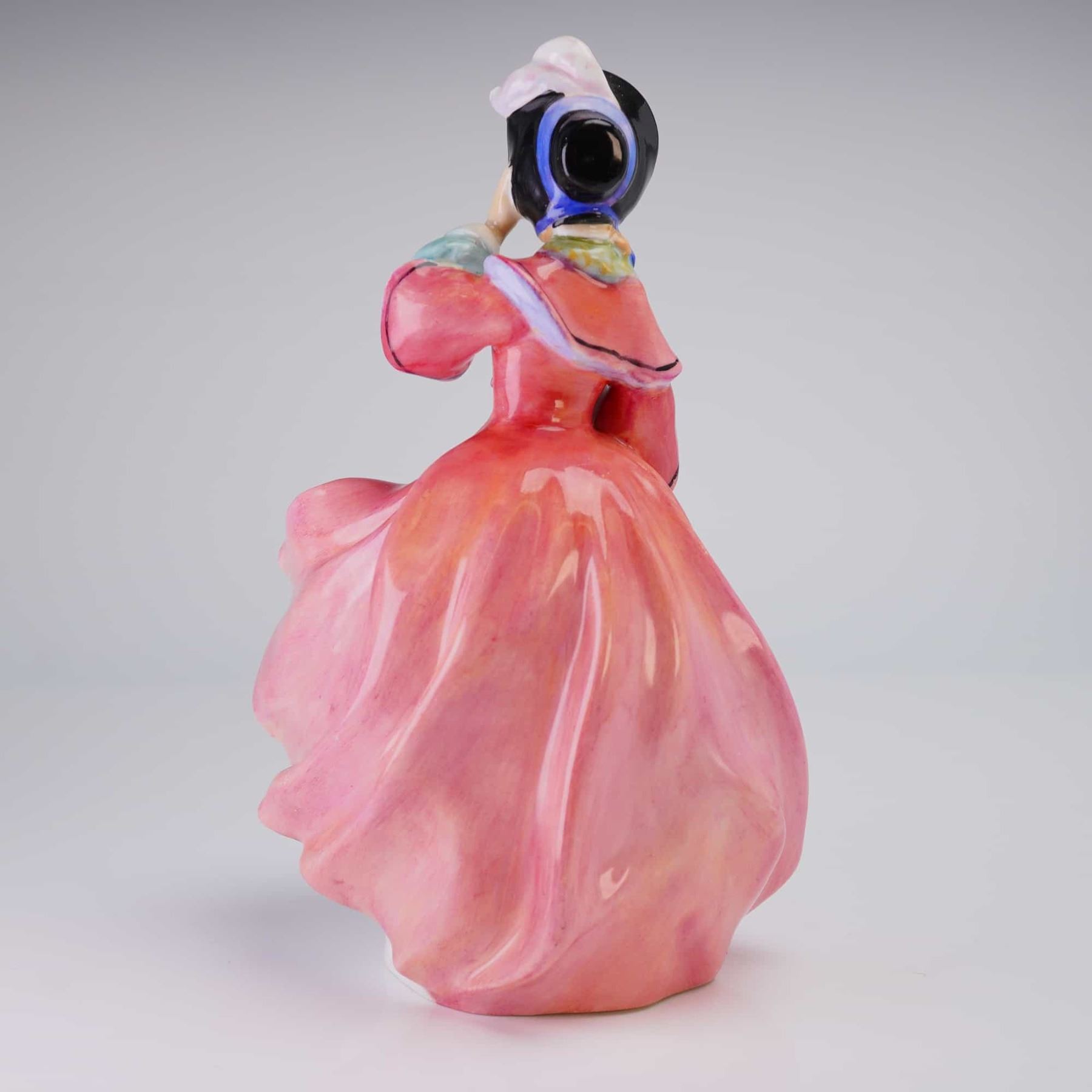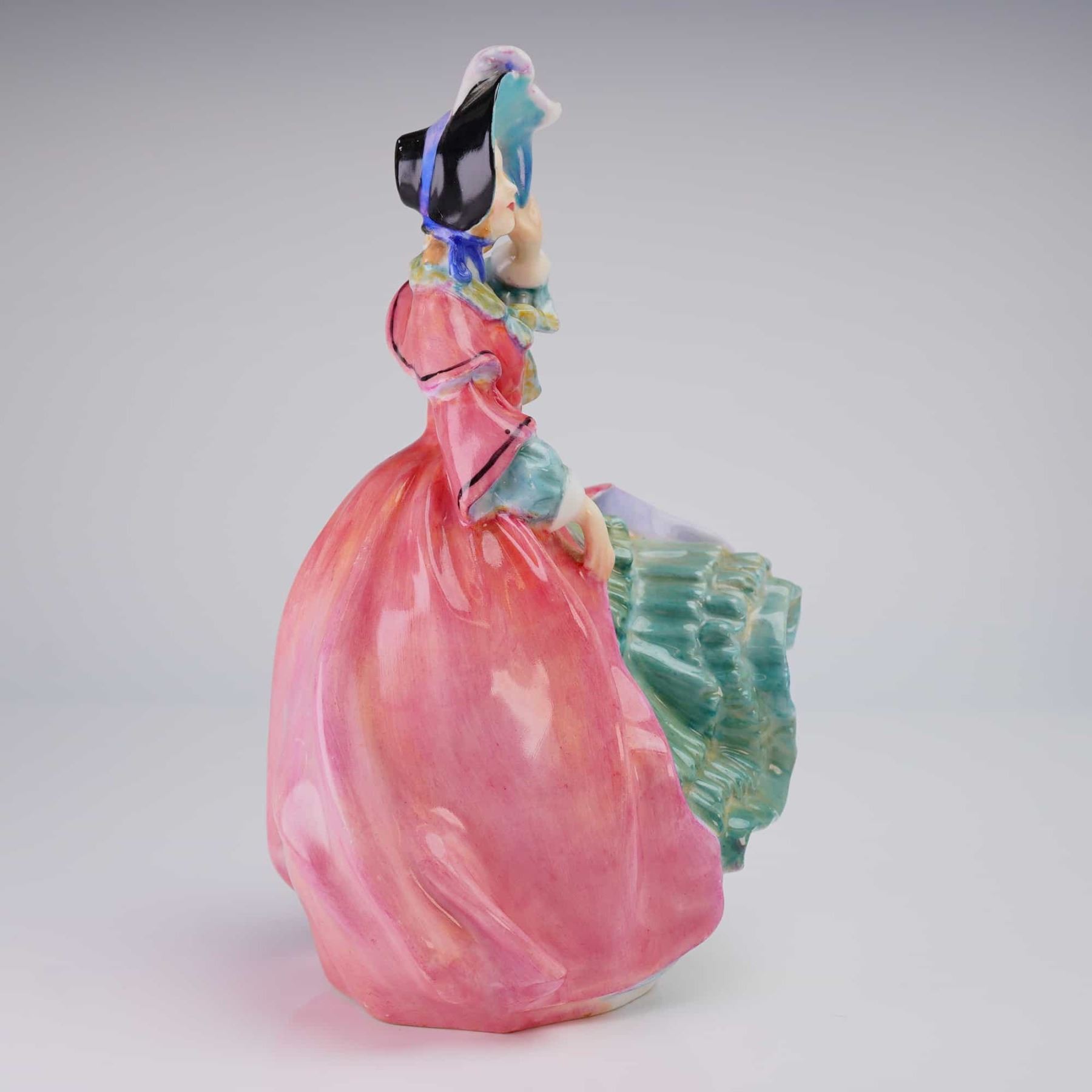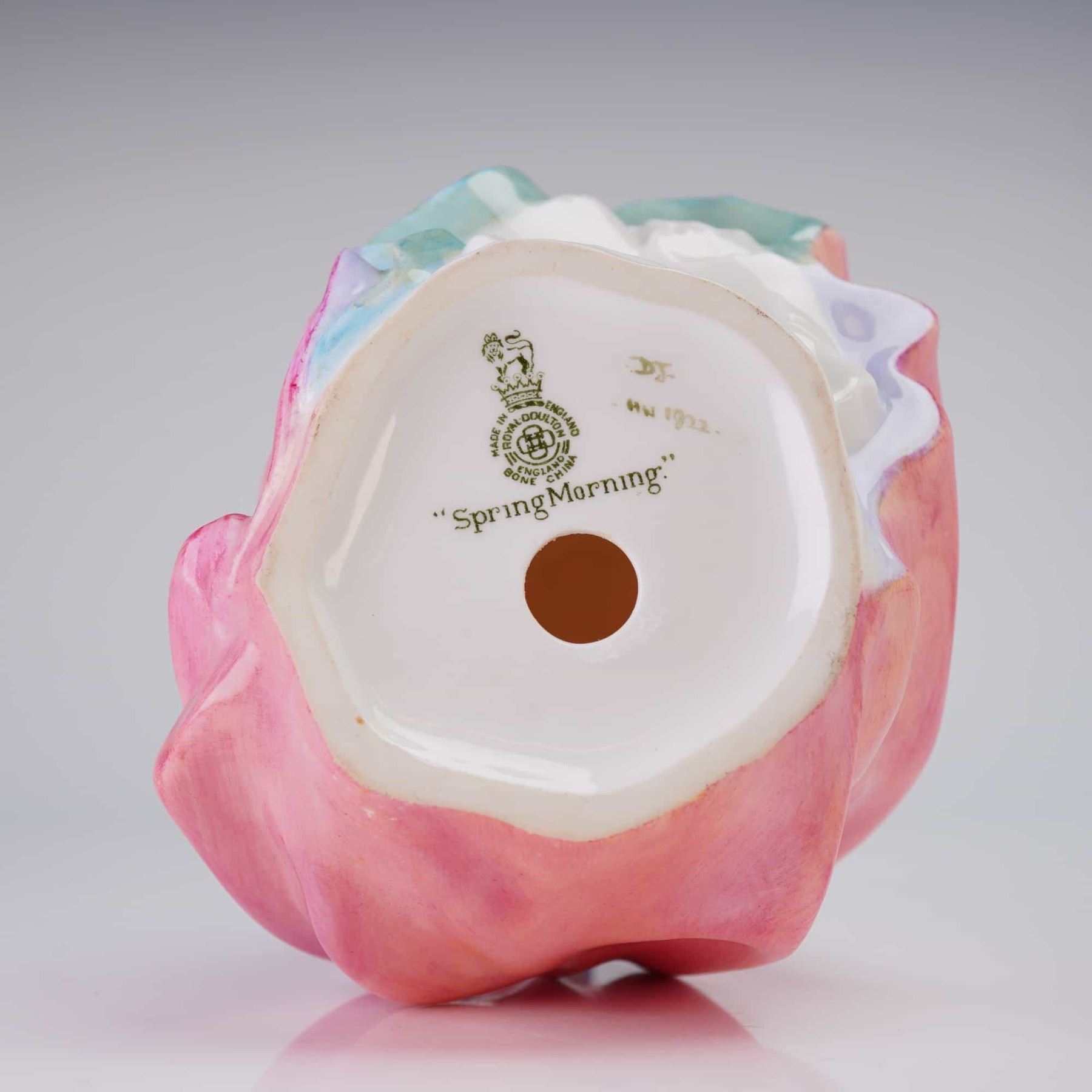 Royal Doulton Bone China Figurine titled "Spring Morning" (HN1922), depicting a woman in historical pink, green, and blue attire, marked "MADE IN ENGLAND."